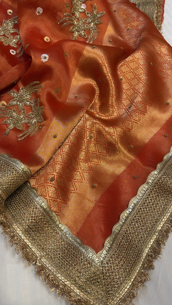 Satin tissue silk molten gold-silver hand embroidered banarasi saree Satin tissue silk molten gold-silver hand embroidered banarasi saree