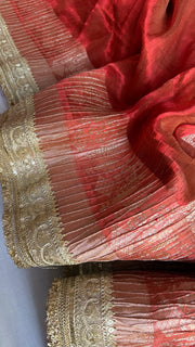 Metallic deep orange dhup chao effect pleated maharani tissue saree