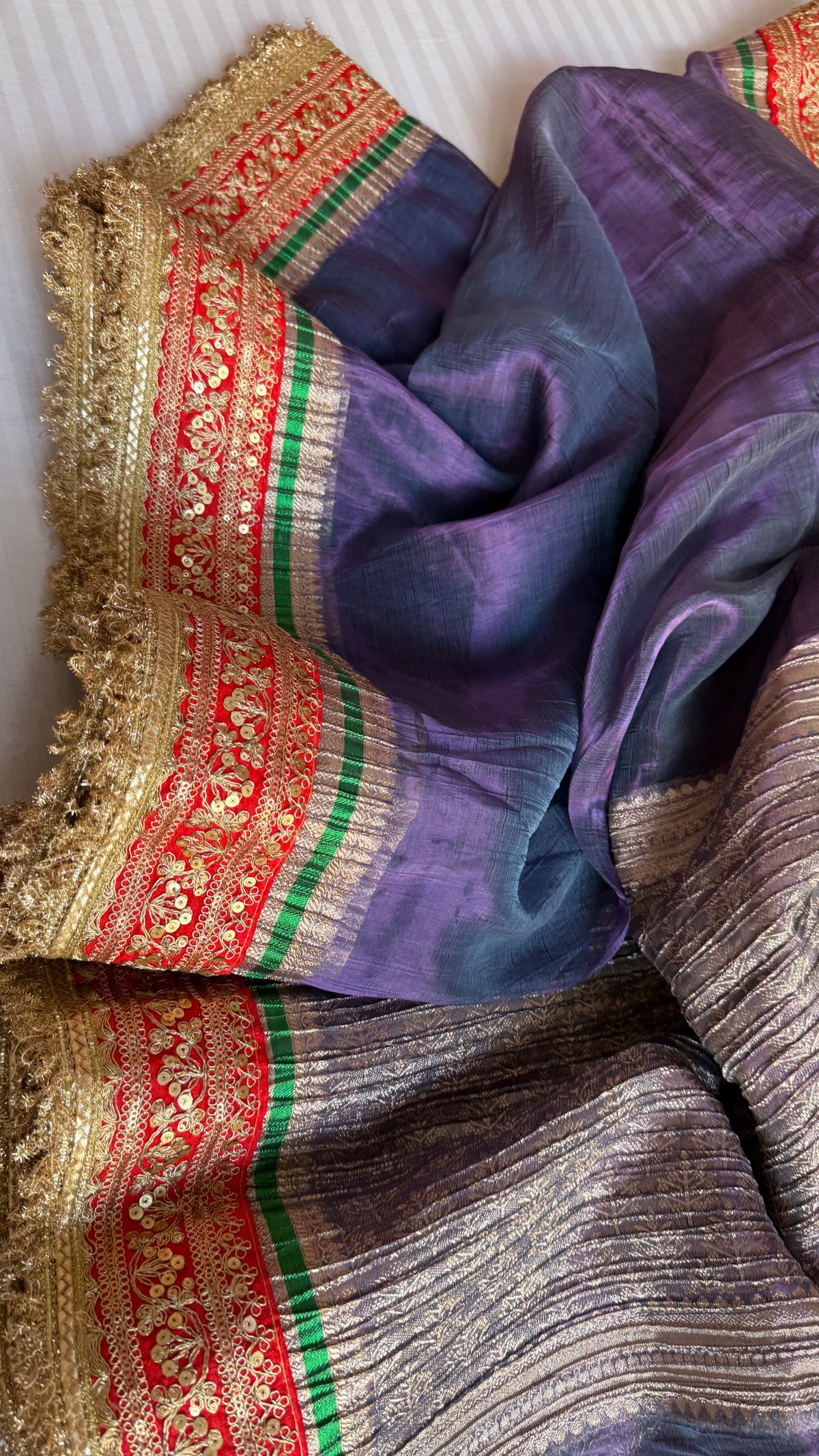 Midnight blueish-purple dhup chao effect pleated maharani tissue silk saree
