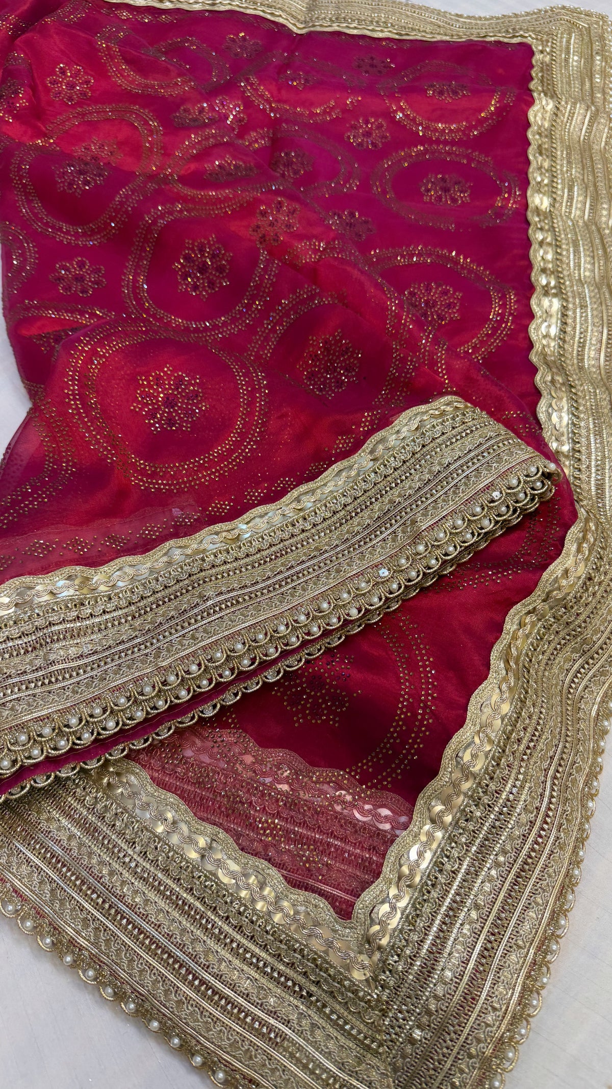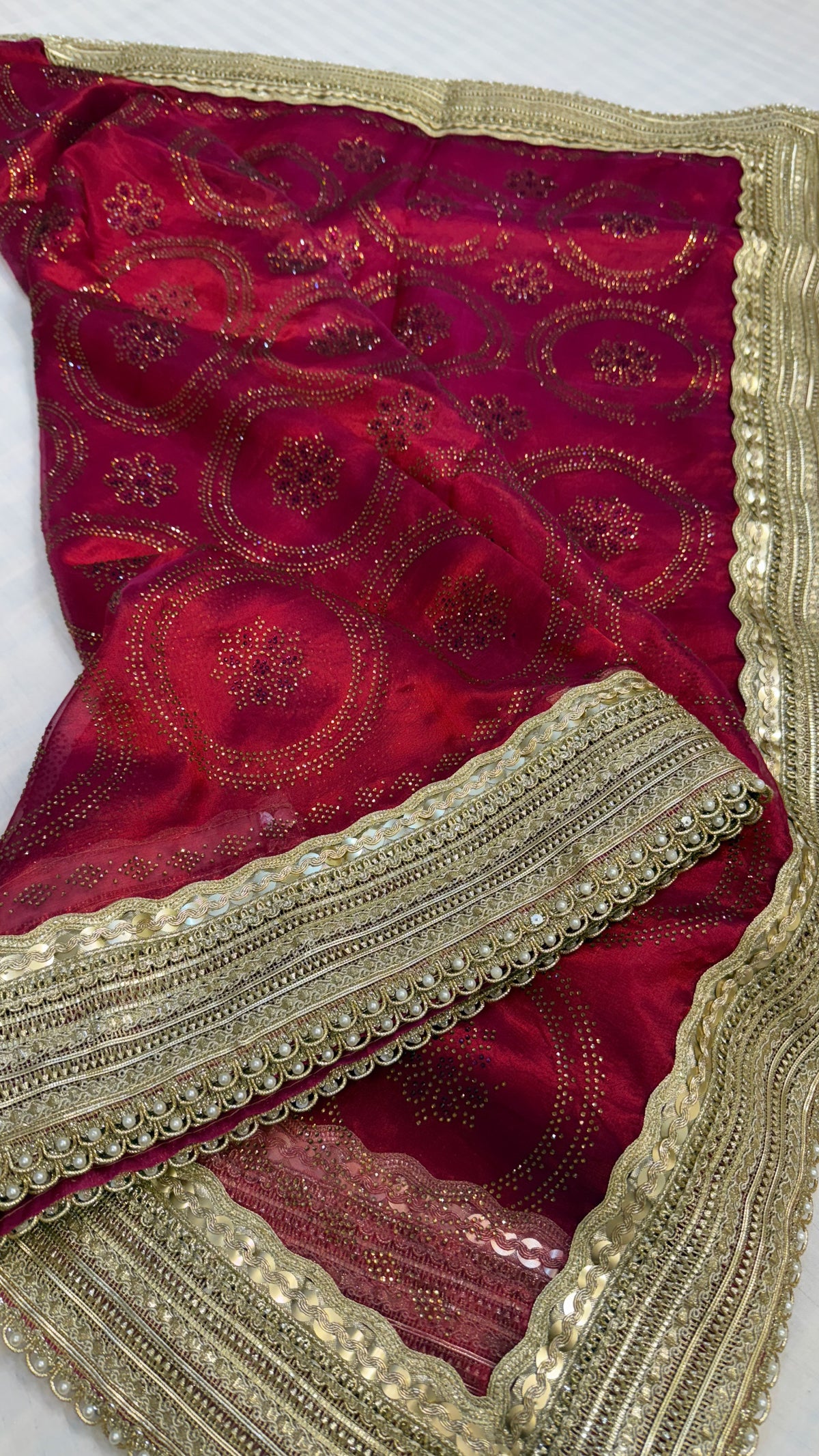 Sitara stonework cranberry red tissue silk gotapatti saree
