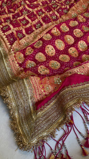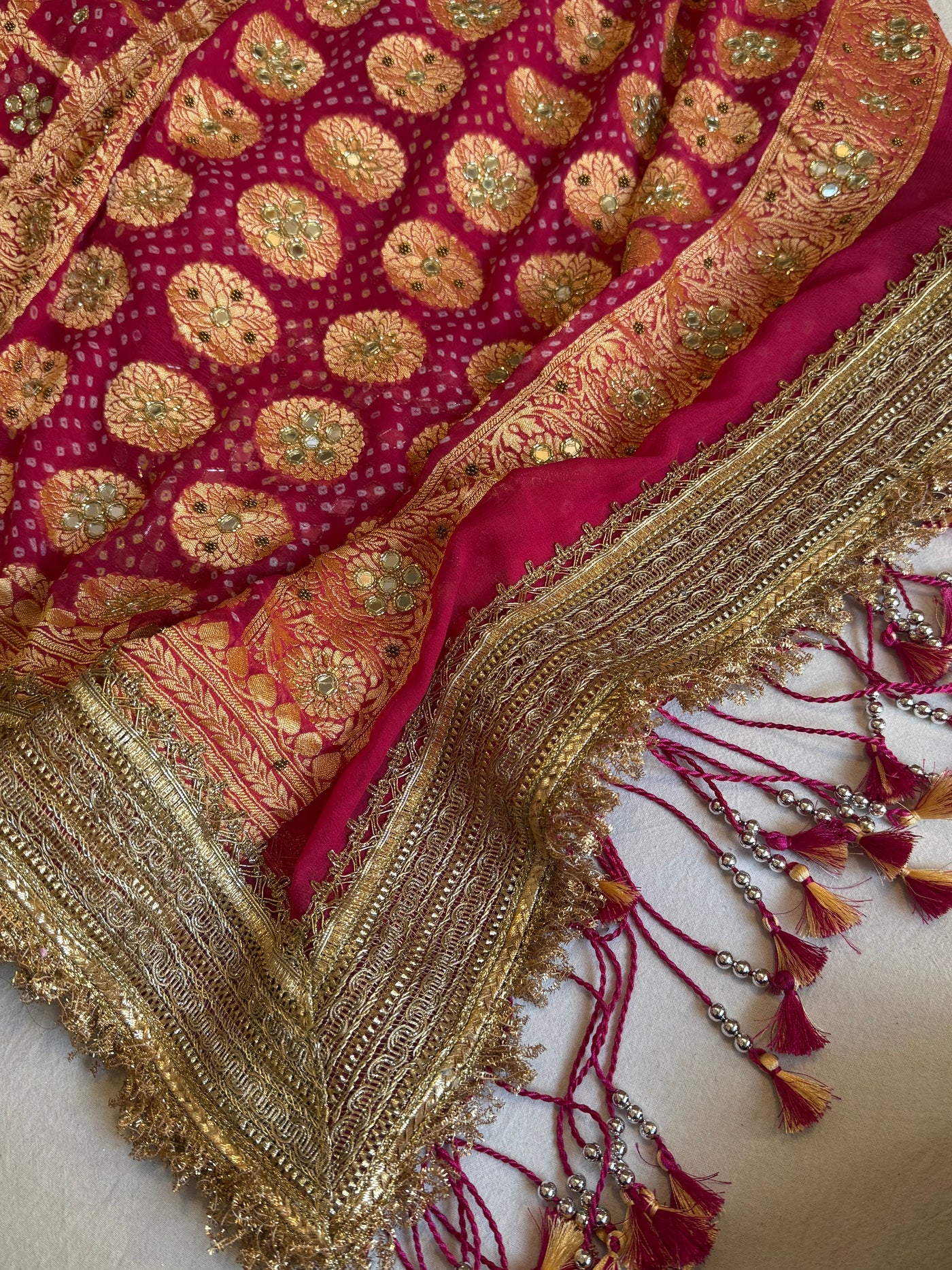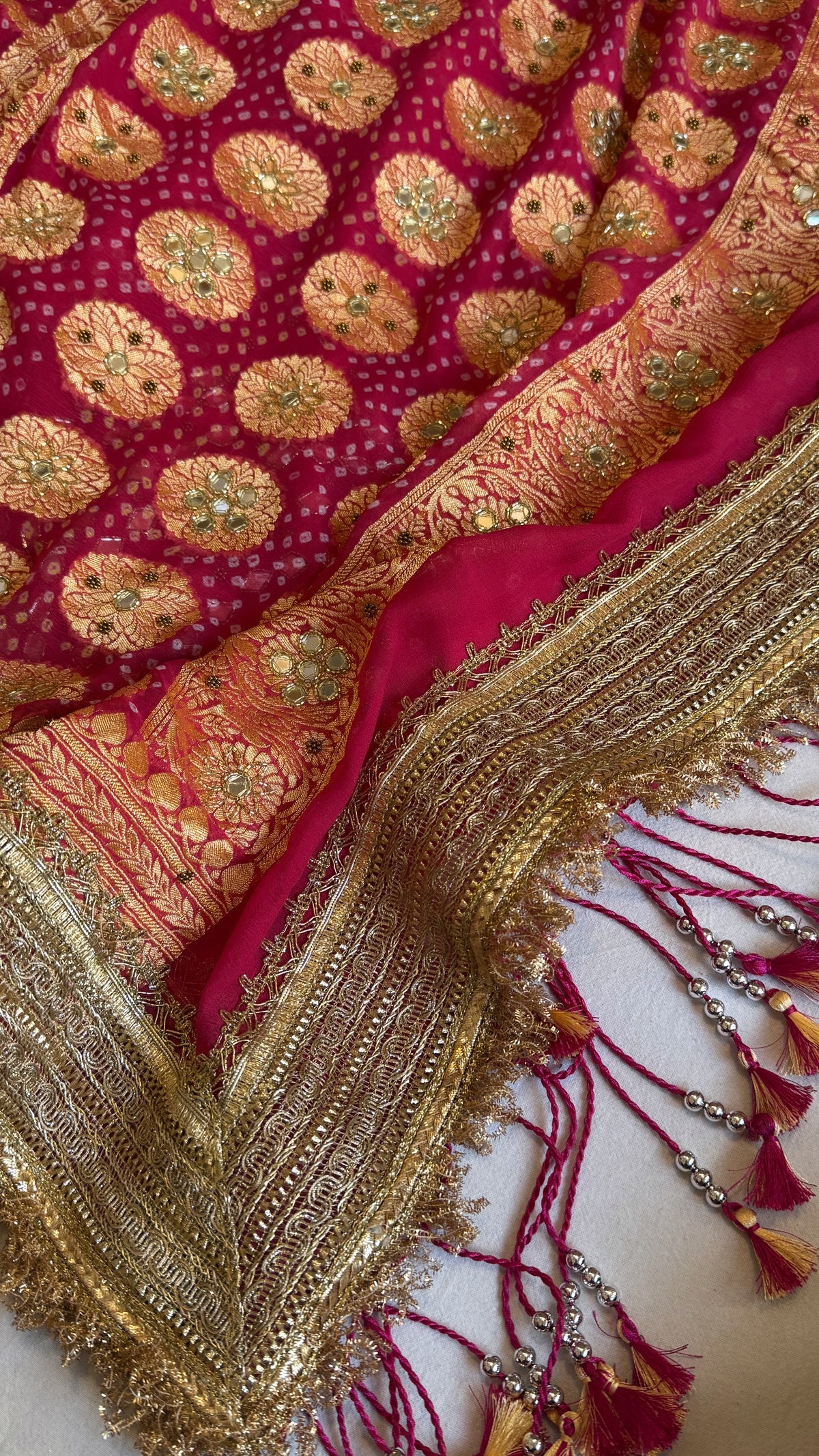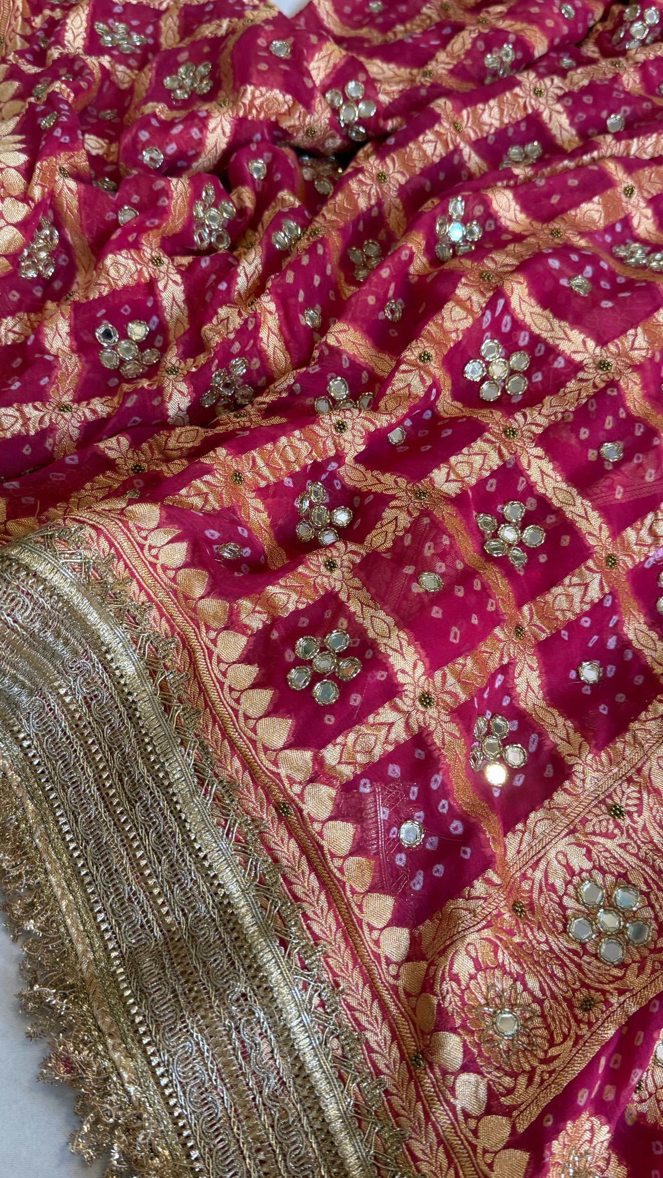 Cherry pink rai bandhej mirror work banarasi gorgette saree with long latkans