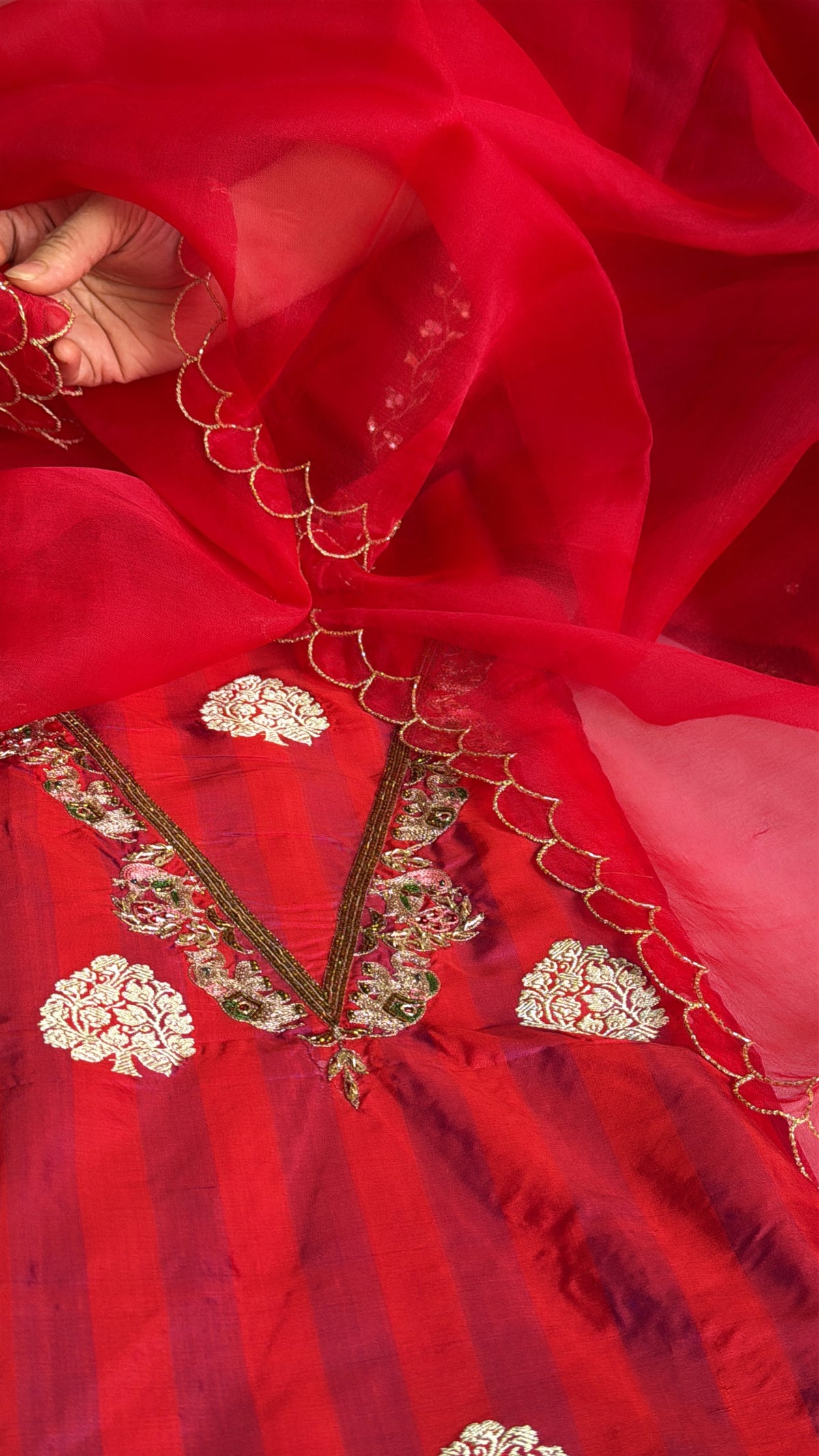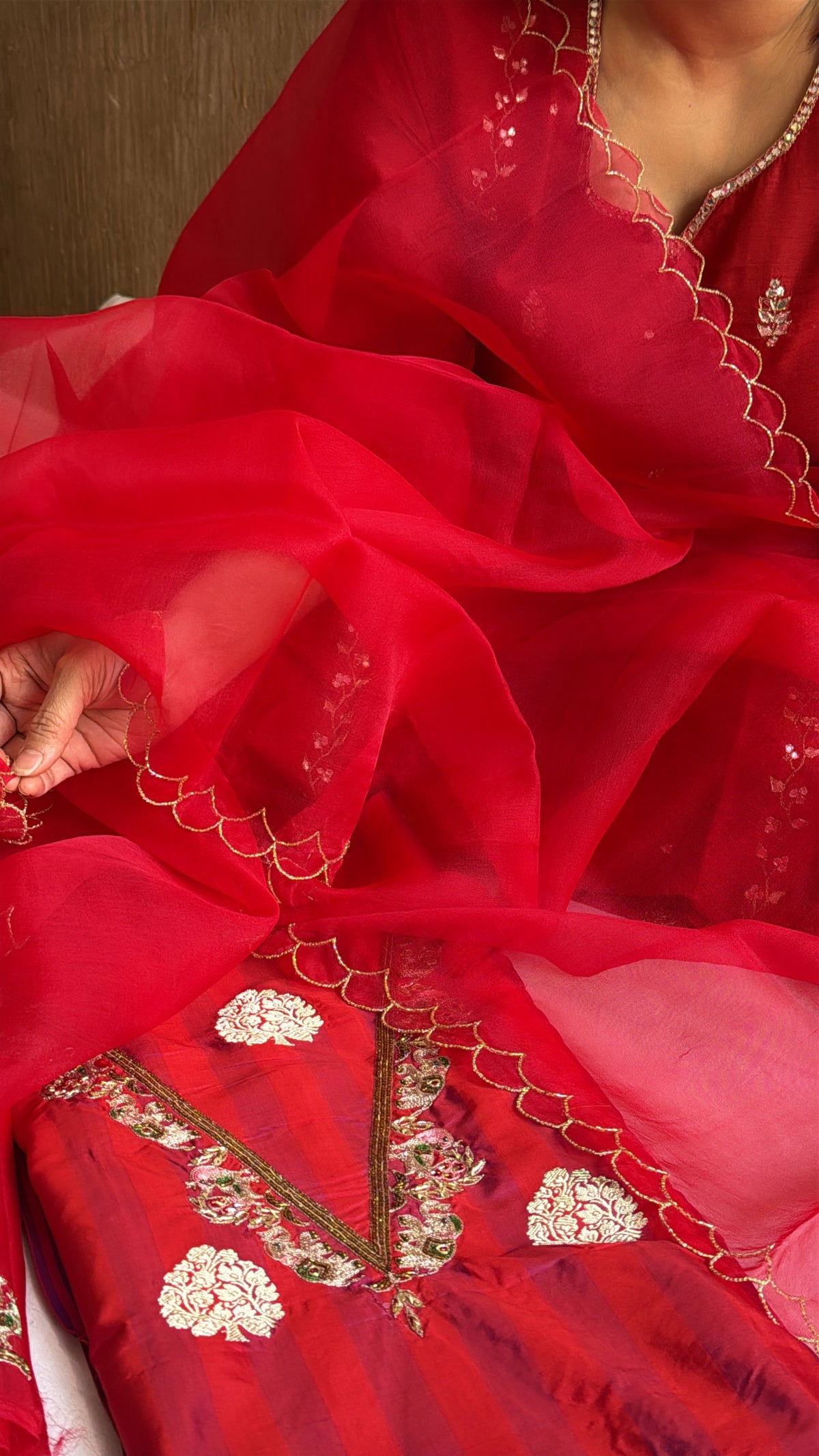 Blood red-cherry red dhup chao effect katan silk striped kurta paired with Kora silk scalloped duppata set