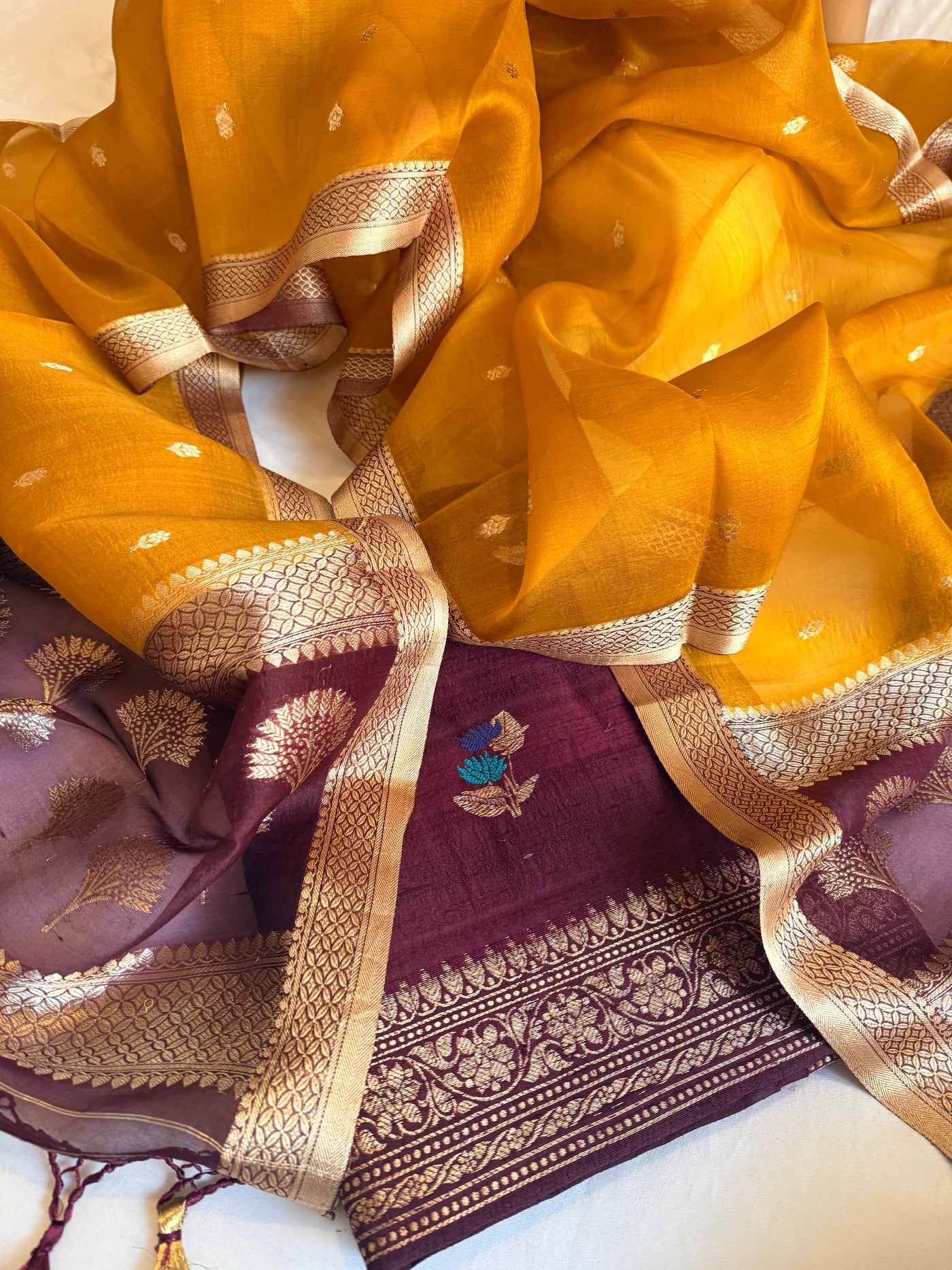 Deep plum-mustard yellow raw silk kadhwa kurta paired with kora silk chap dye duppata