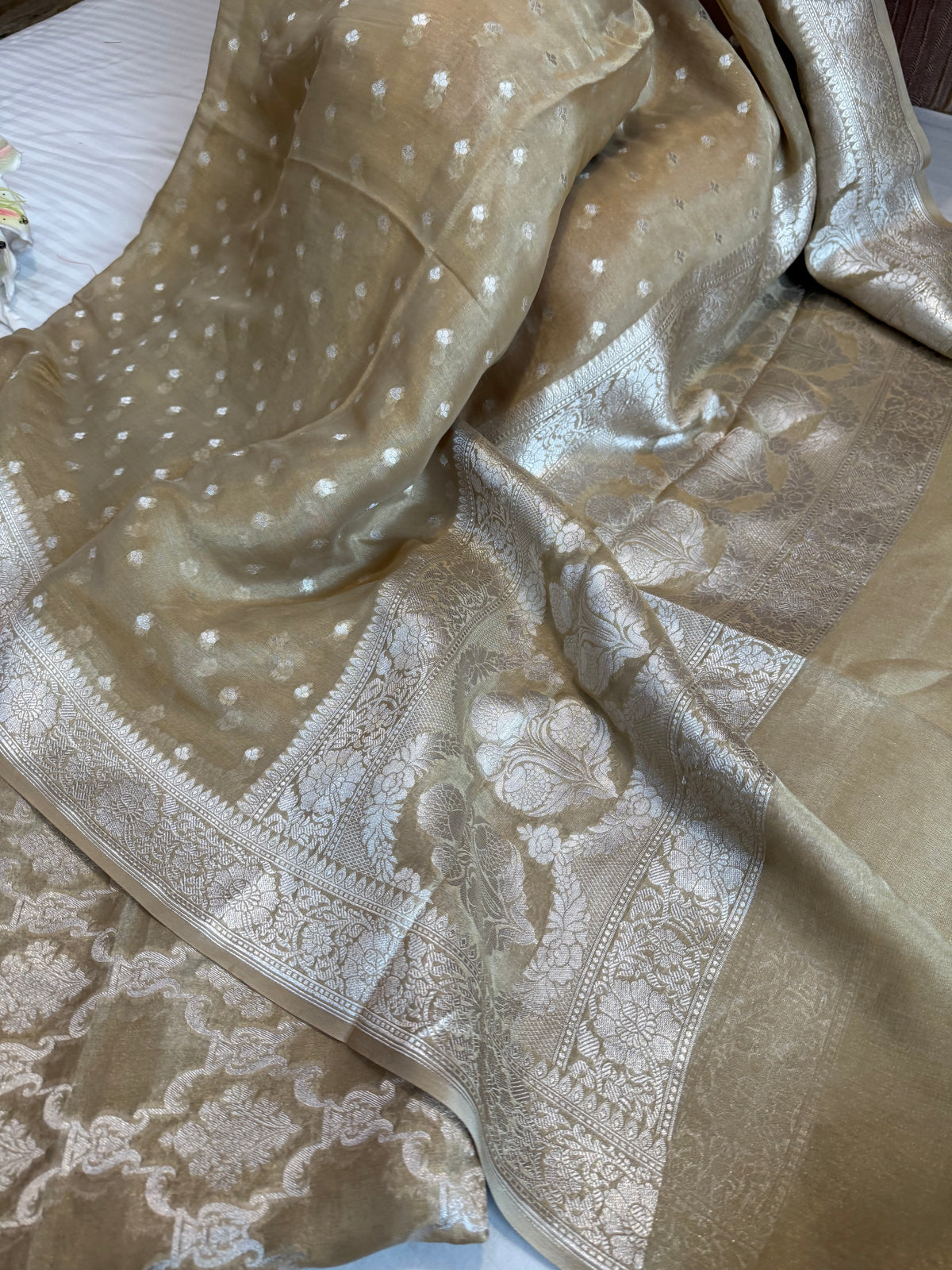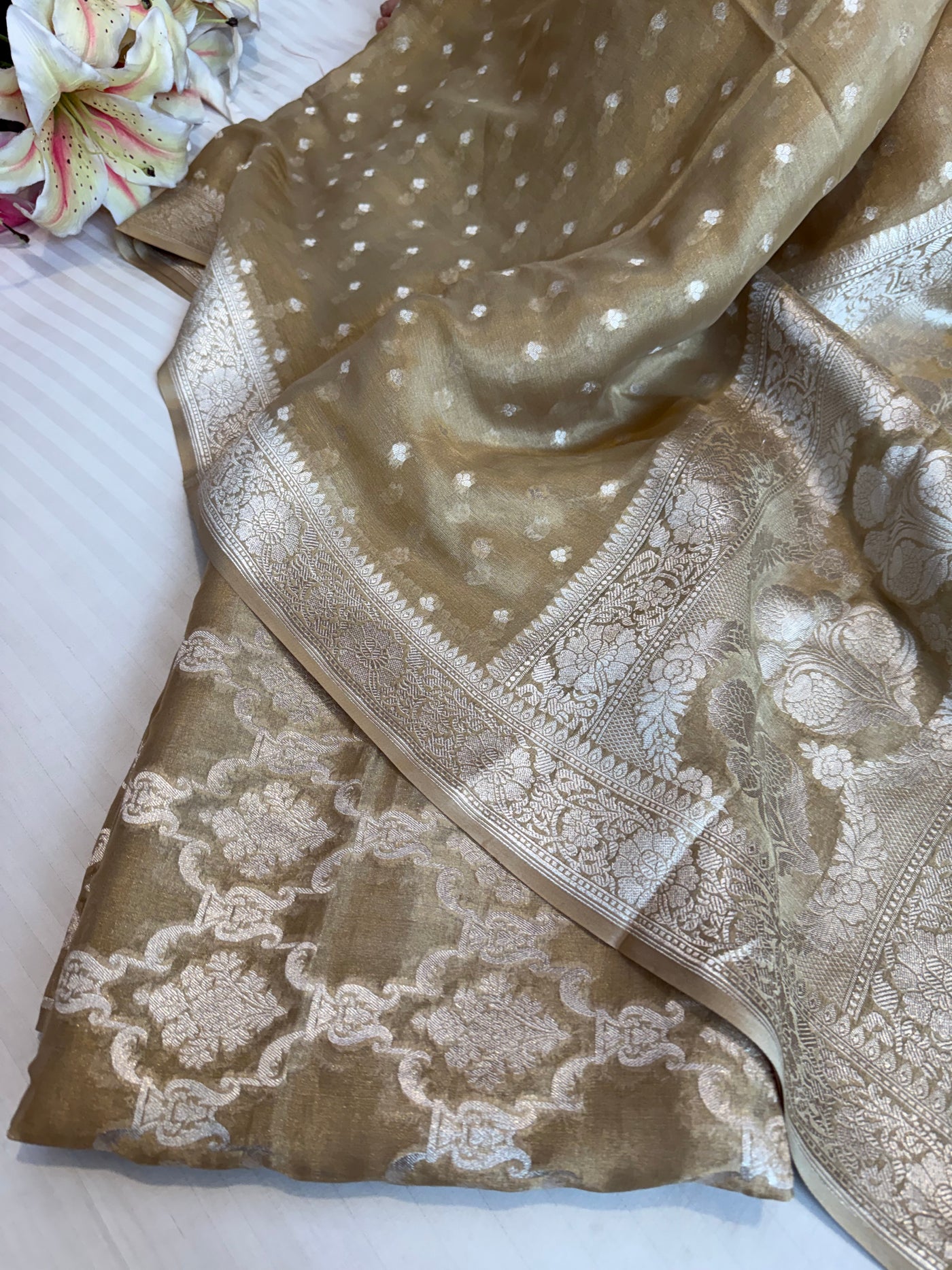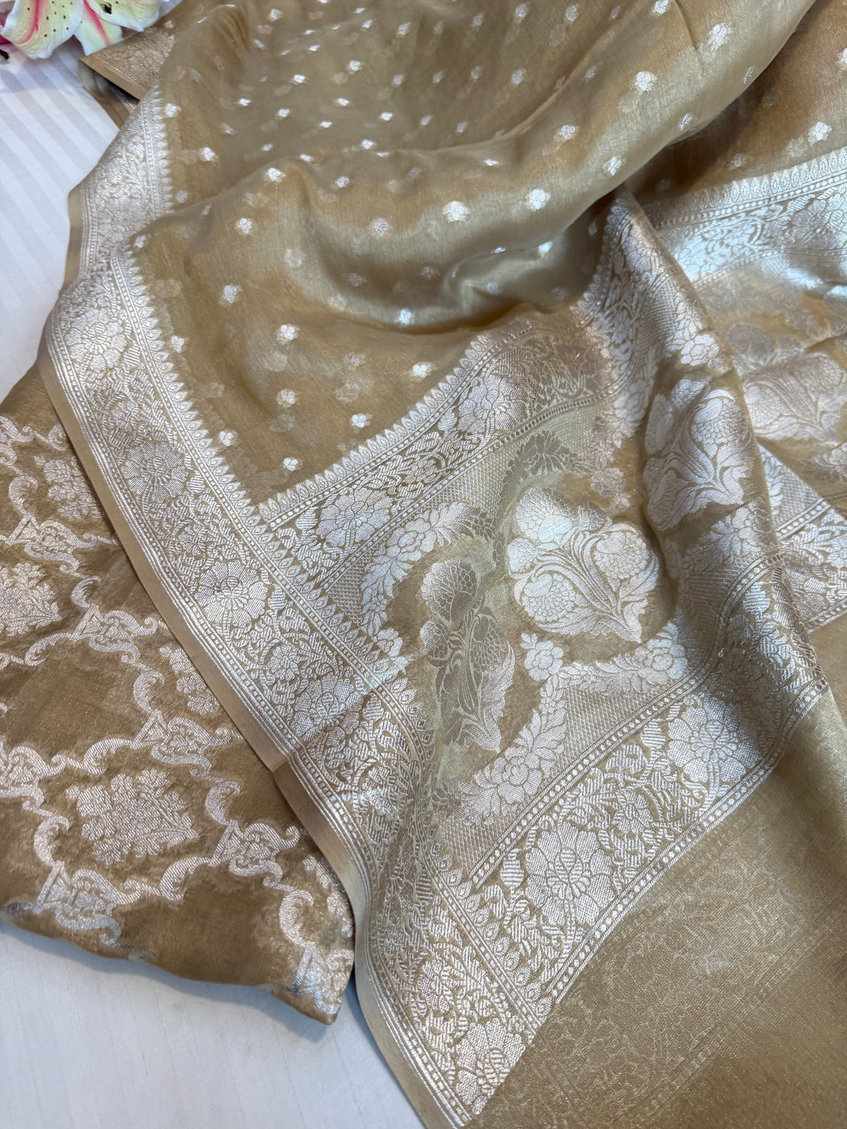 Dull golden-green banarasi tissue gorgette silver zari kadhwa suit set