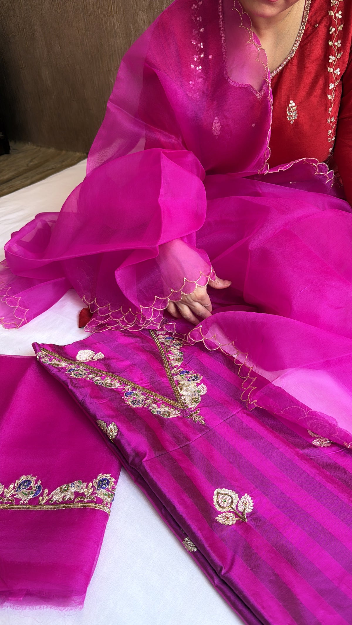 Hot pink-fuschia pink dhup chao effect katan silk striped kurta paired with Kora silk scalloped duppata set