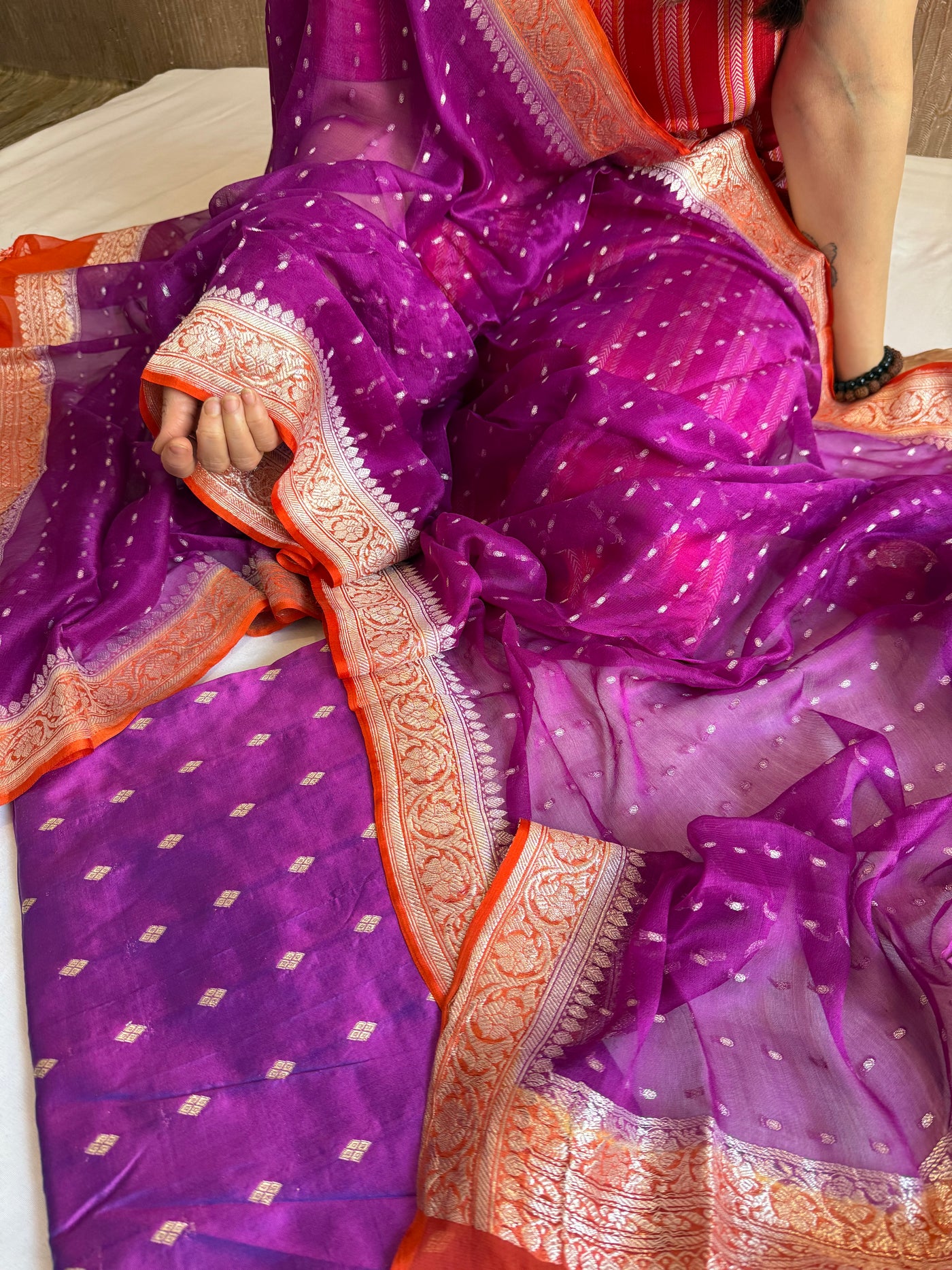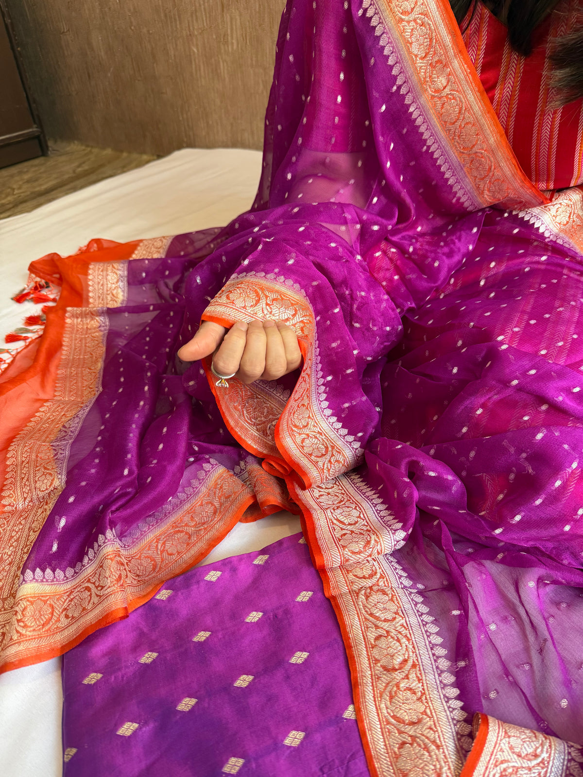Magenta purple-fanta orange katan silk kadhwa buti kurta paired with chiffon gorgette chap dye duppata set