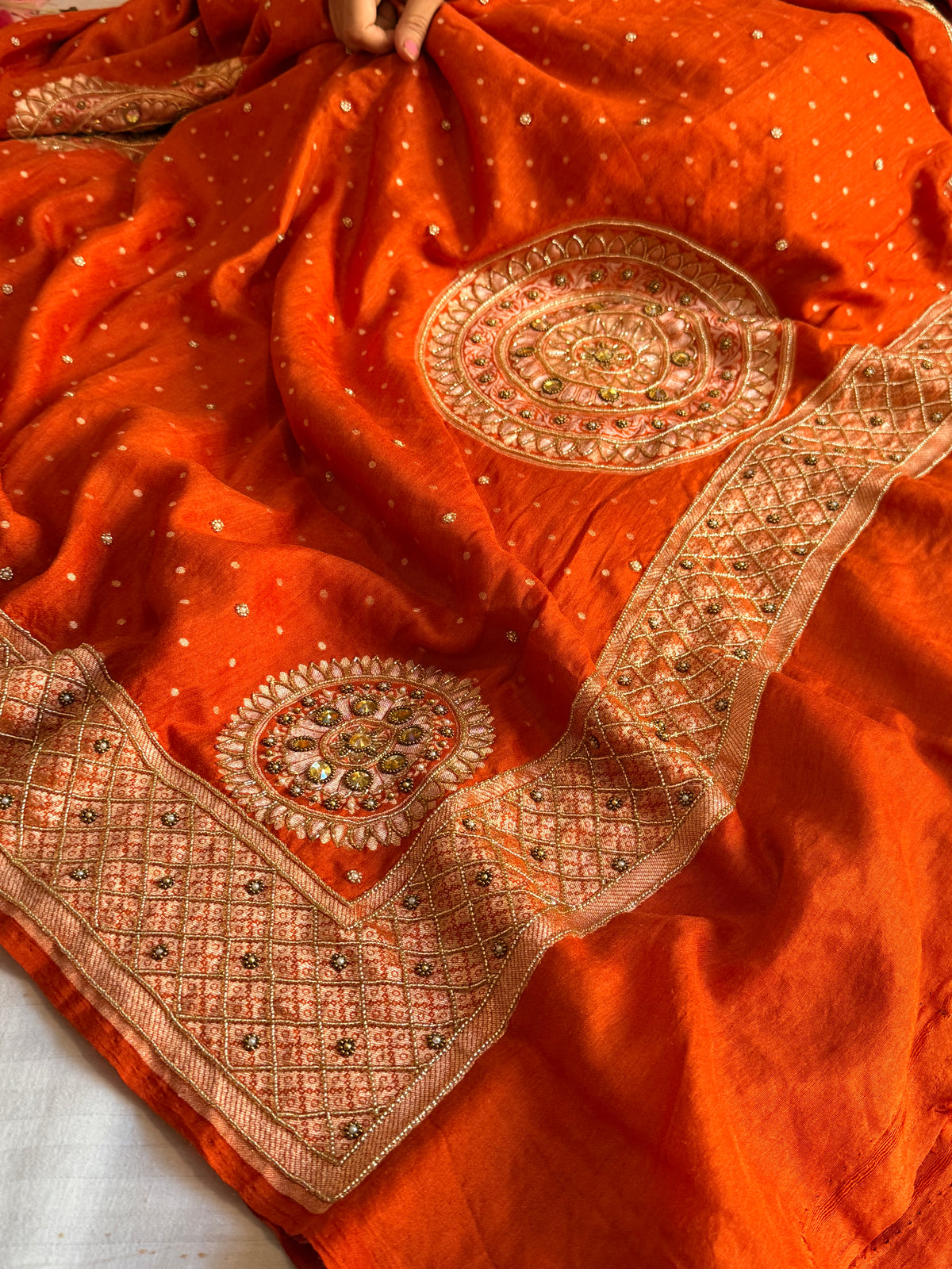 Banarasi fanta orange moonga silk hand embroidered kadhwa saree