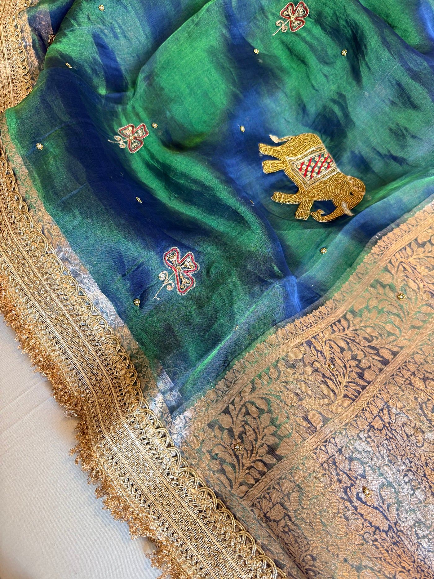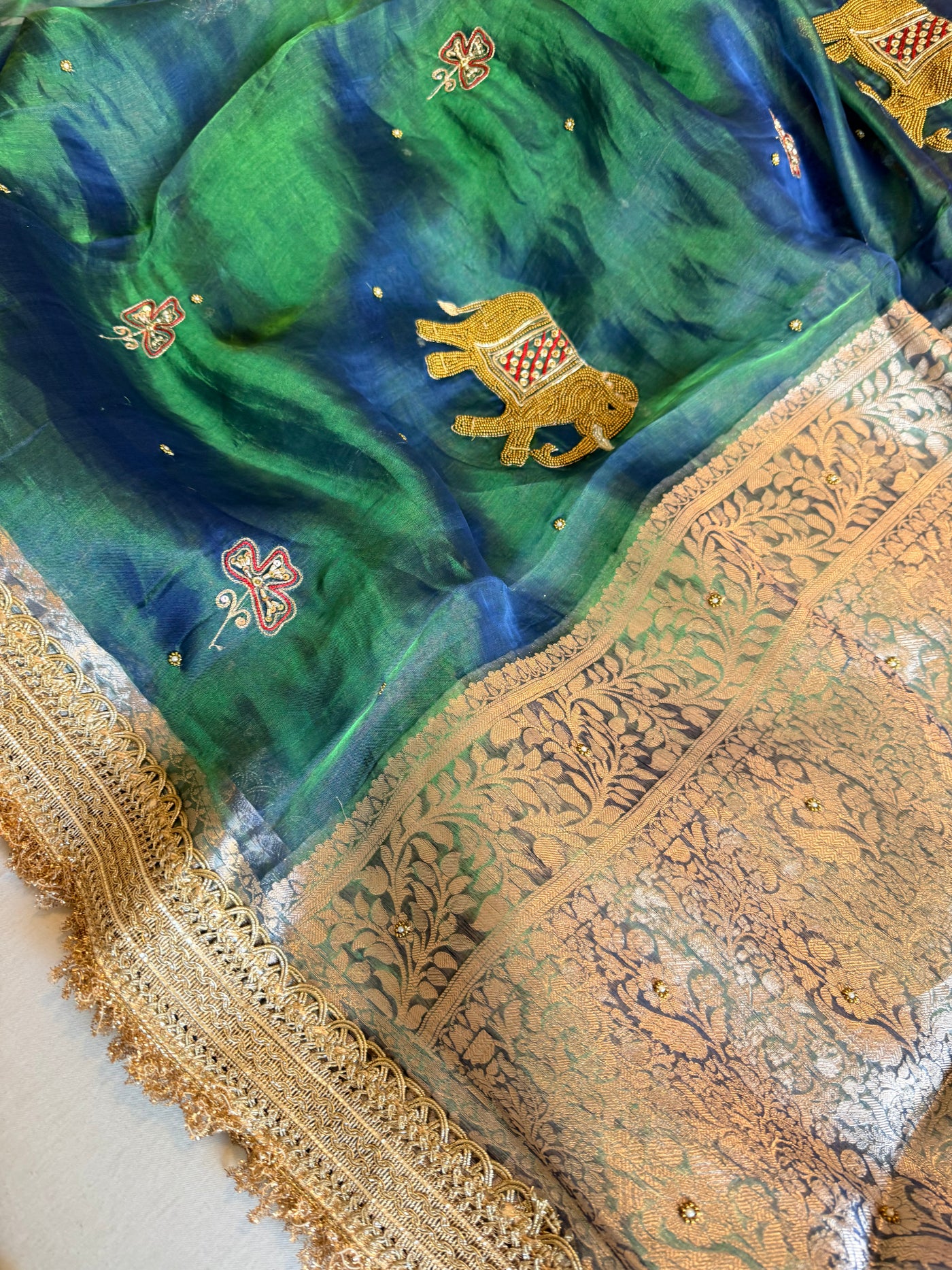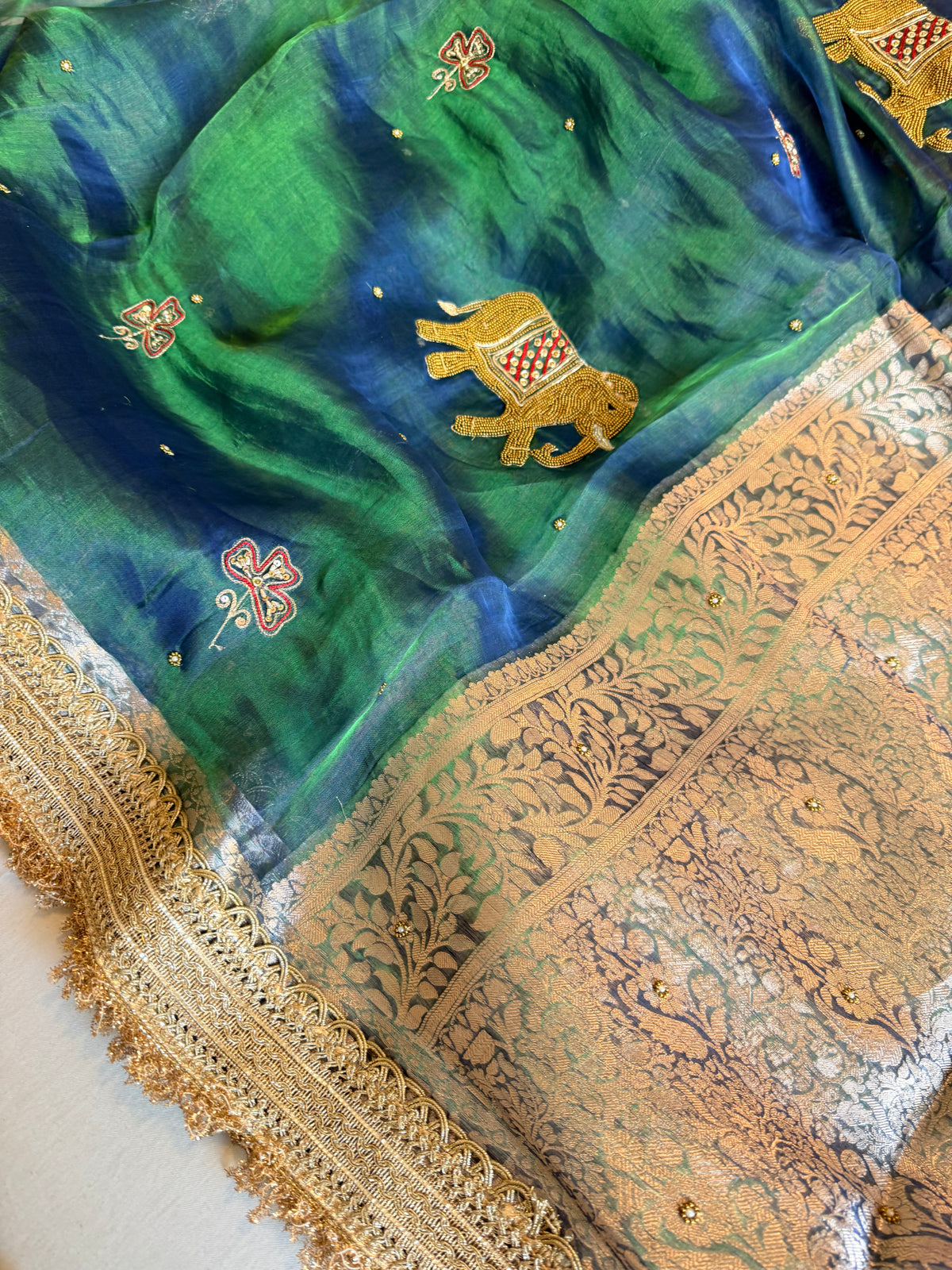 Elephant motif peacock blue dhup chao effect tissue silk hand embroidered saree