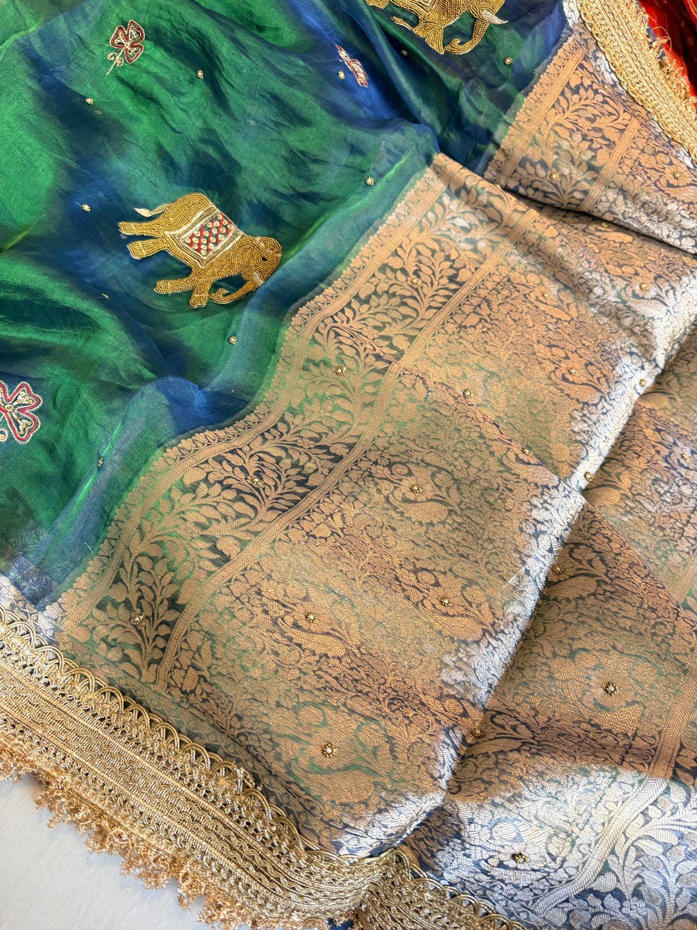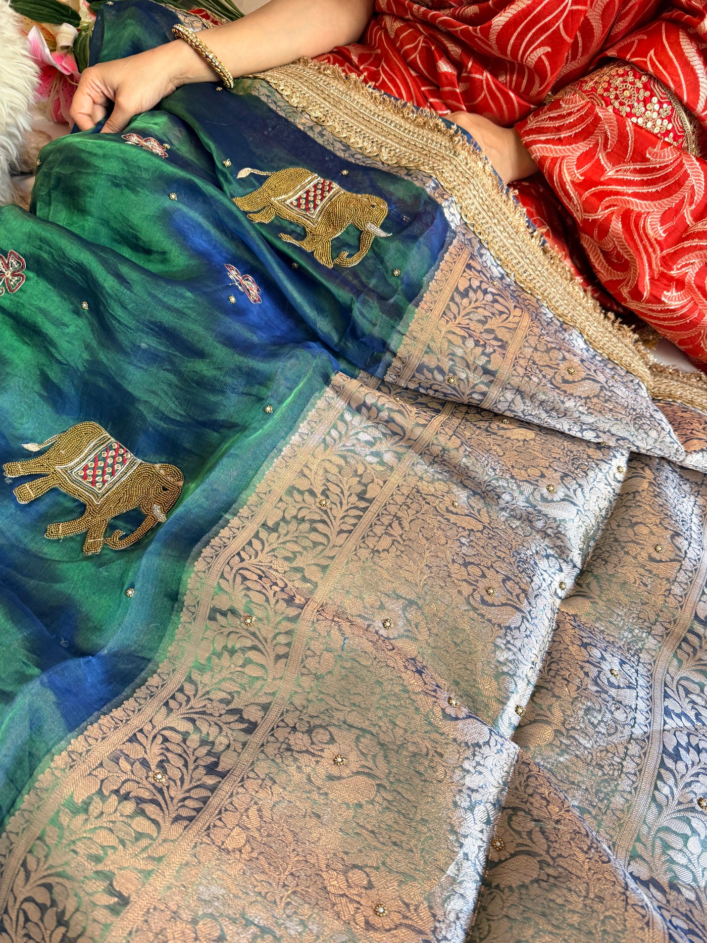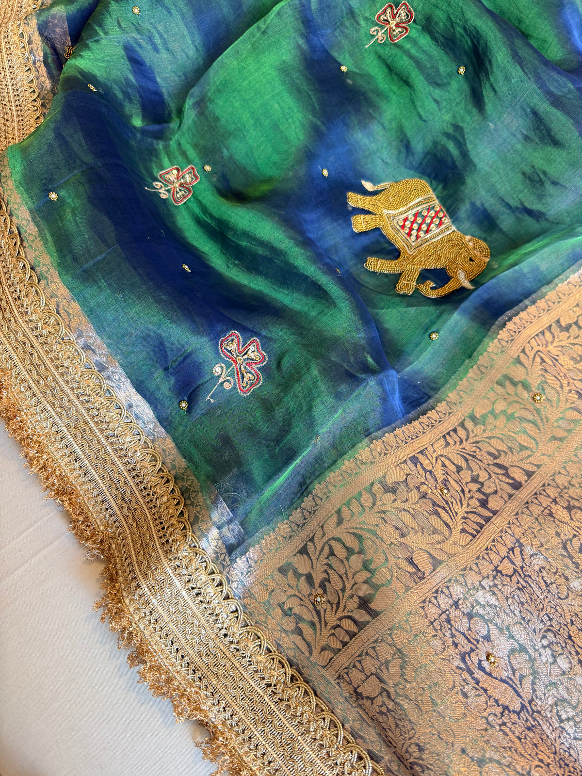 Elephant motif peacock blue dhup chao effect tissue silk hand embroidered saree
