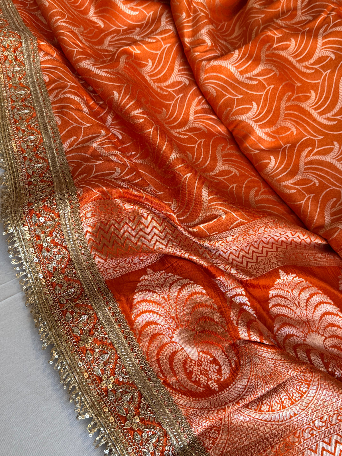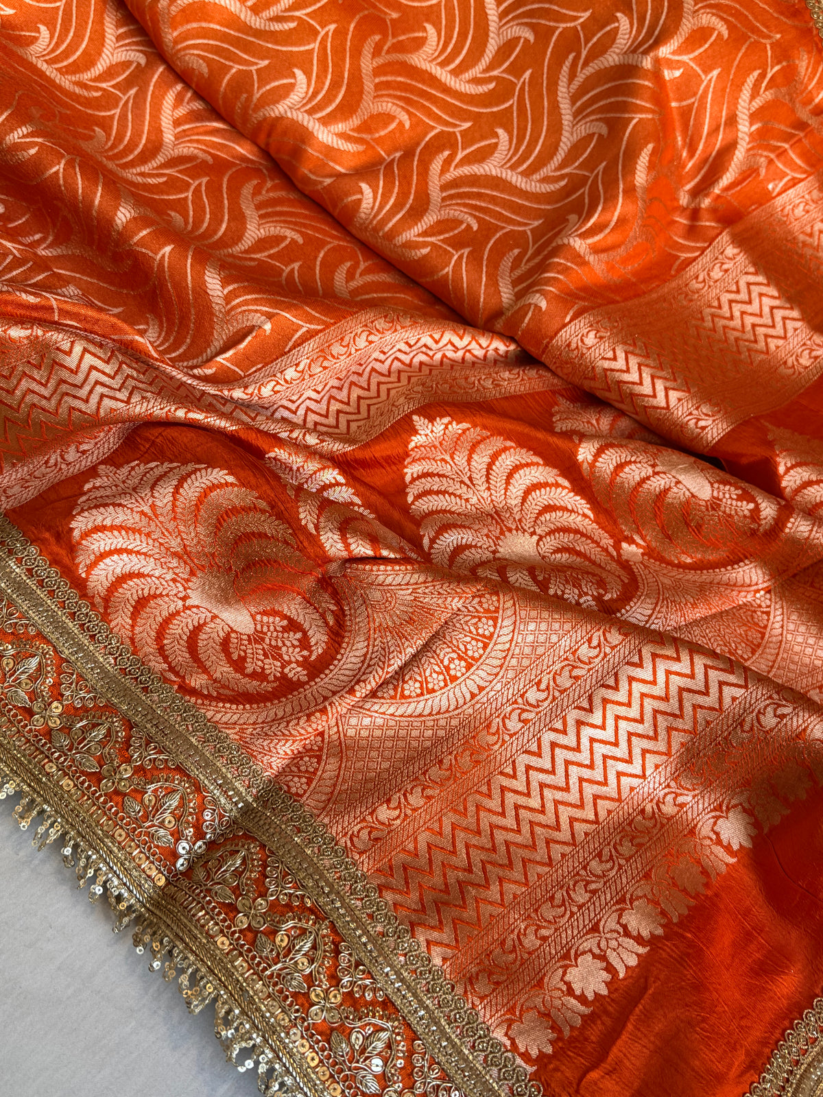 Fanta orange raw mango silk abstract weaving kadhwa saree