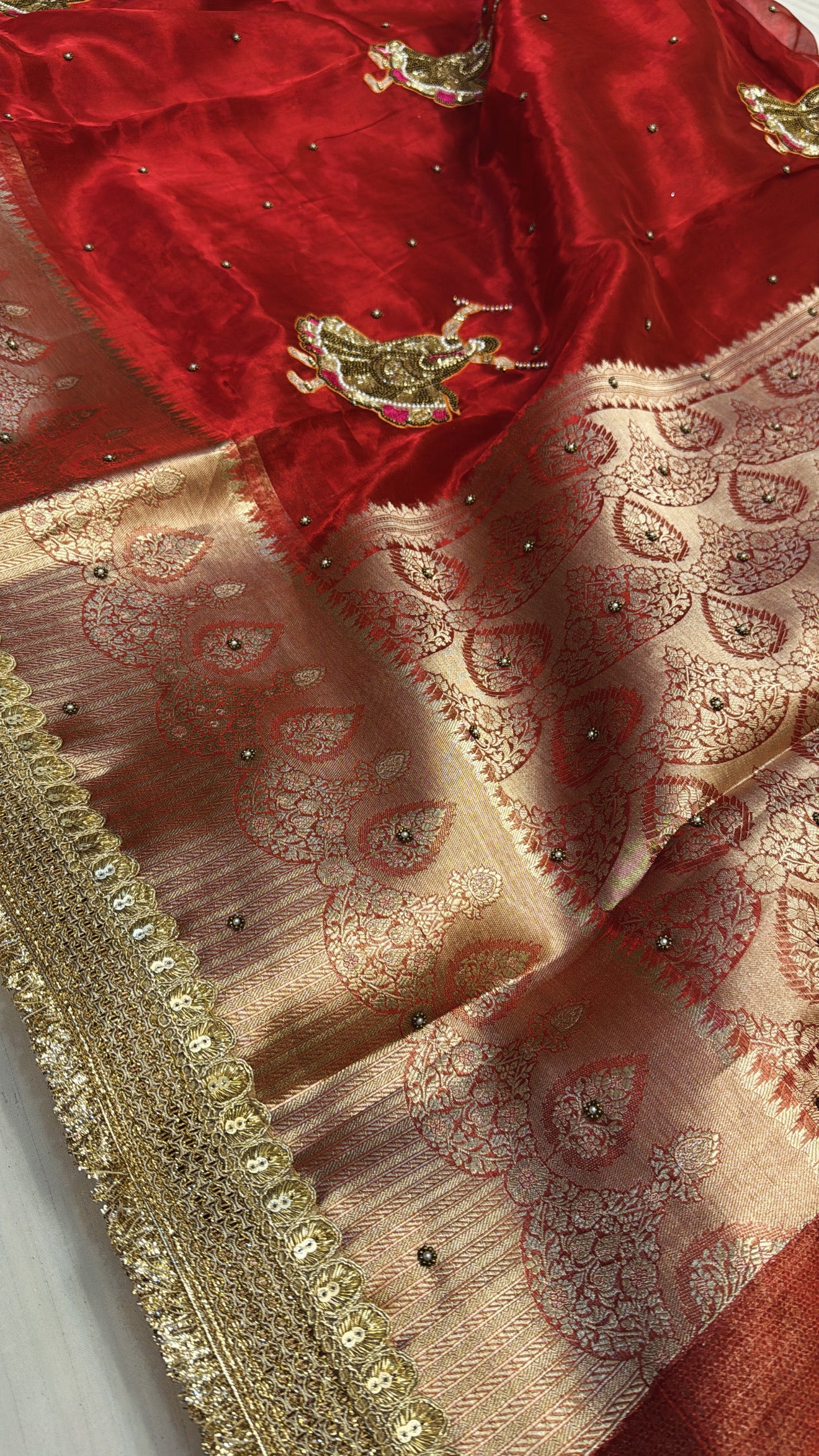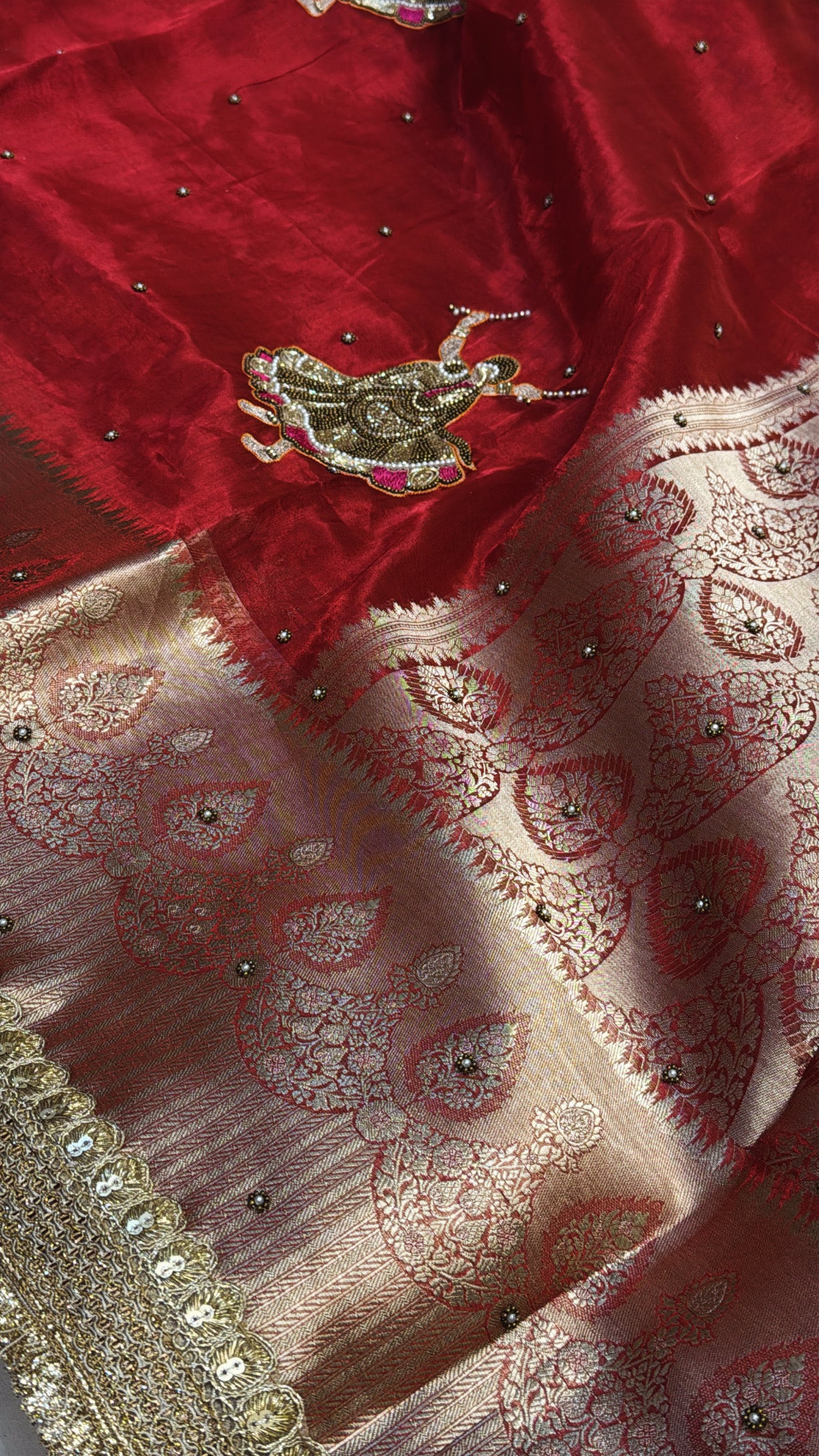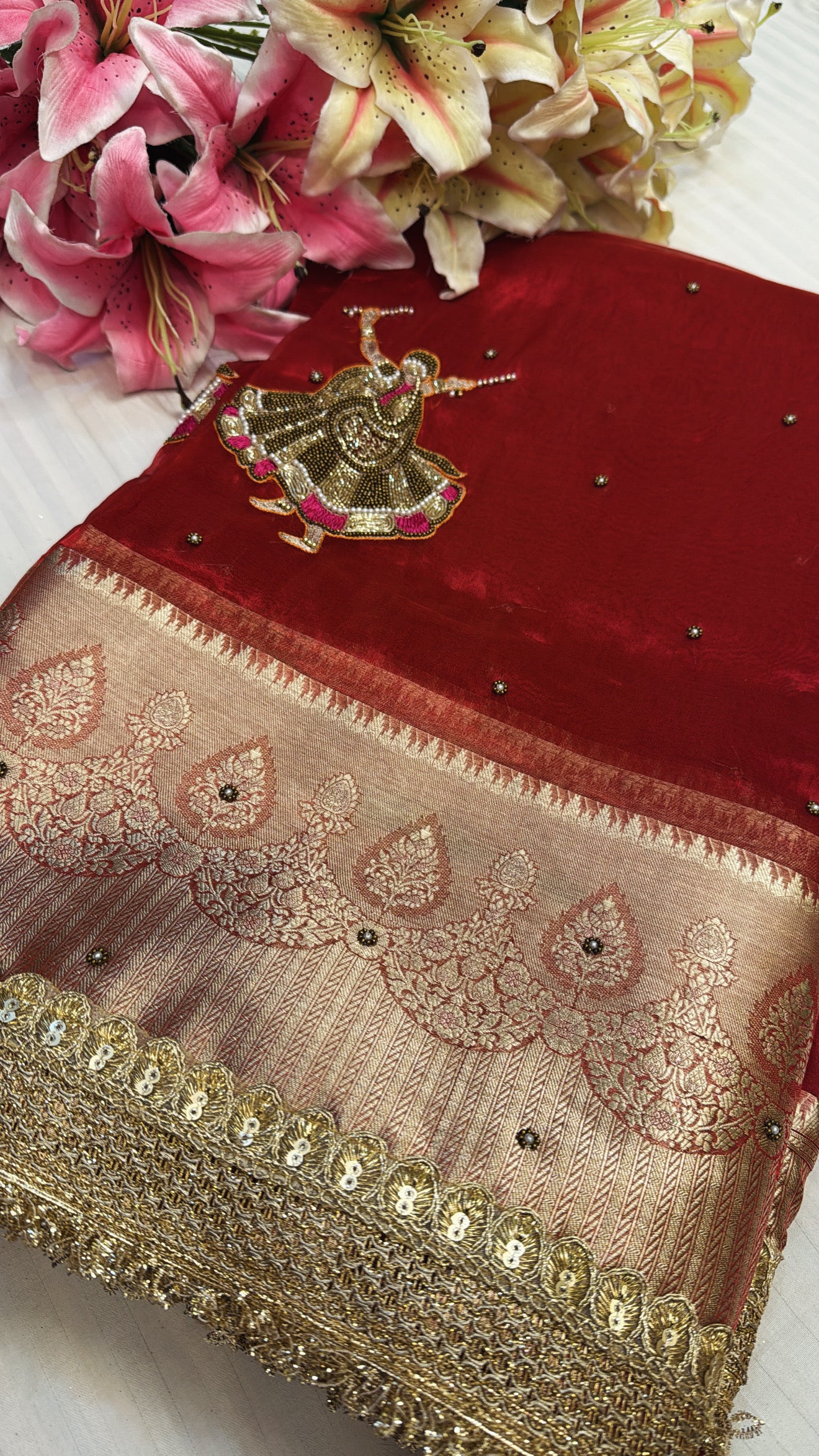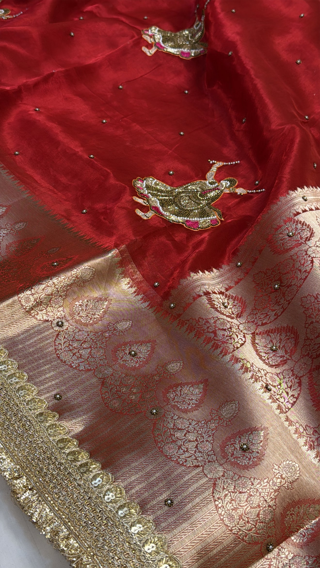 Red special - Husn chilly red garba rasleela motif tissue silk hand embroidered saree