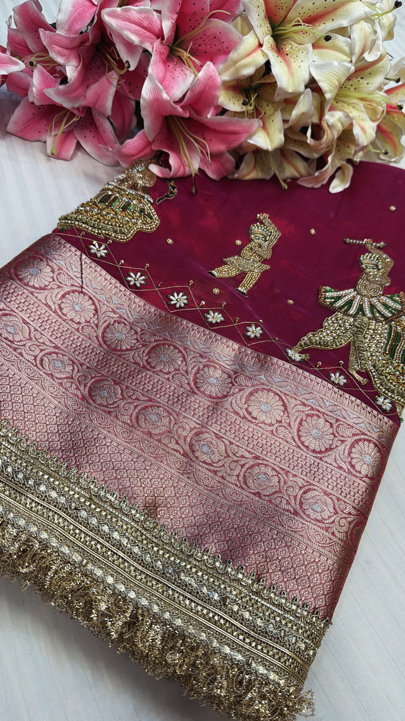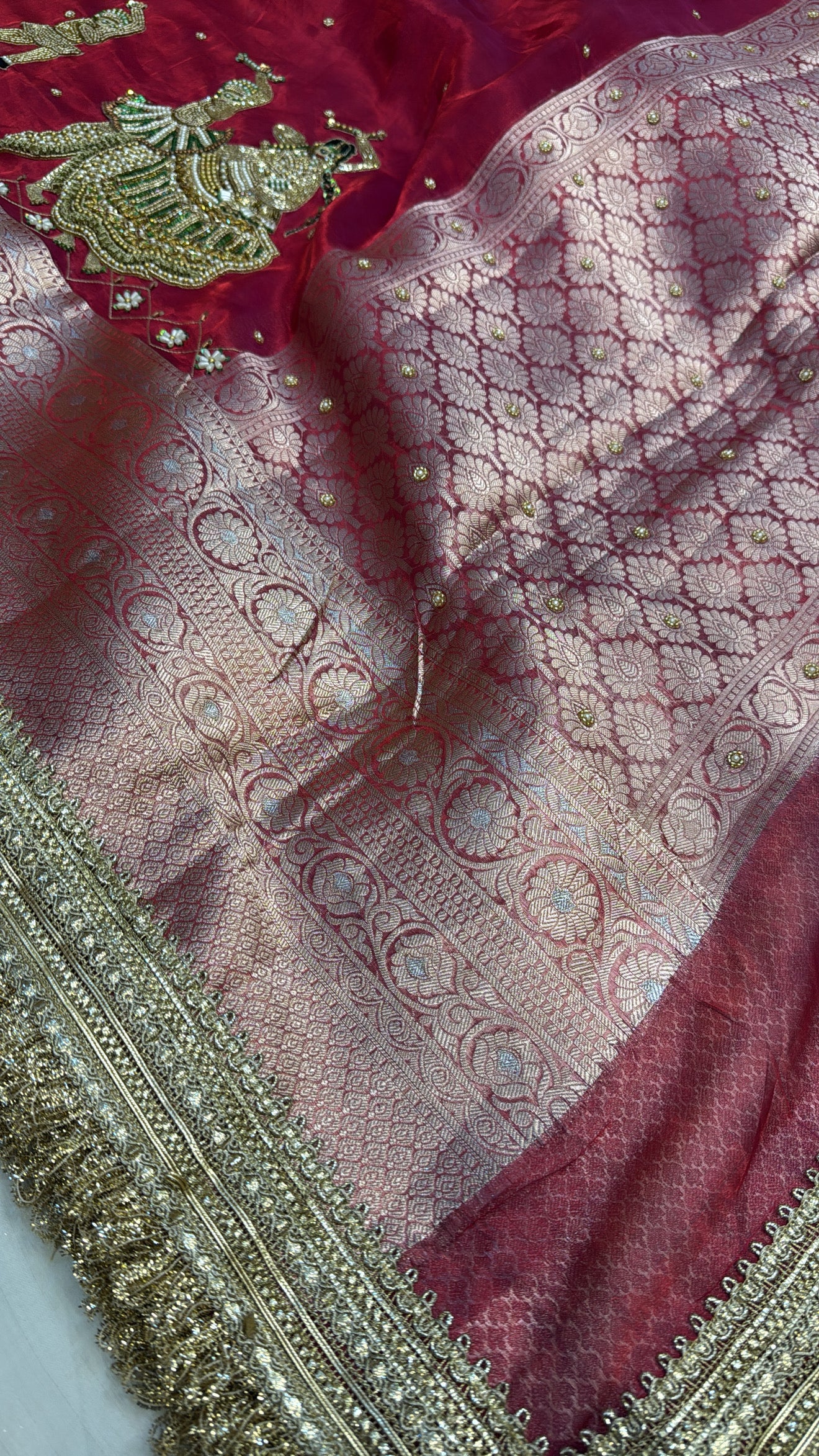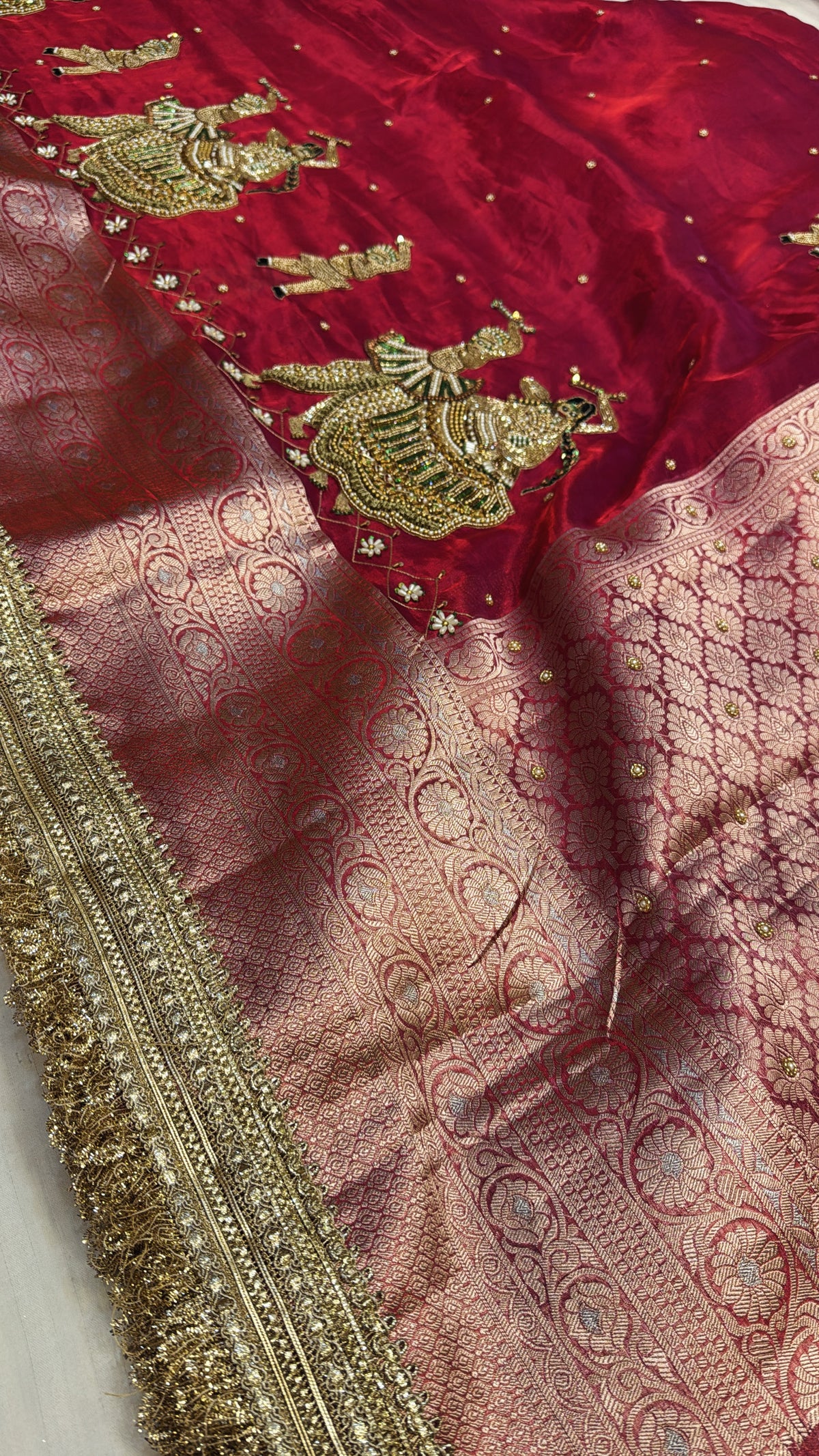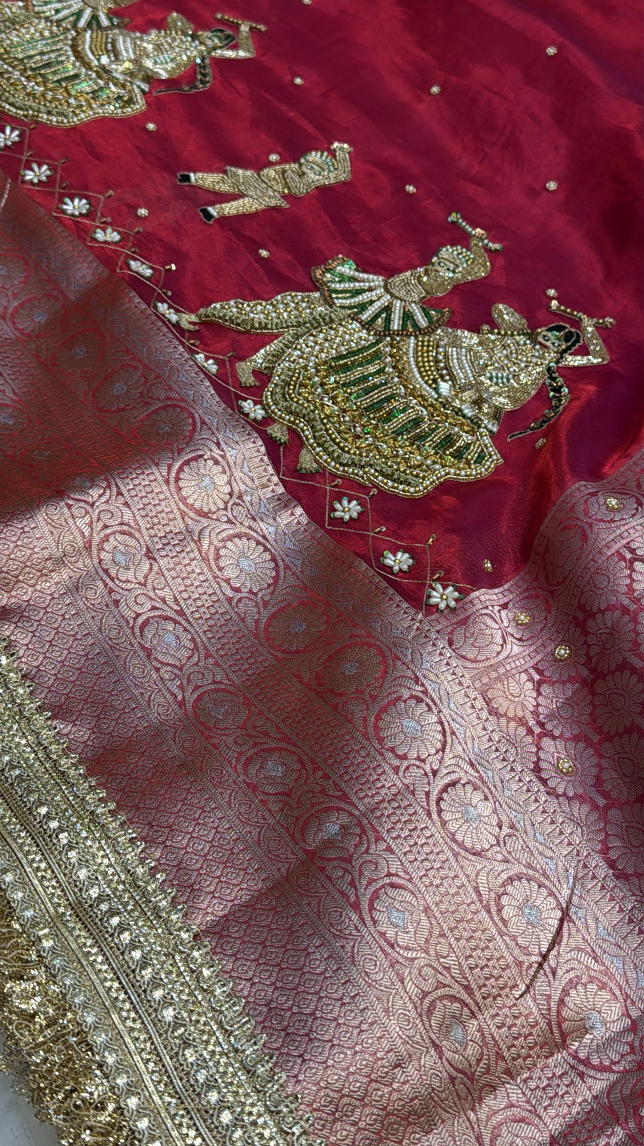 Wedding edit - Husn metallic red tissue silk garba rasleela motif hand embroidered saree