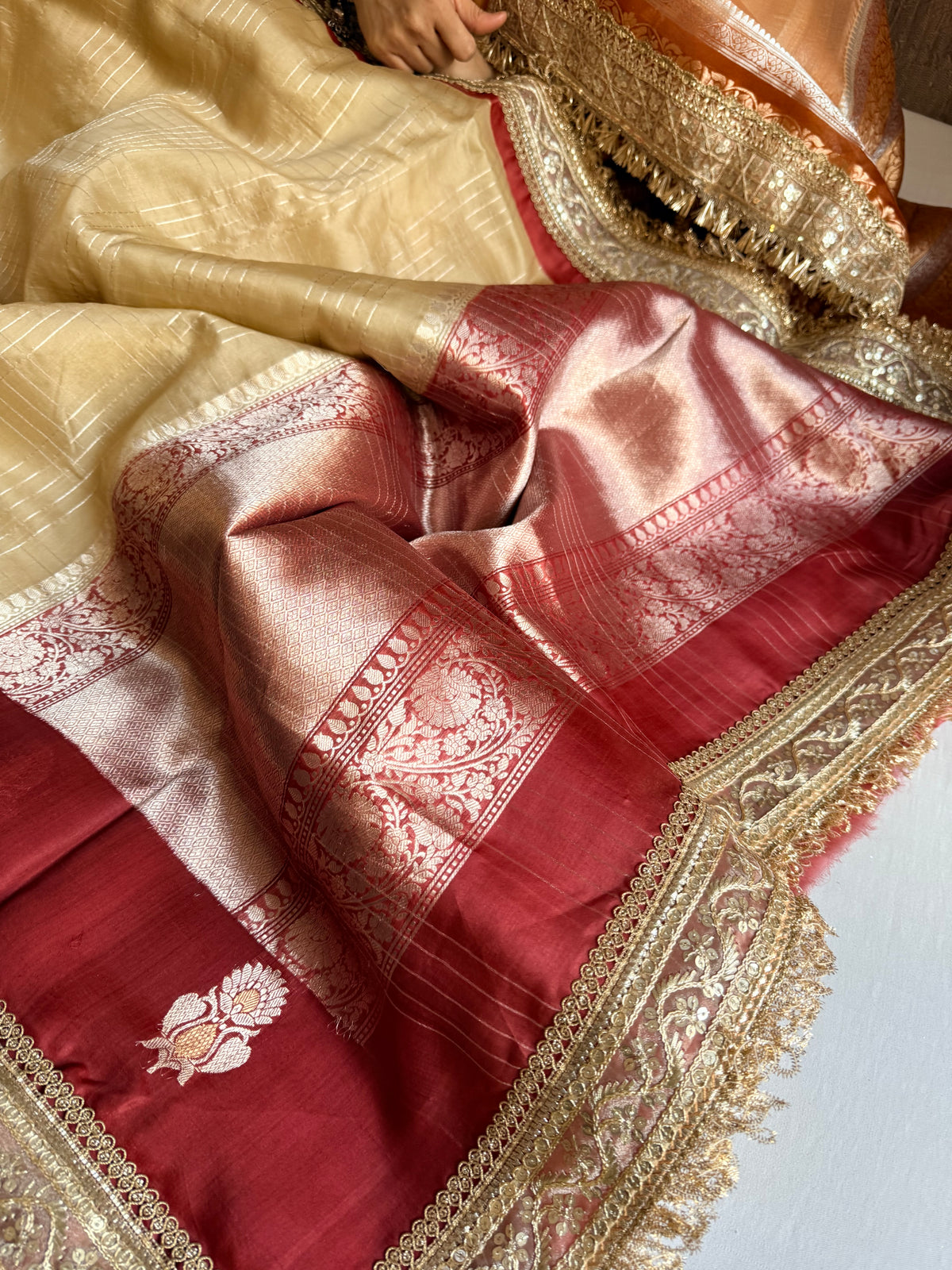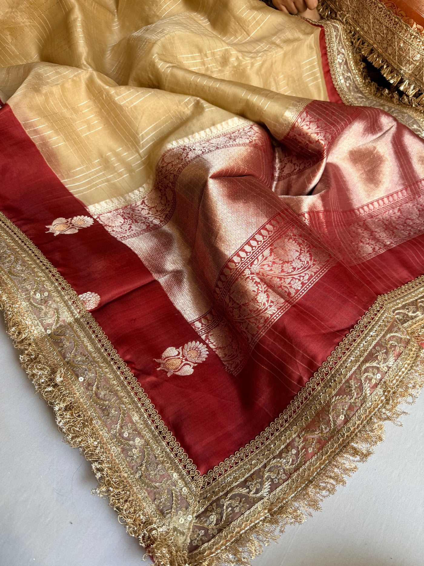 Banarasi leela soft gold-red kora silk kadhwa saree