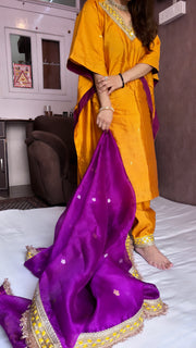 Haldi yellow-purple stitched hand embroidered kadhwa silk suit set from vyaah wala ghar edit