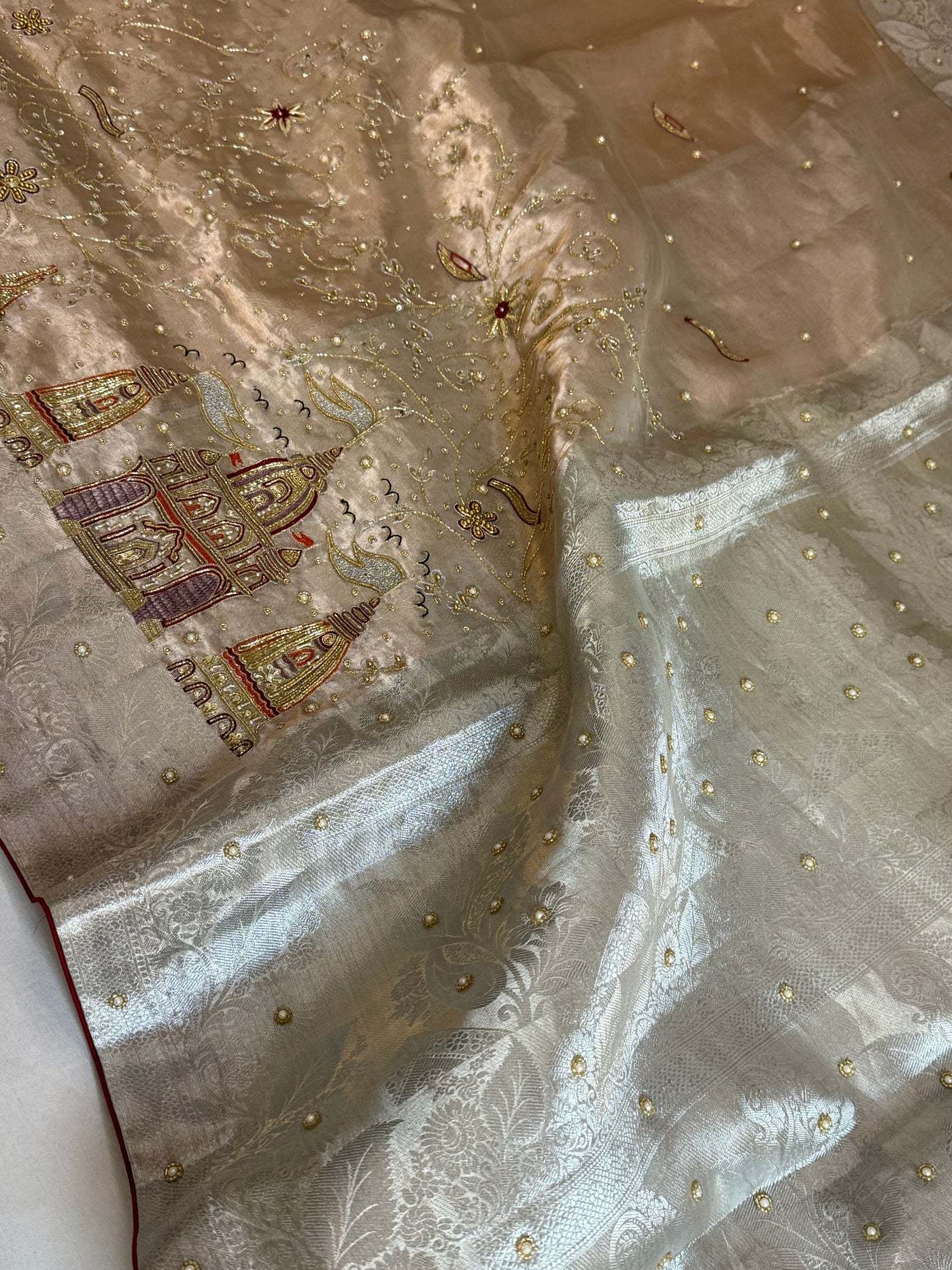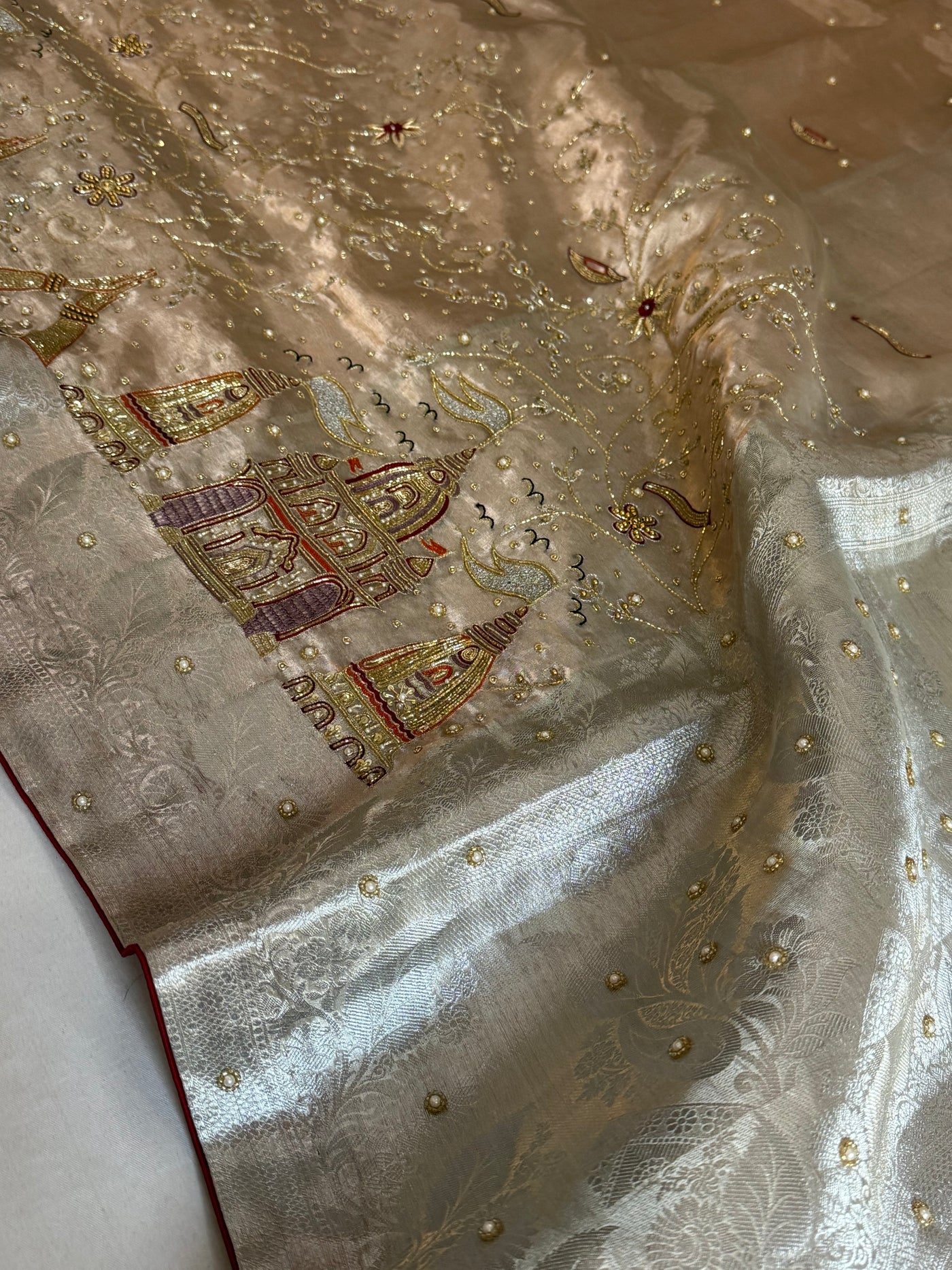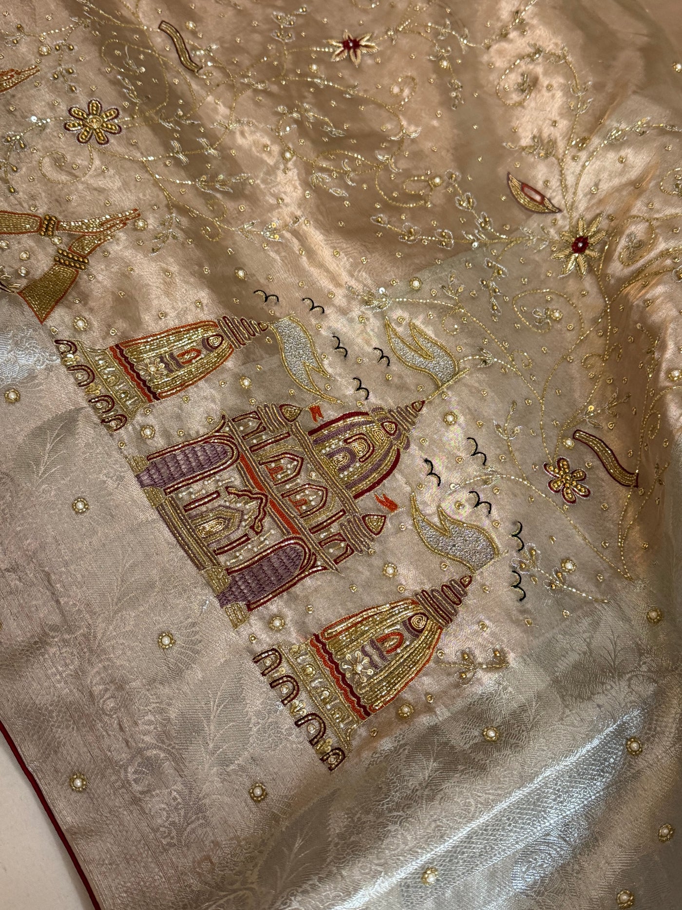 Aashirwad wali saree - tissue silk hand embroidered kadhwa saree in silver zari