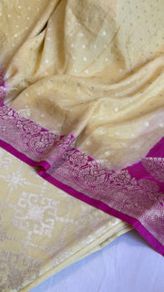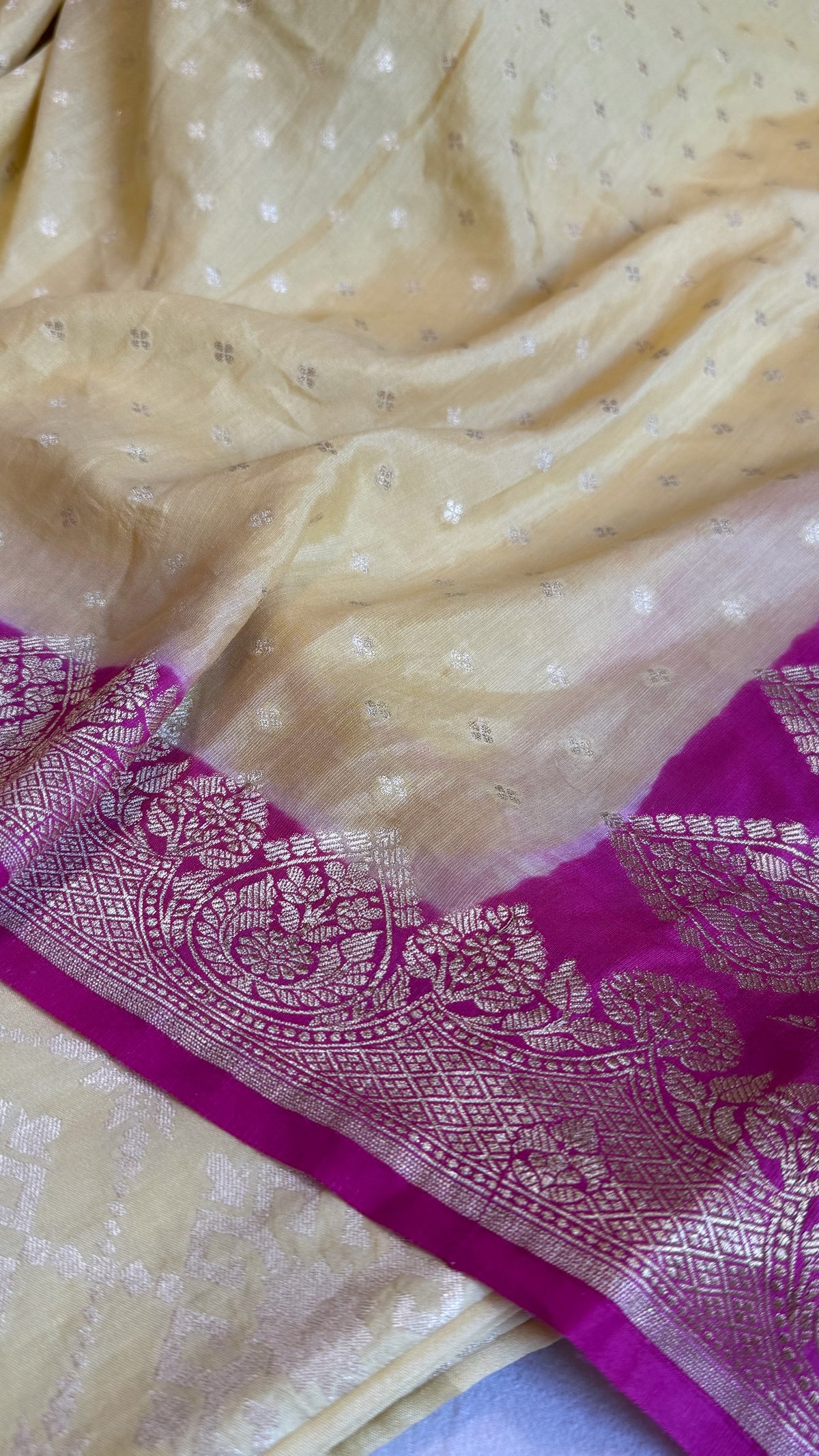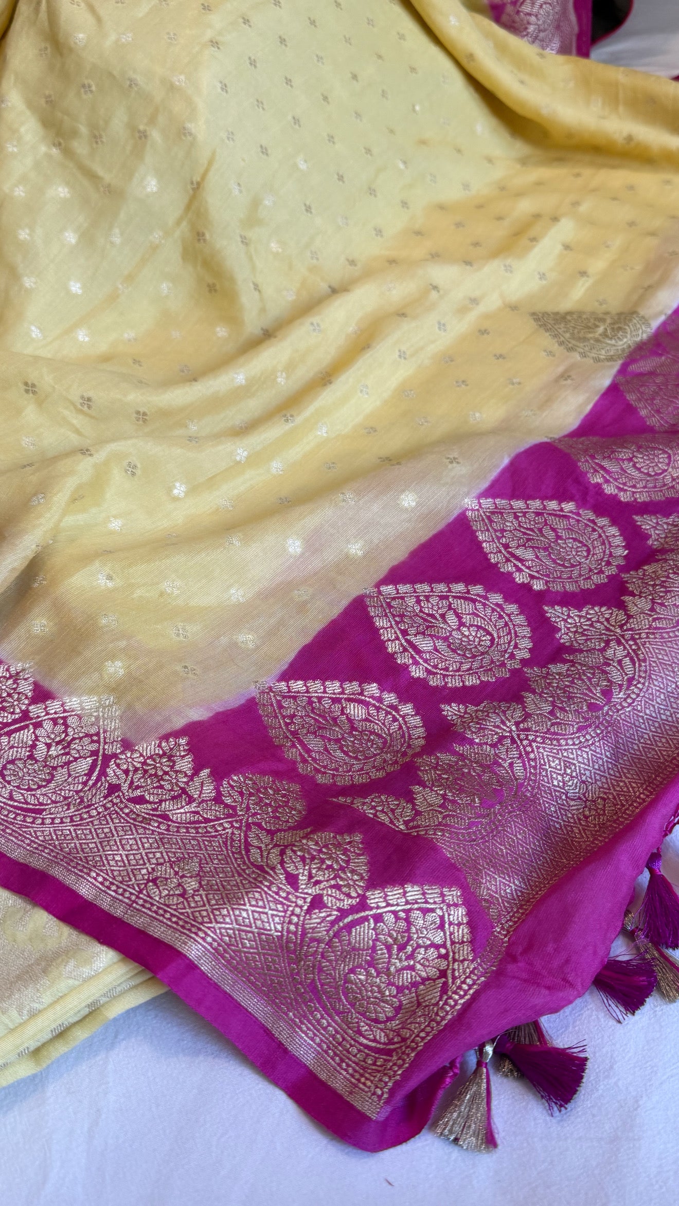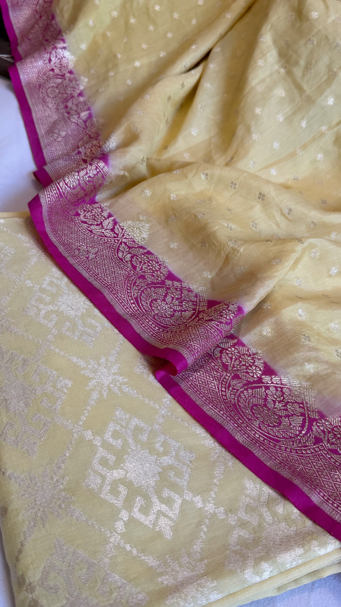 Banarasi Butter yellow - Rani pink chiniya silk kurta paired with gorgette kadhwa duppata set
