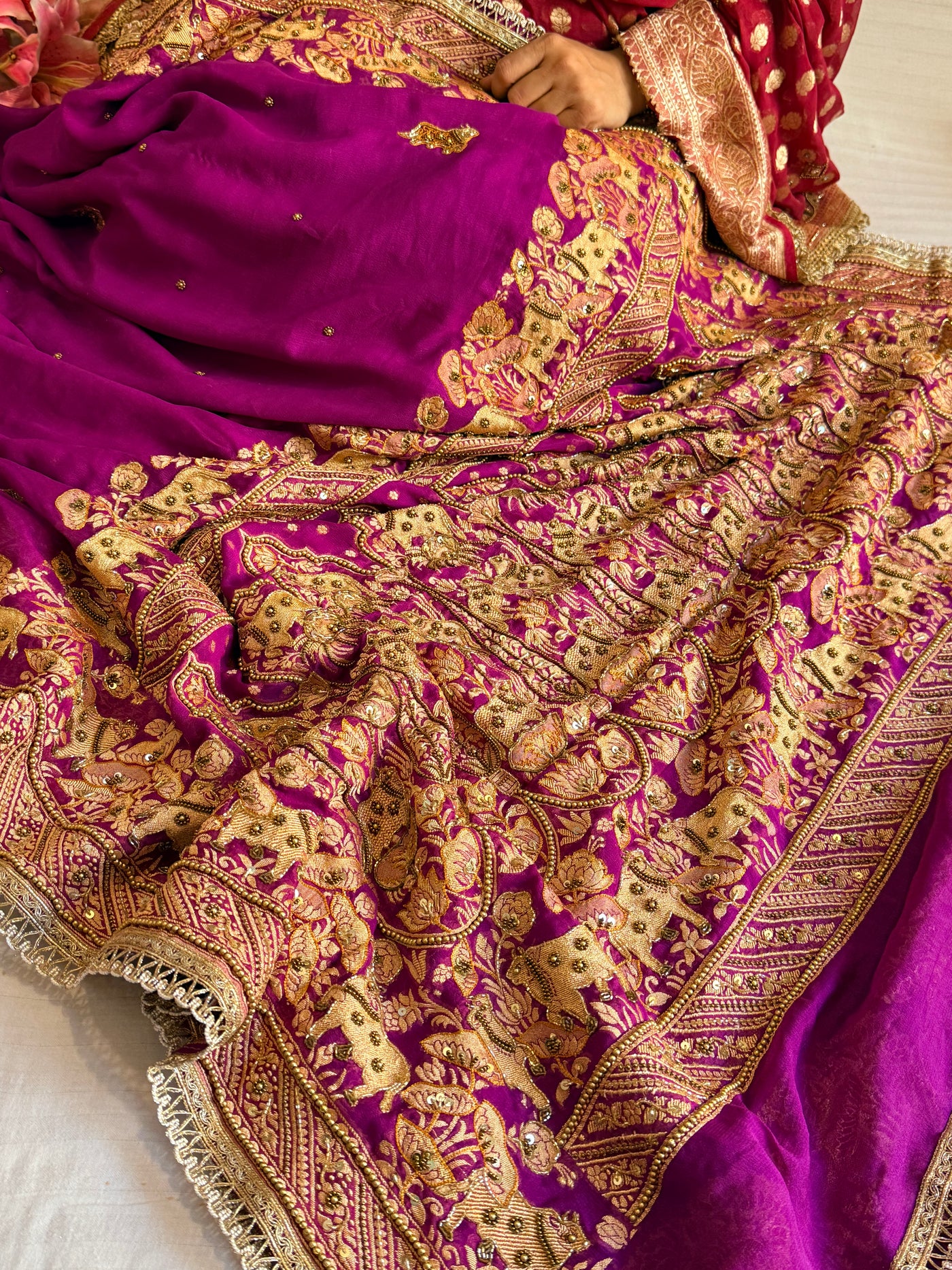 Banarasi chiffon gorgette purple hand embroidered kadhwa saree
