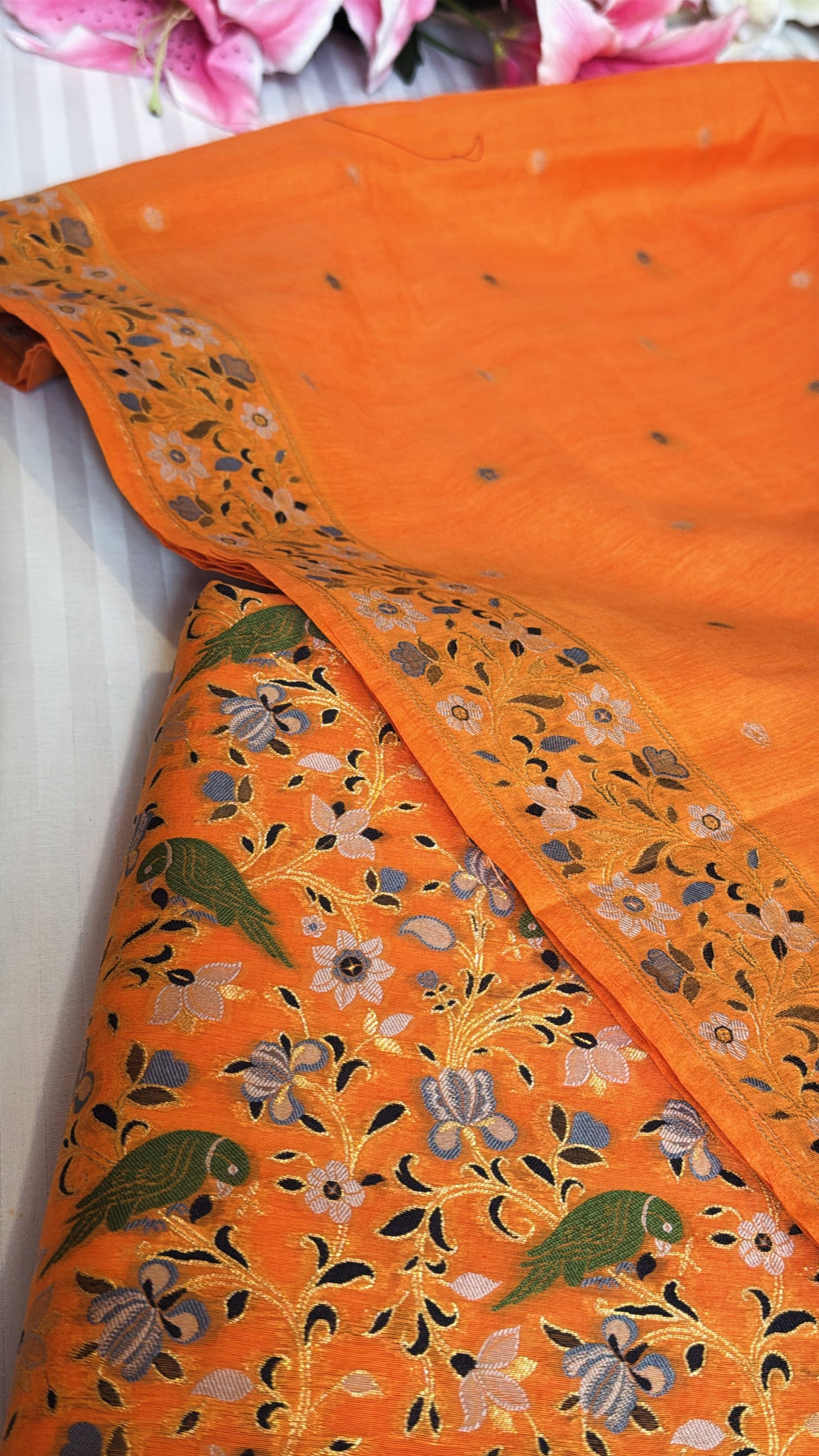SP Assurance - With vows to sustainable fashion, this pure silk handloom product from Banaras is a masterpiece involving 59 hours of brilliance & sheer endeavor of our creative artisans. We pledge to cease child labor.