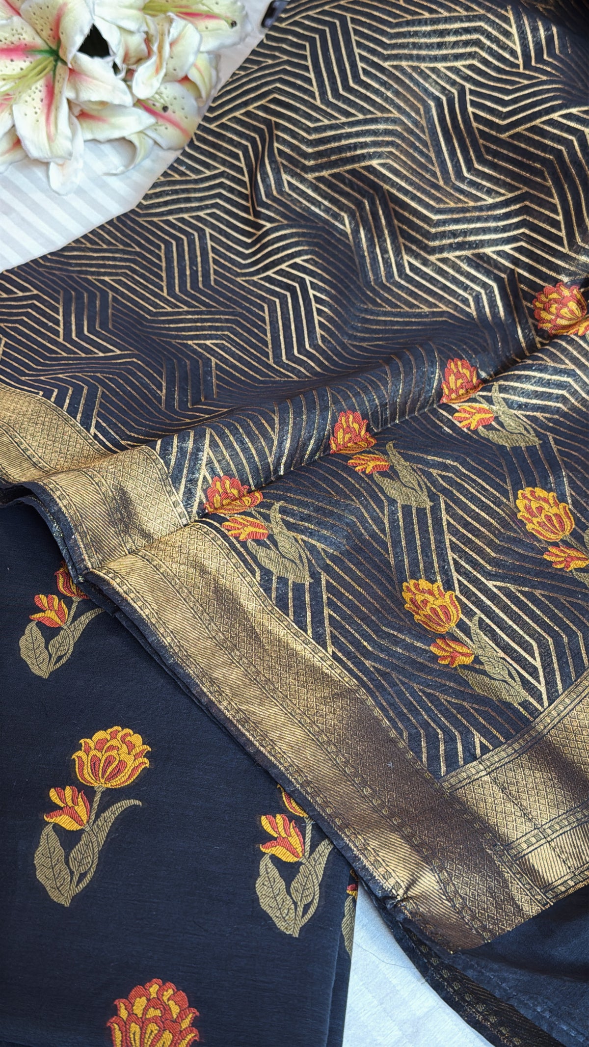 Details: The suit set includes kurta, duppata and bottom set Technique - kadhwa weaving Kurta Length - 2.5 meter Kurta...