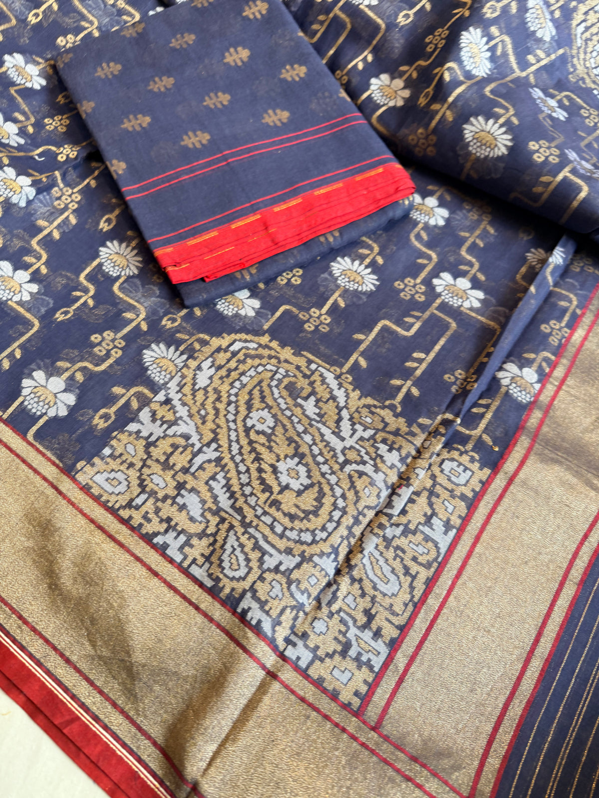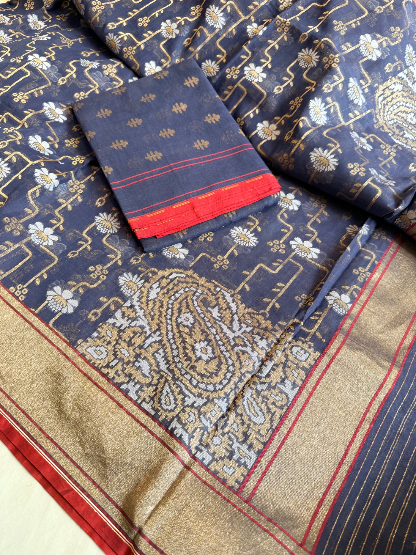 Banarasi iktara cotton jamdani navy blue sona rupa kadhwa suit set