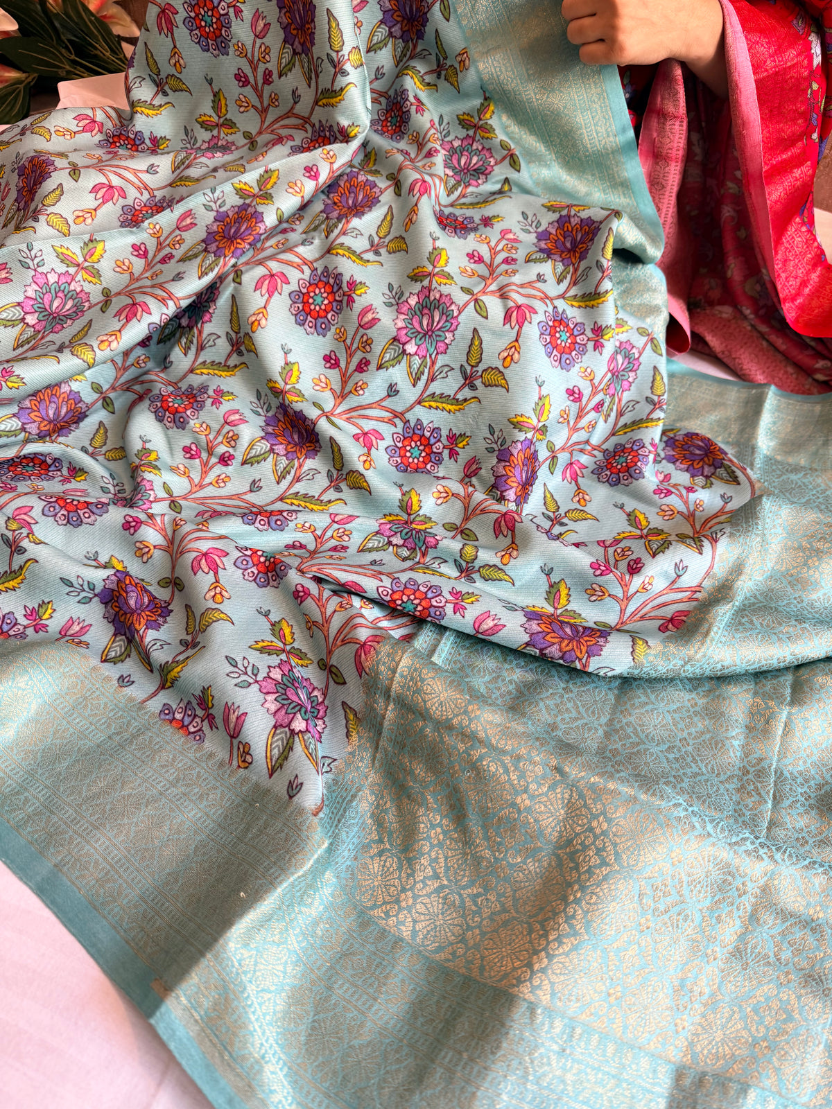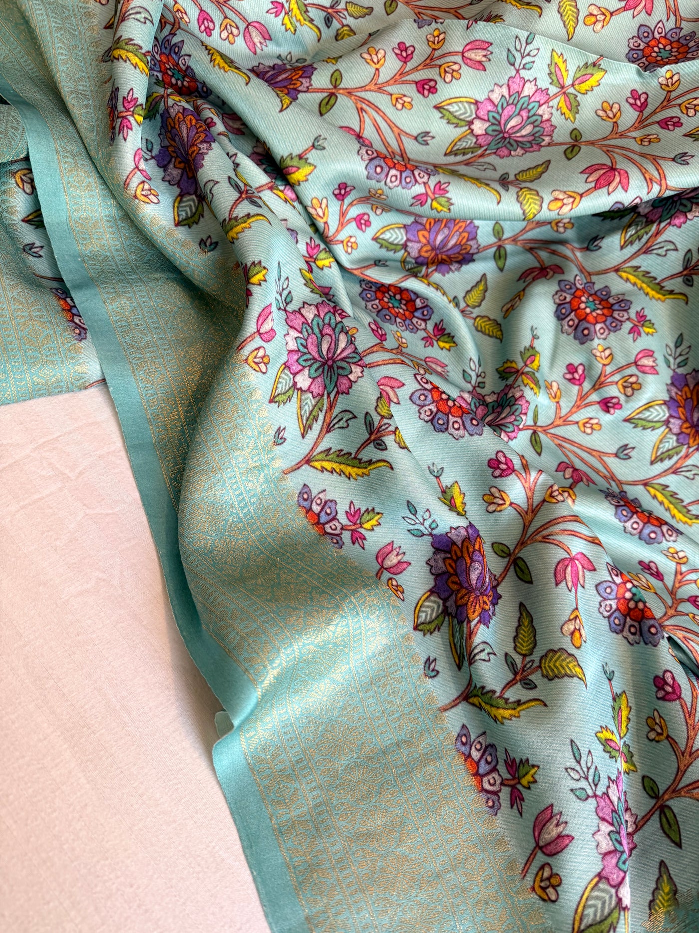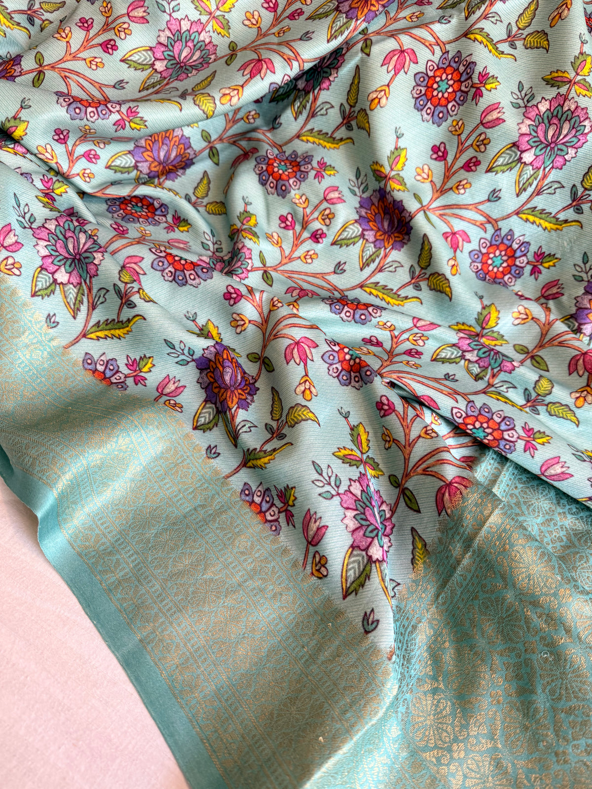 Banarasi mashru satin silk kani weaving printed sea green saree