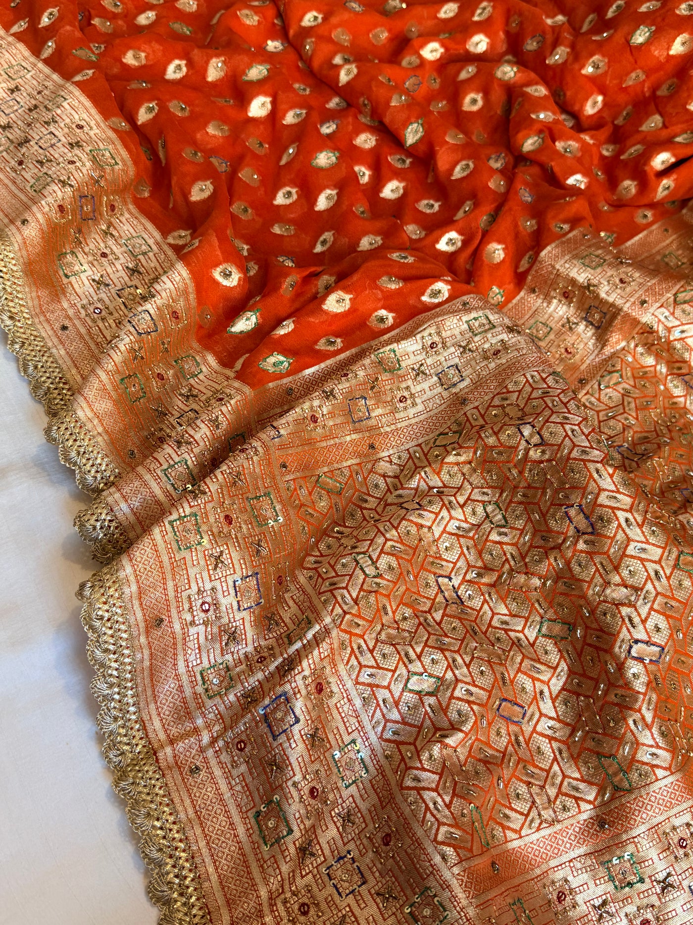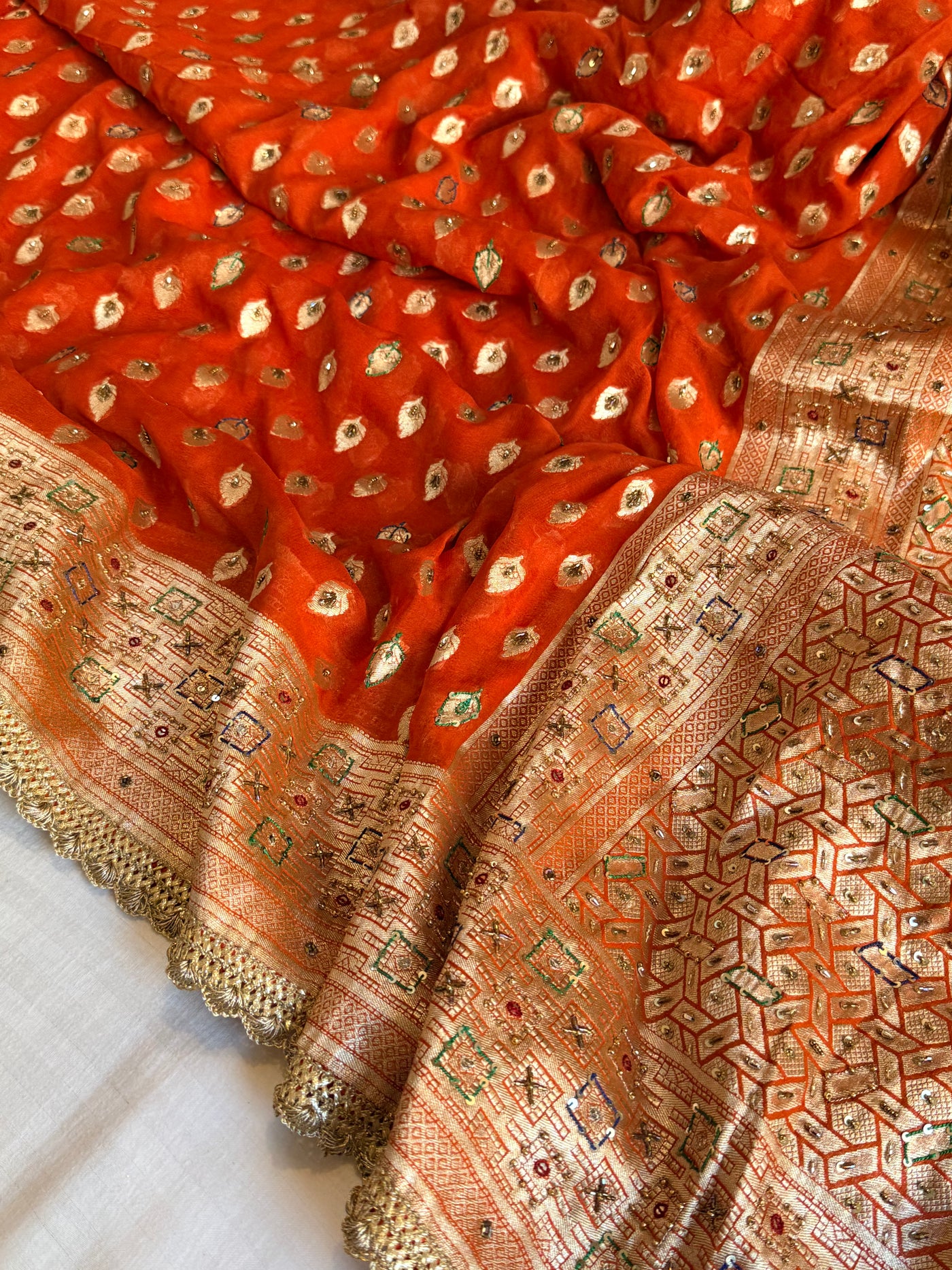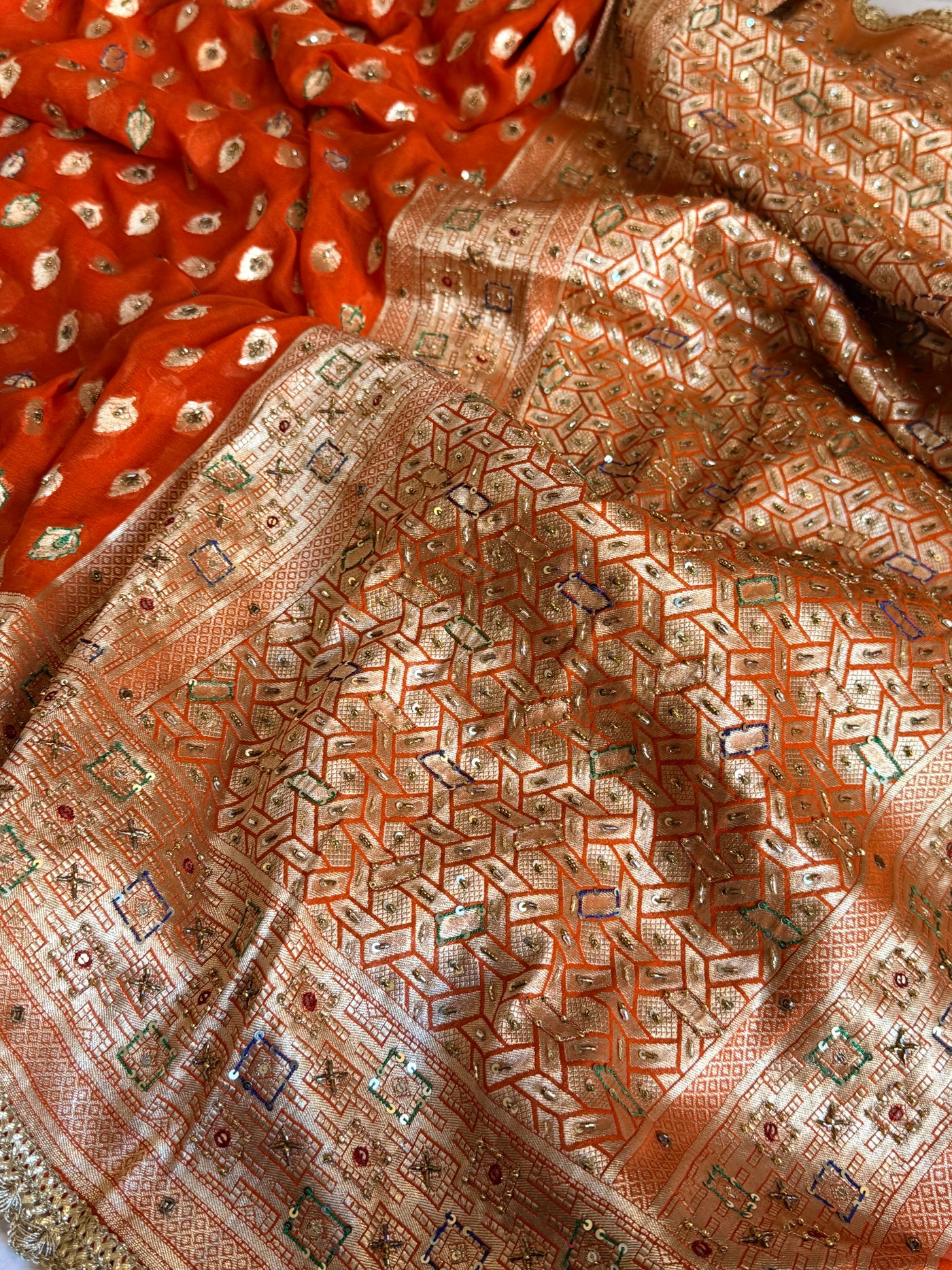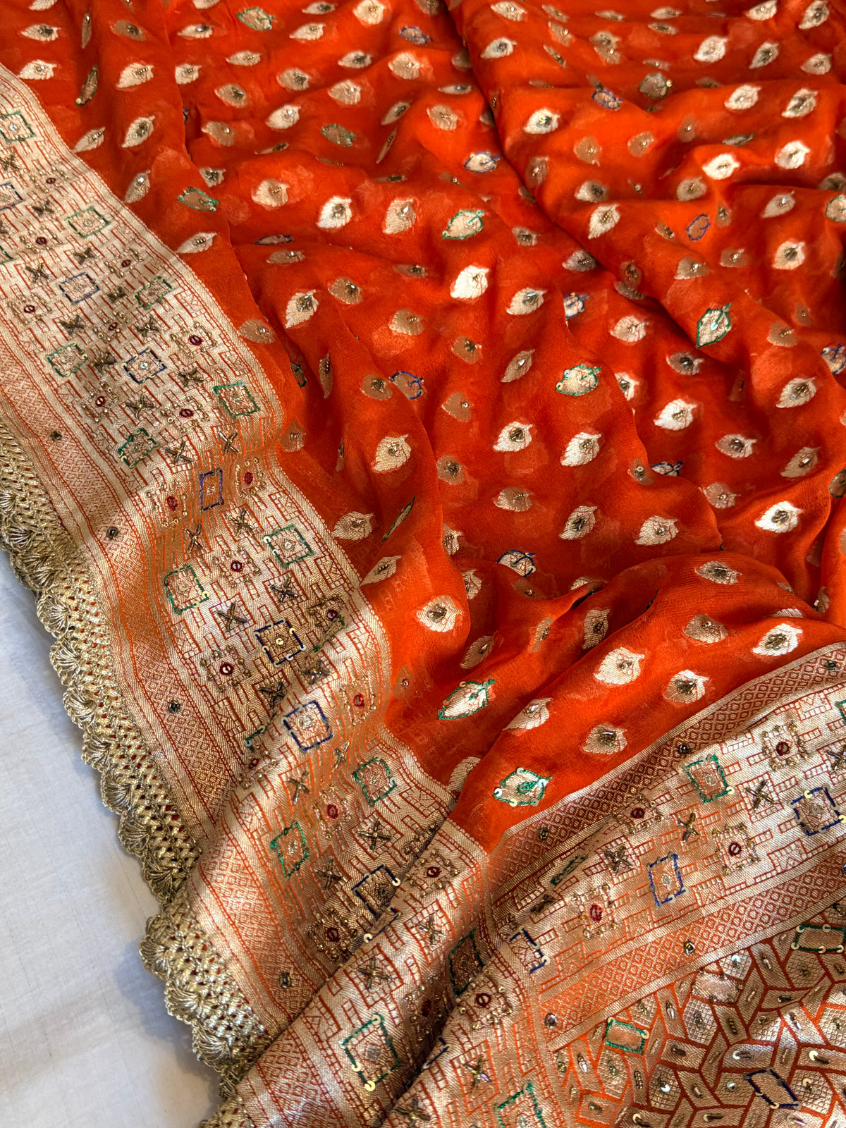 Banarasi moonga gorgette fanta orange hand embroidered kadhwa saree