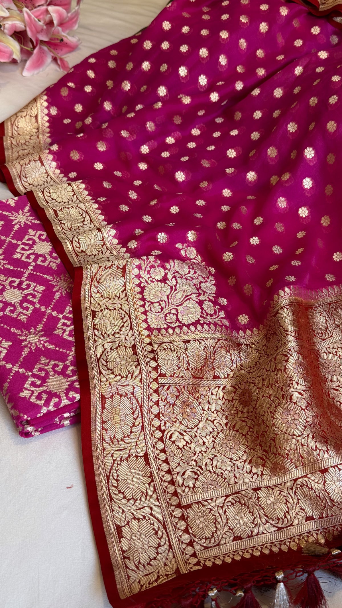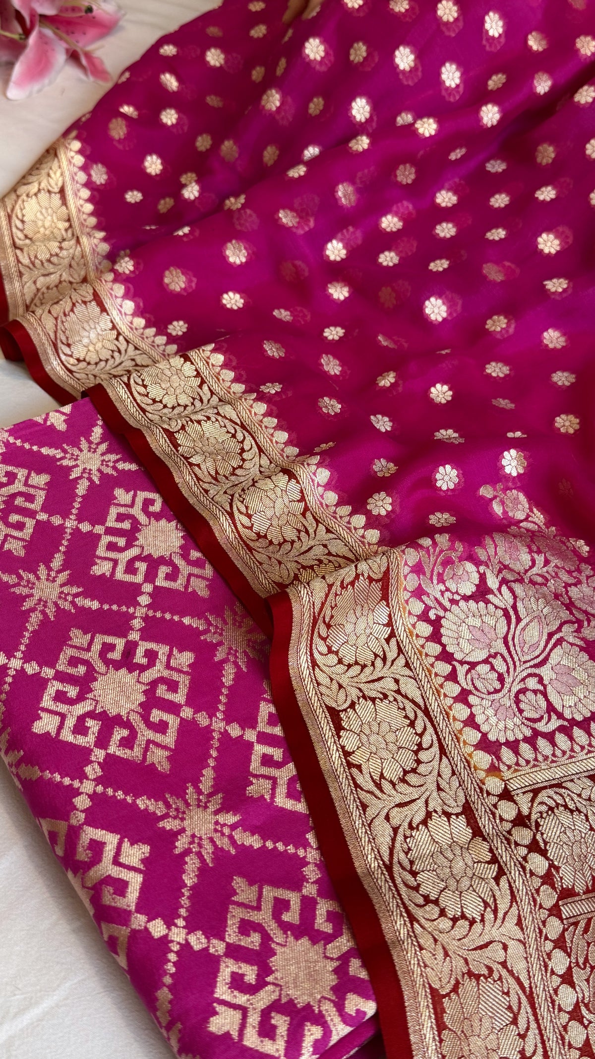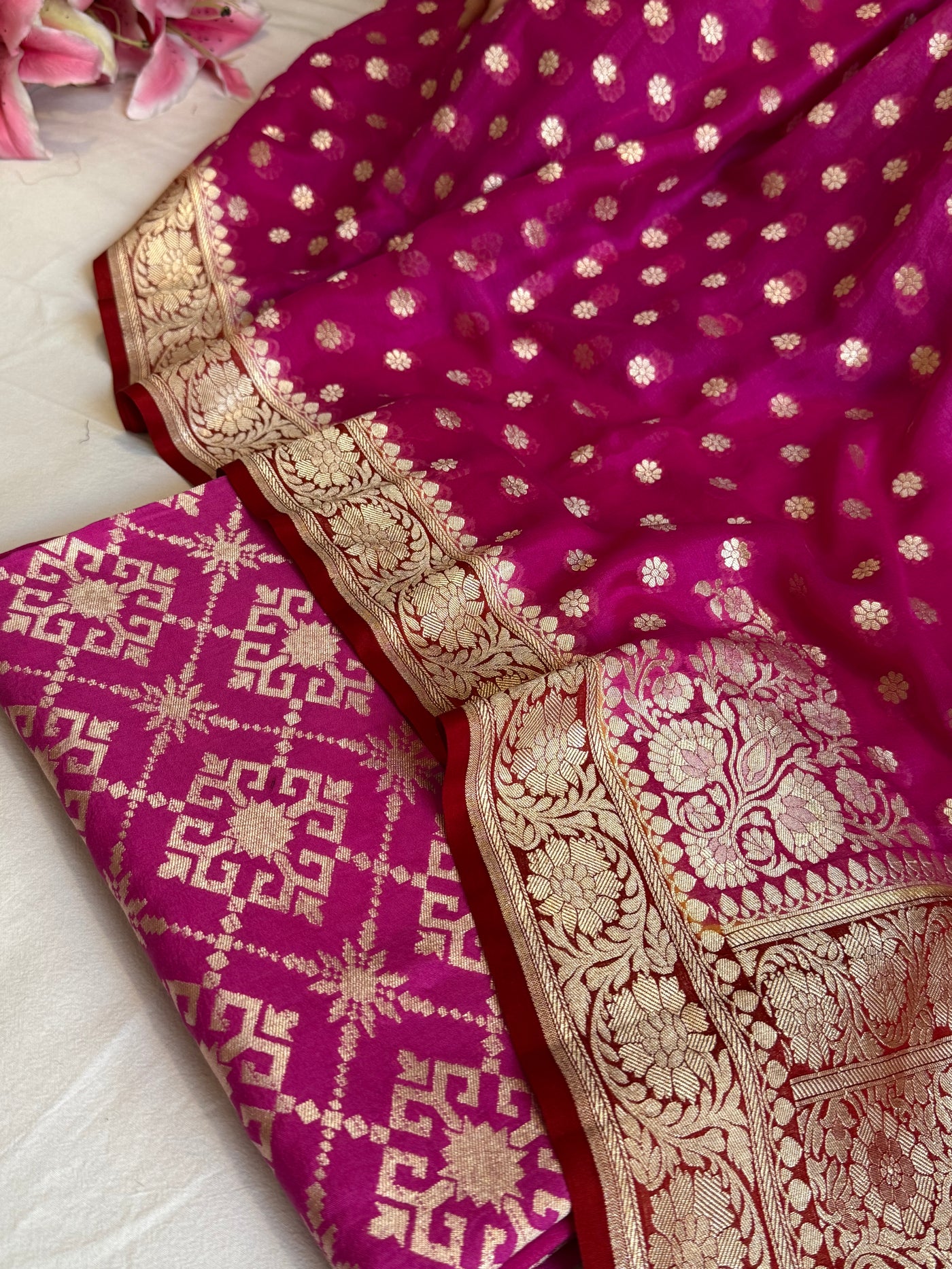 Banarasi red-rani chiniya silk kurta paired with gorgette kadhwa duppata set