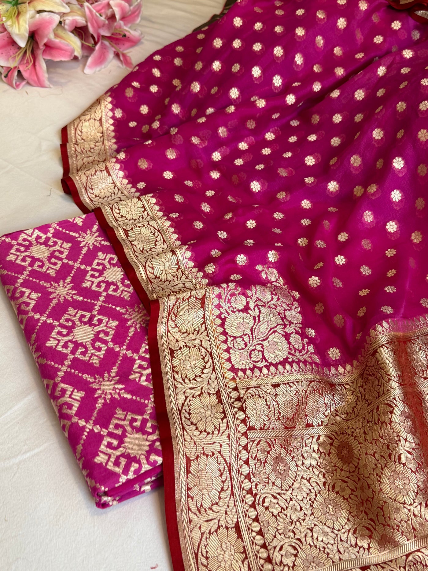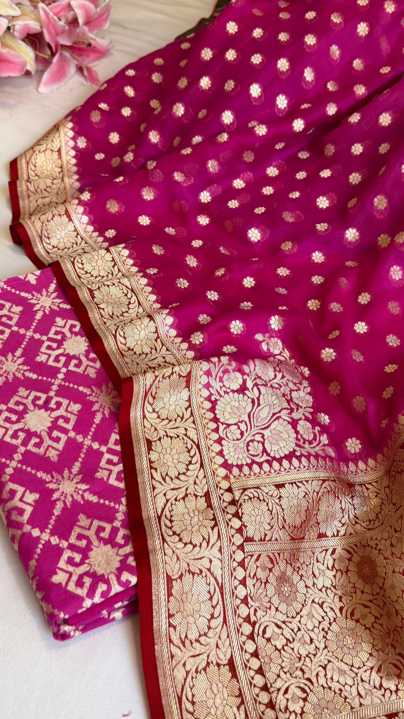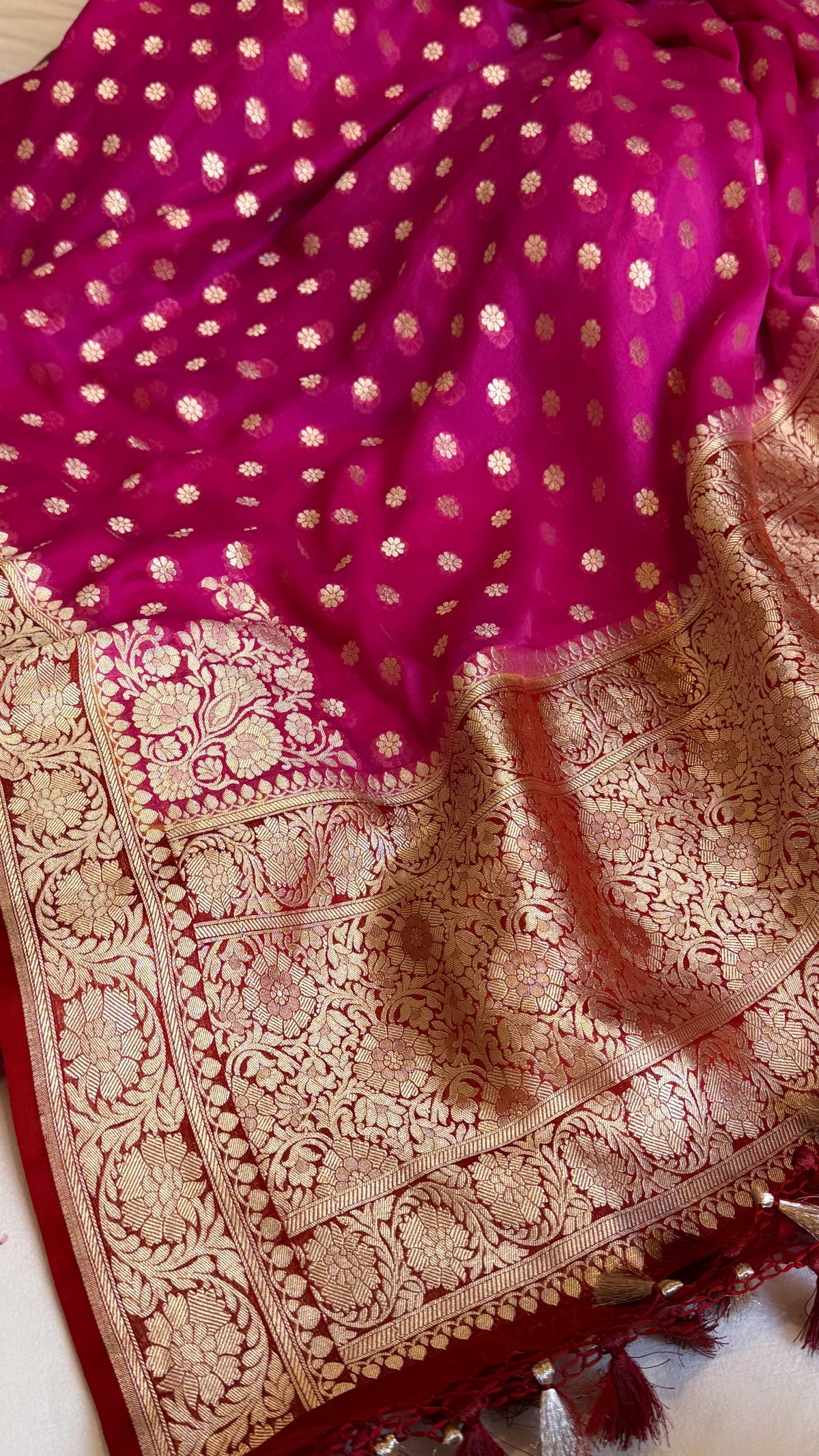 Banarasi red-rani chiniya silk kurta paired with gorgette kadhwa duppata set