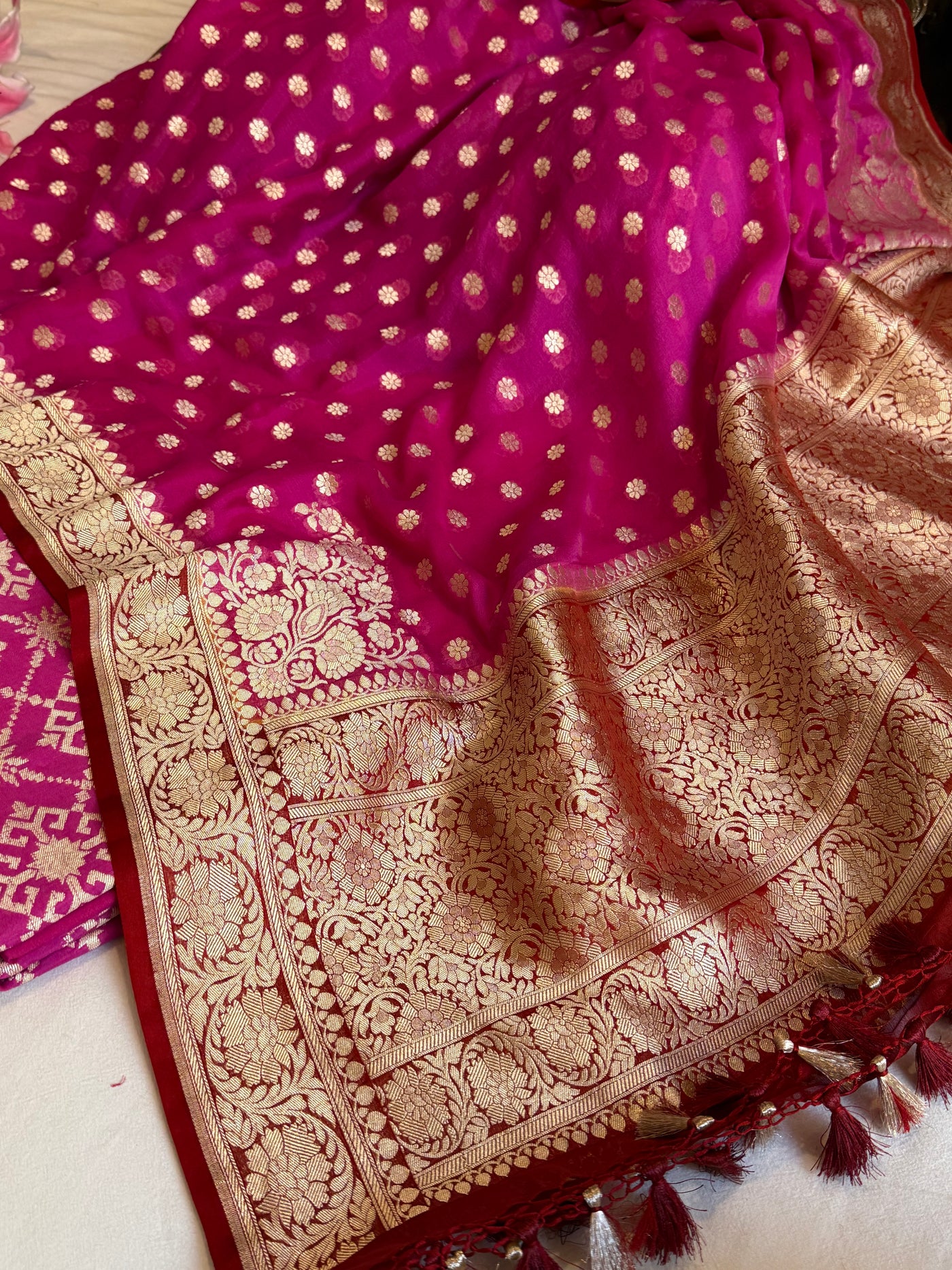 SP Assurance - With vows to sustainable fashion, this pure silk handloom product from Banaras is a masterpiece involving 59 hours of brilliance & sheer endeavor of our creative artisans. We pledge to cease child labor.