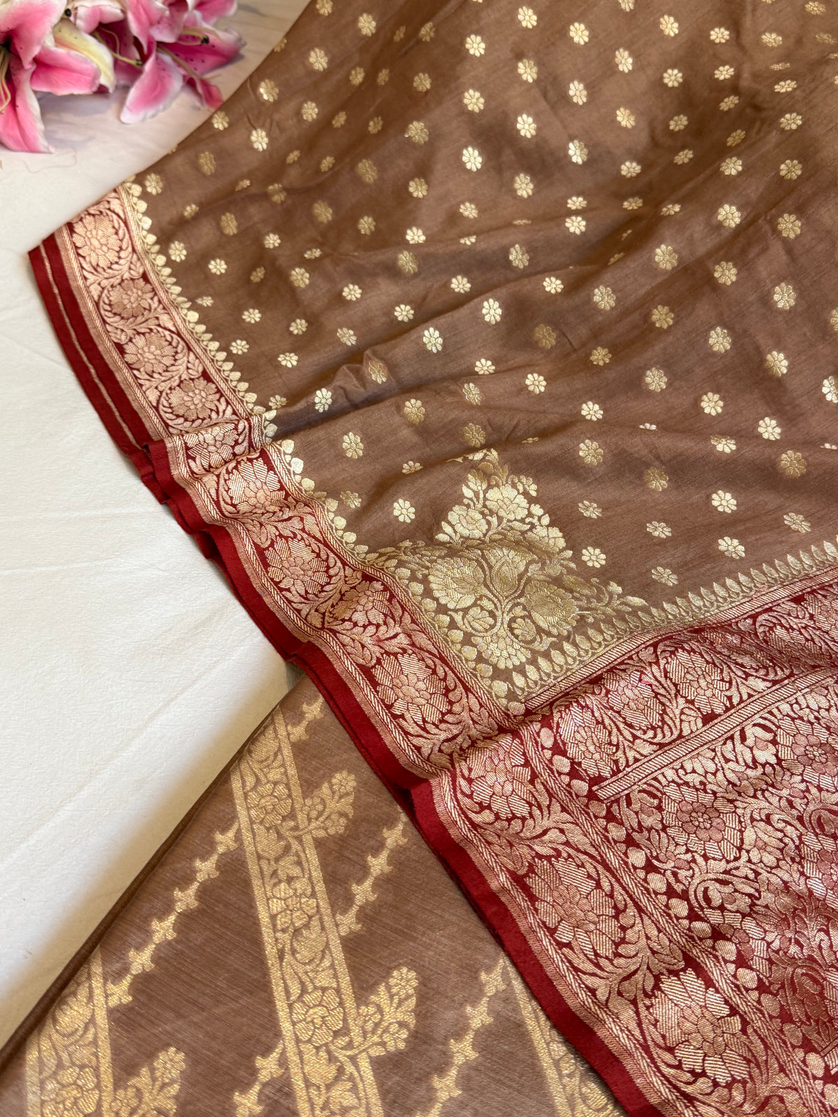 Banarasi rose brown-red chiniya silk kurta paired with moonga silk duppata set