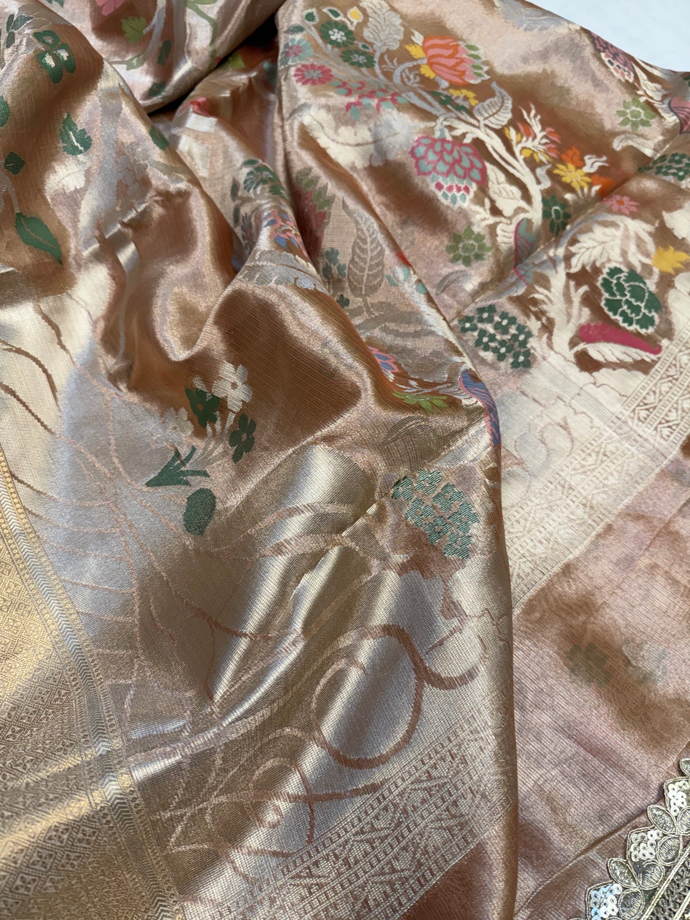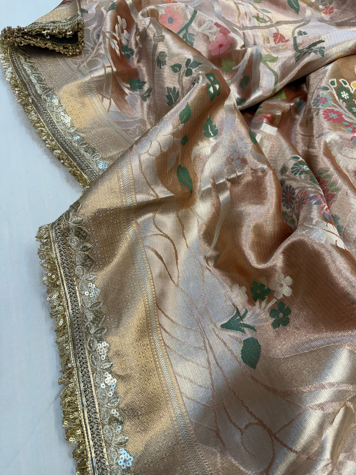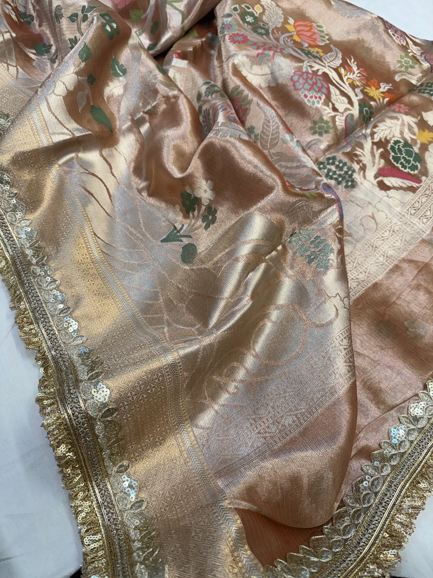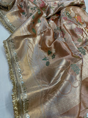Banarasi rose gold peachish shade paithani border kanjivaram silver tissue saree