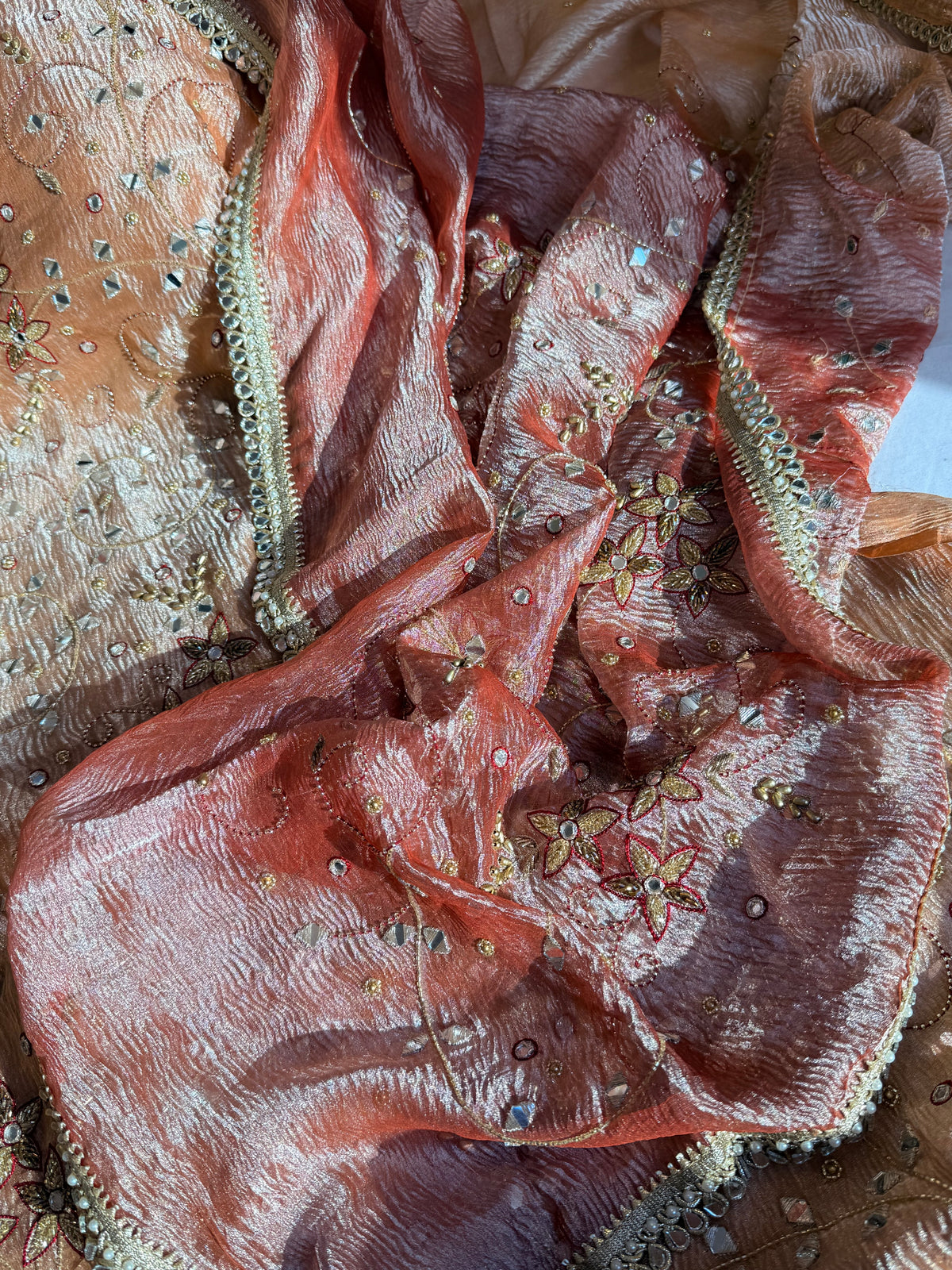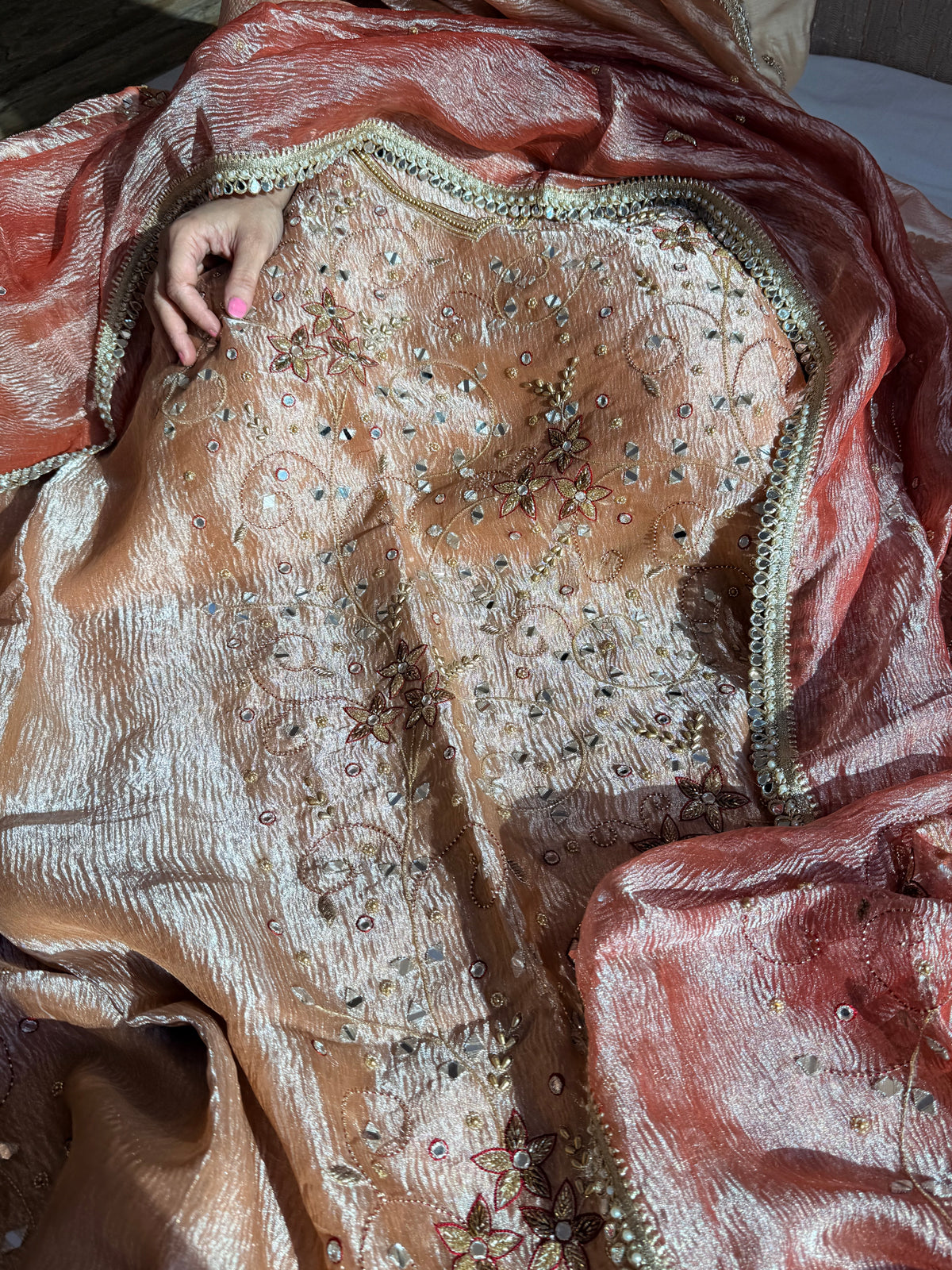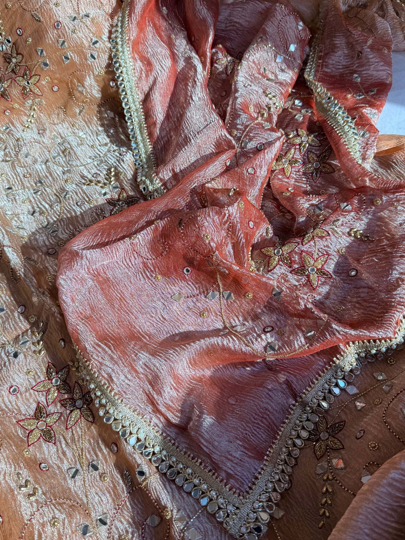 Banarasi tissue silk mirrorwork hand embroidered crushed suit sets