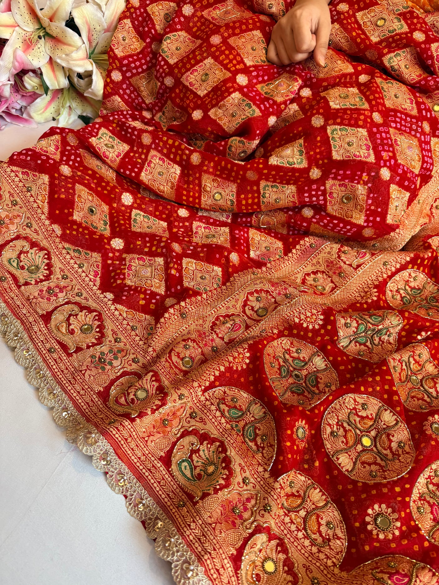 Bandhej saree ka sandook - Deep red shaded chiffon gorgette banarasi bandhej saree