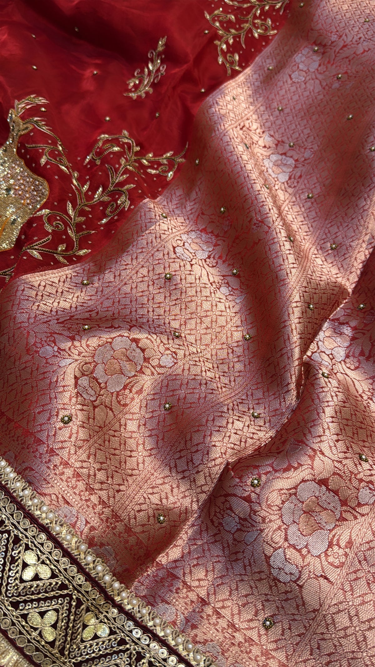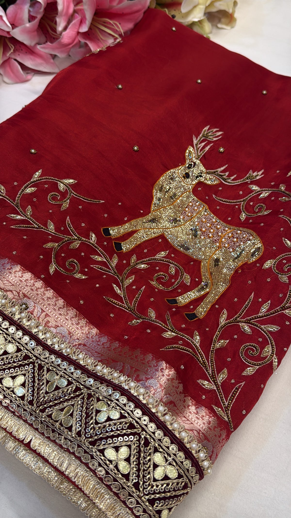 Blood red deer motif husn tissue silk hand embroidered kadhwa saree