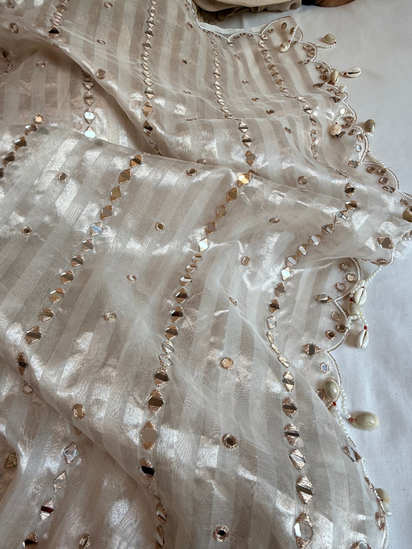 Diamond tissue silk zari stripes mirror work hand embroidered kadhwa saree