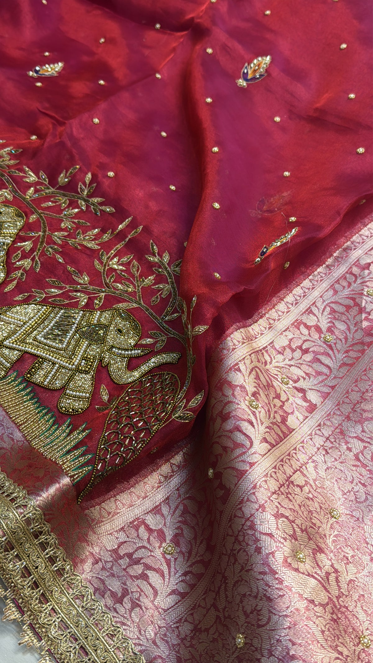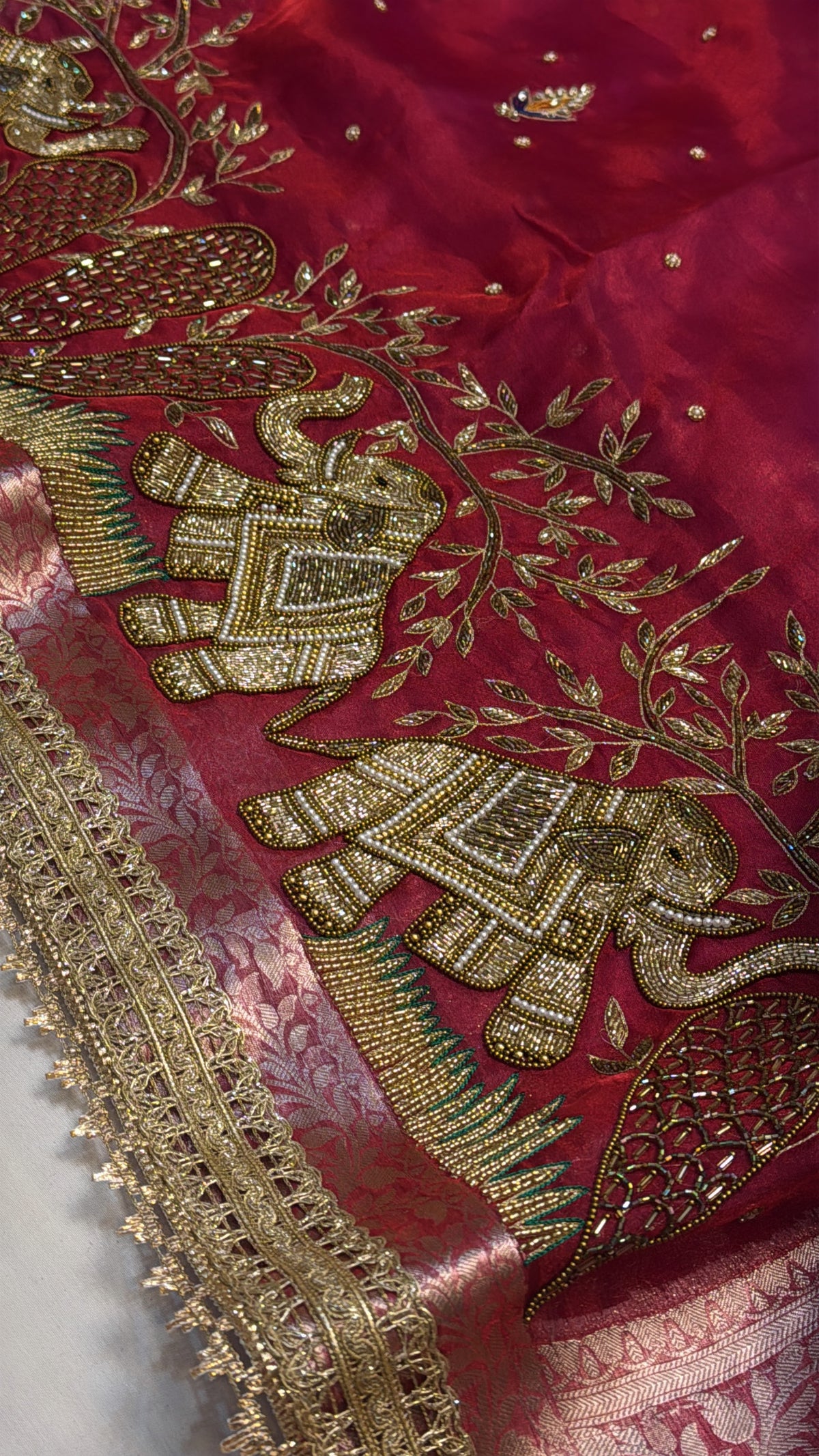 Dulhan ka joda husn red tissue silk hand embroidered saree