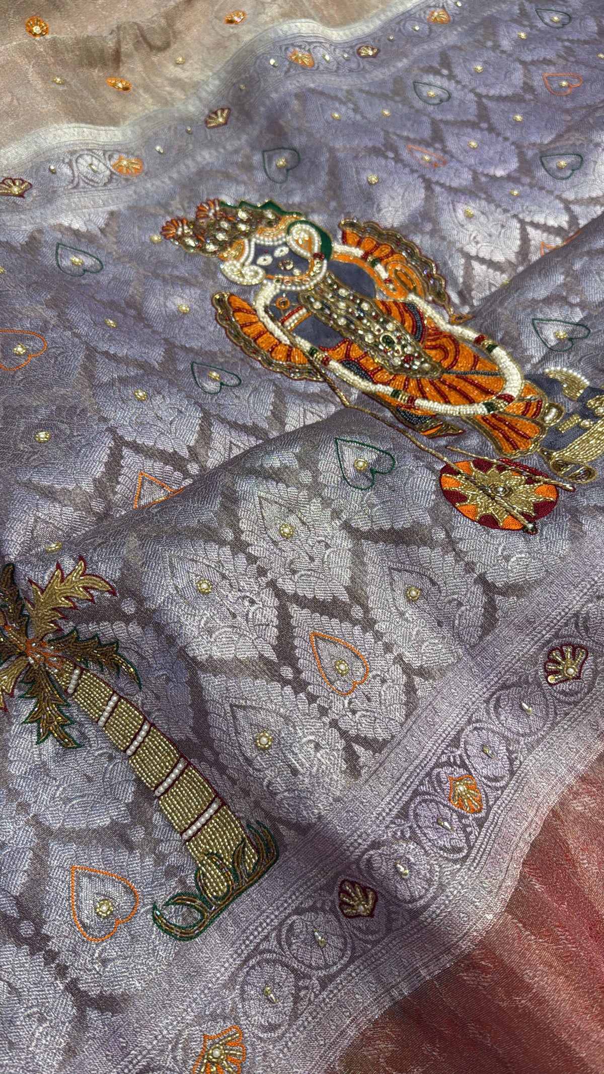Dusty lilac tissue brocade shreenathji motif hand embroidered kadhwa saree