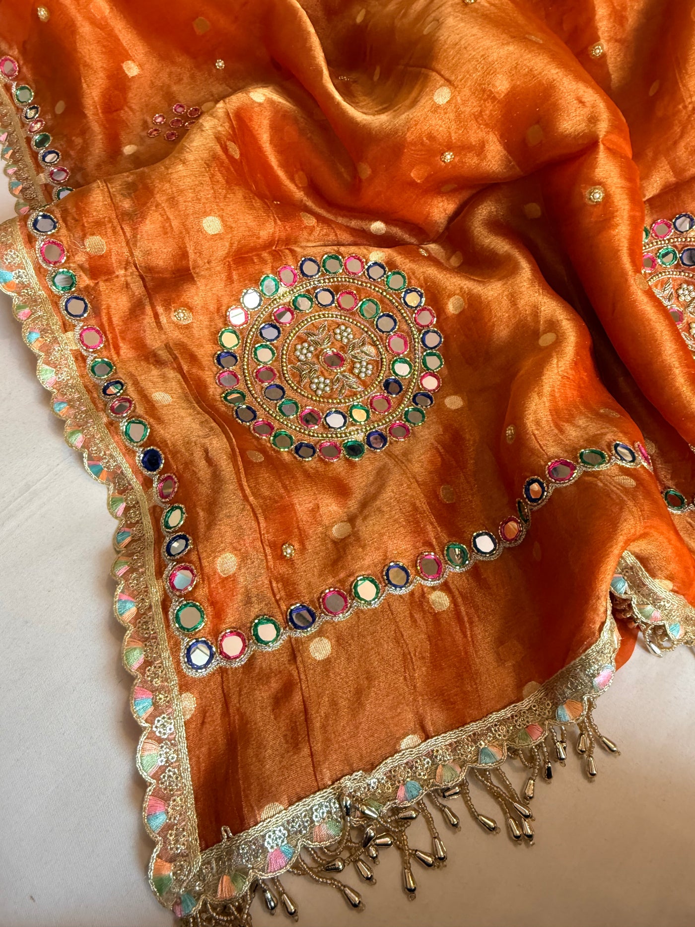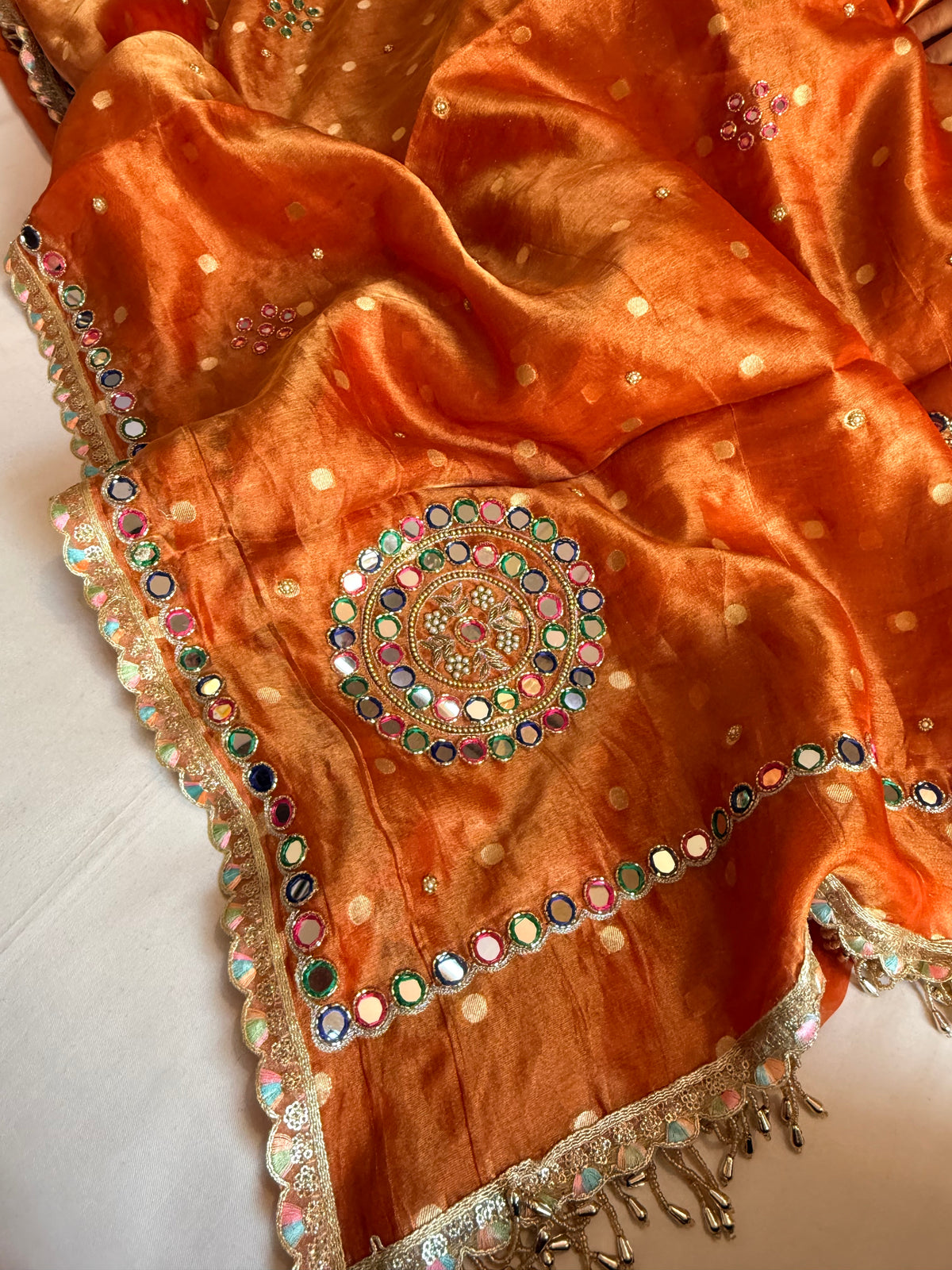 Fanta orange tissue silk meenakari mirror work hand embroidered saree
