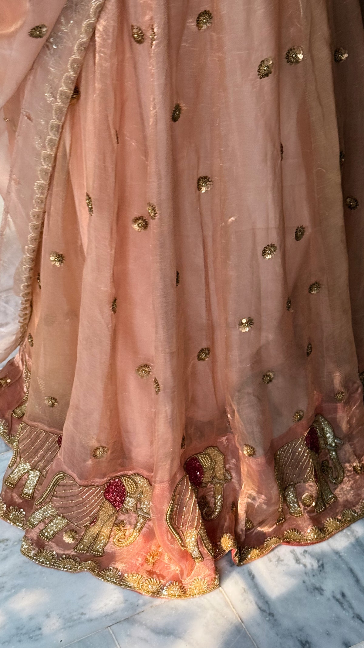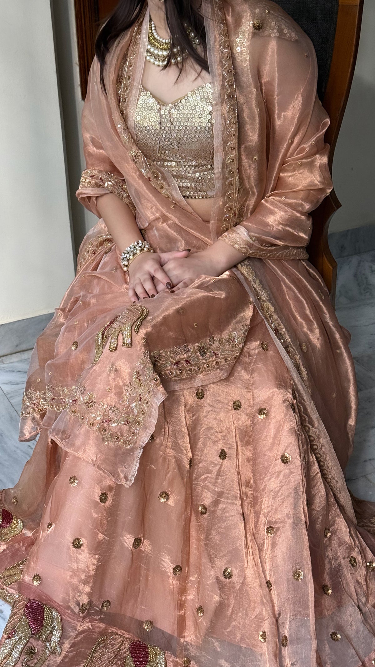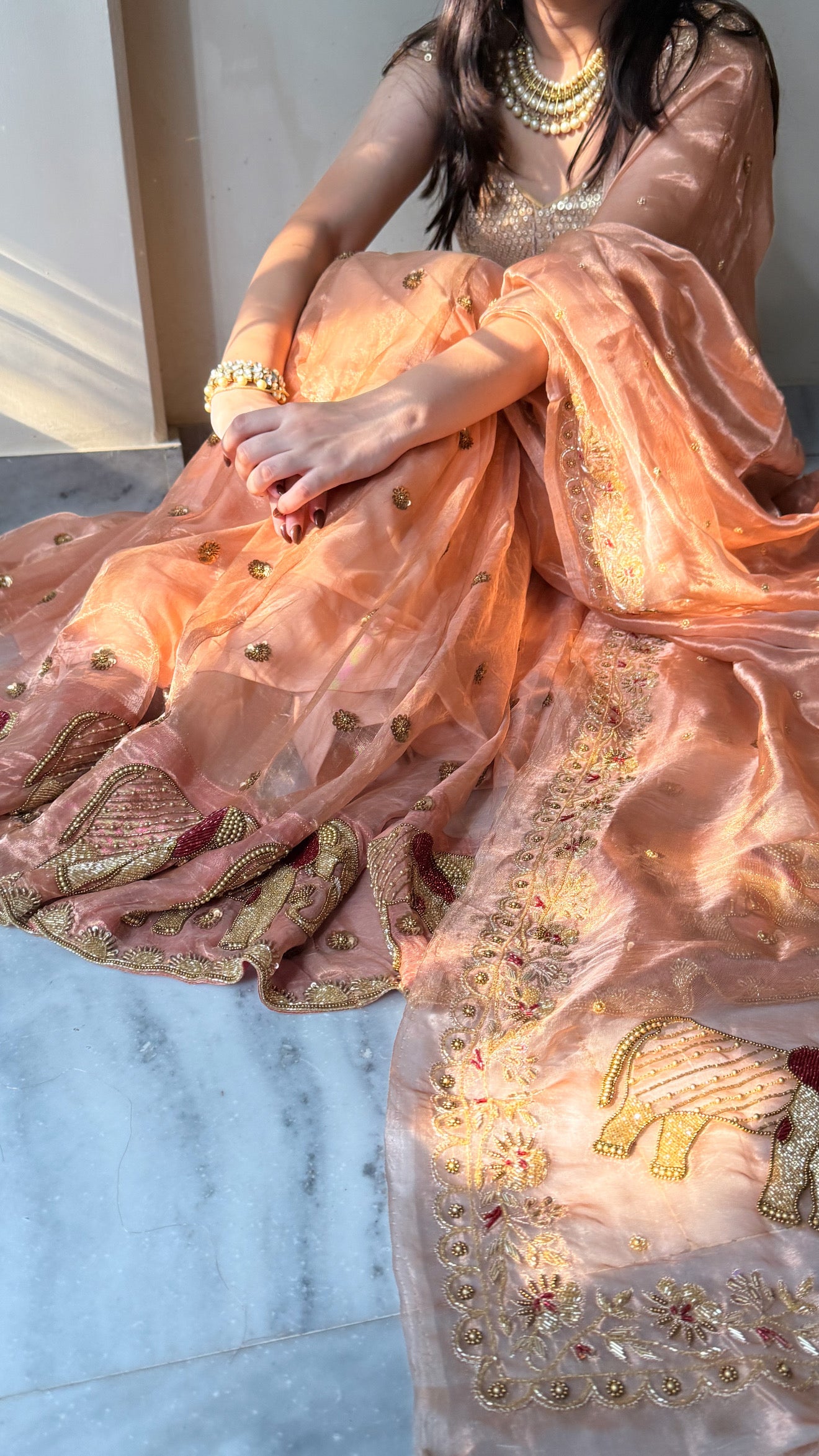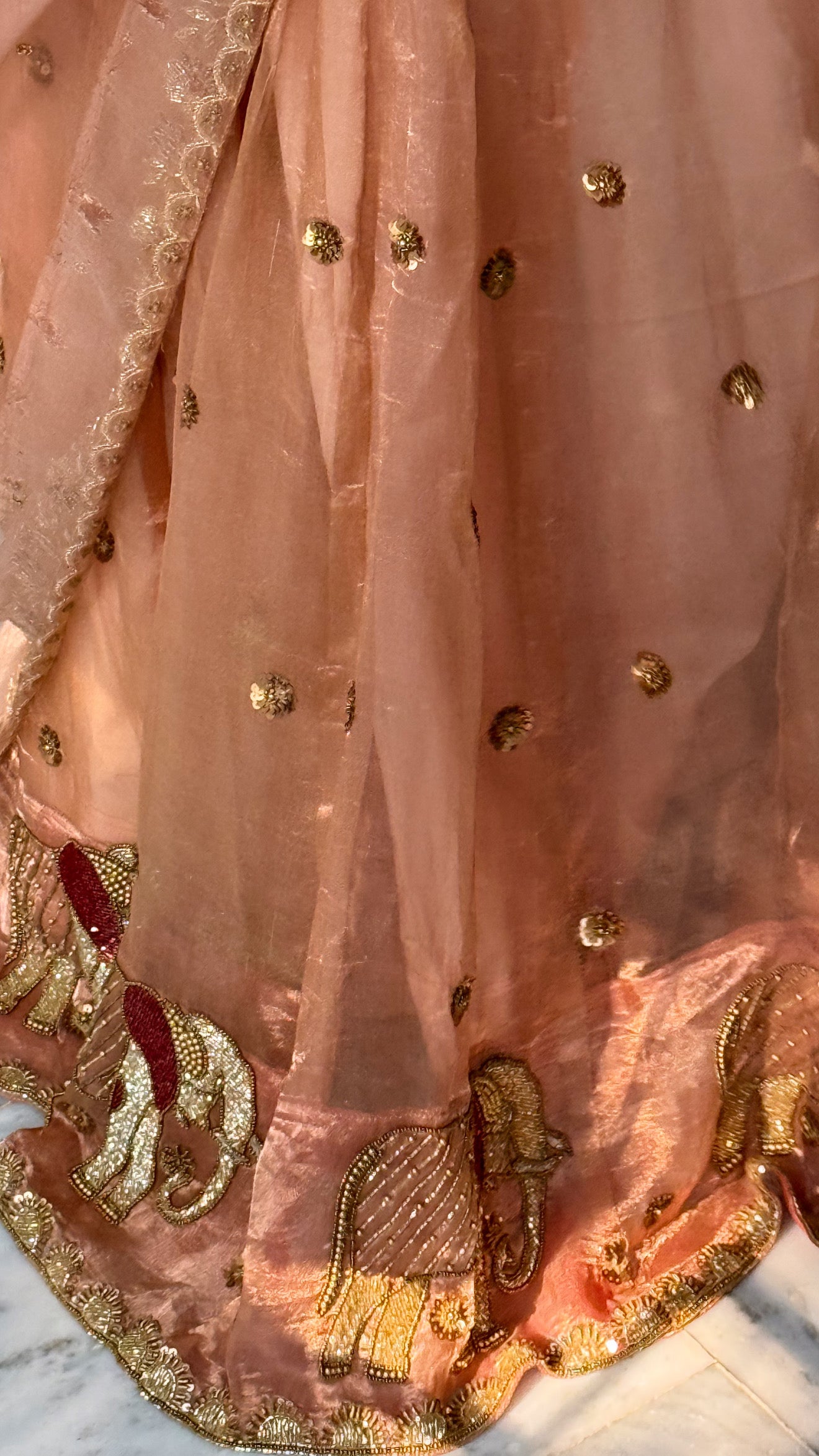 Gajgamini copper zari elephant motif hand embroidered tissue silk lehenga set