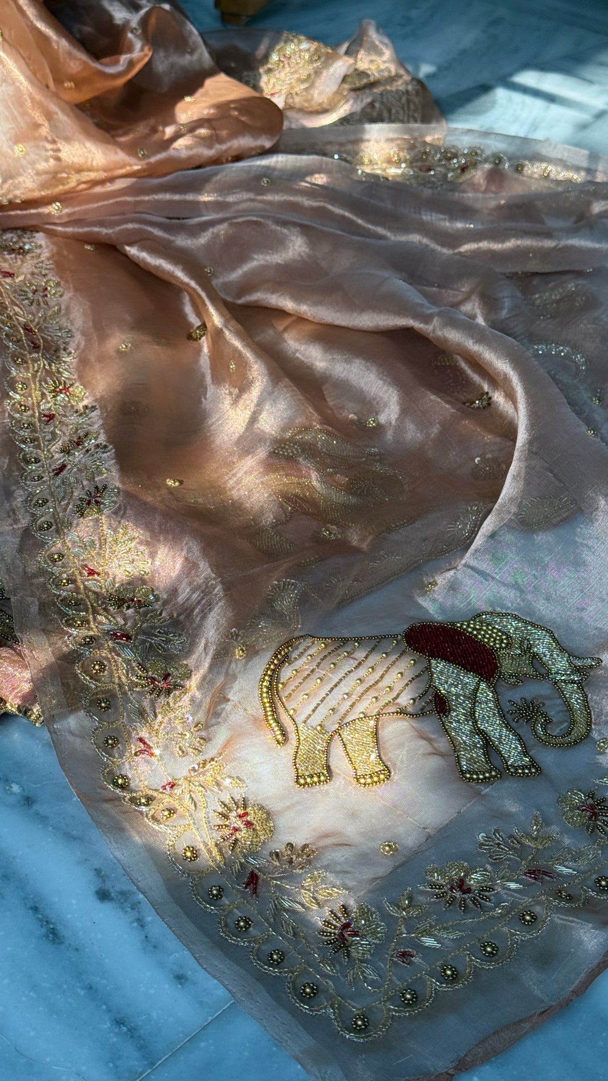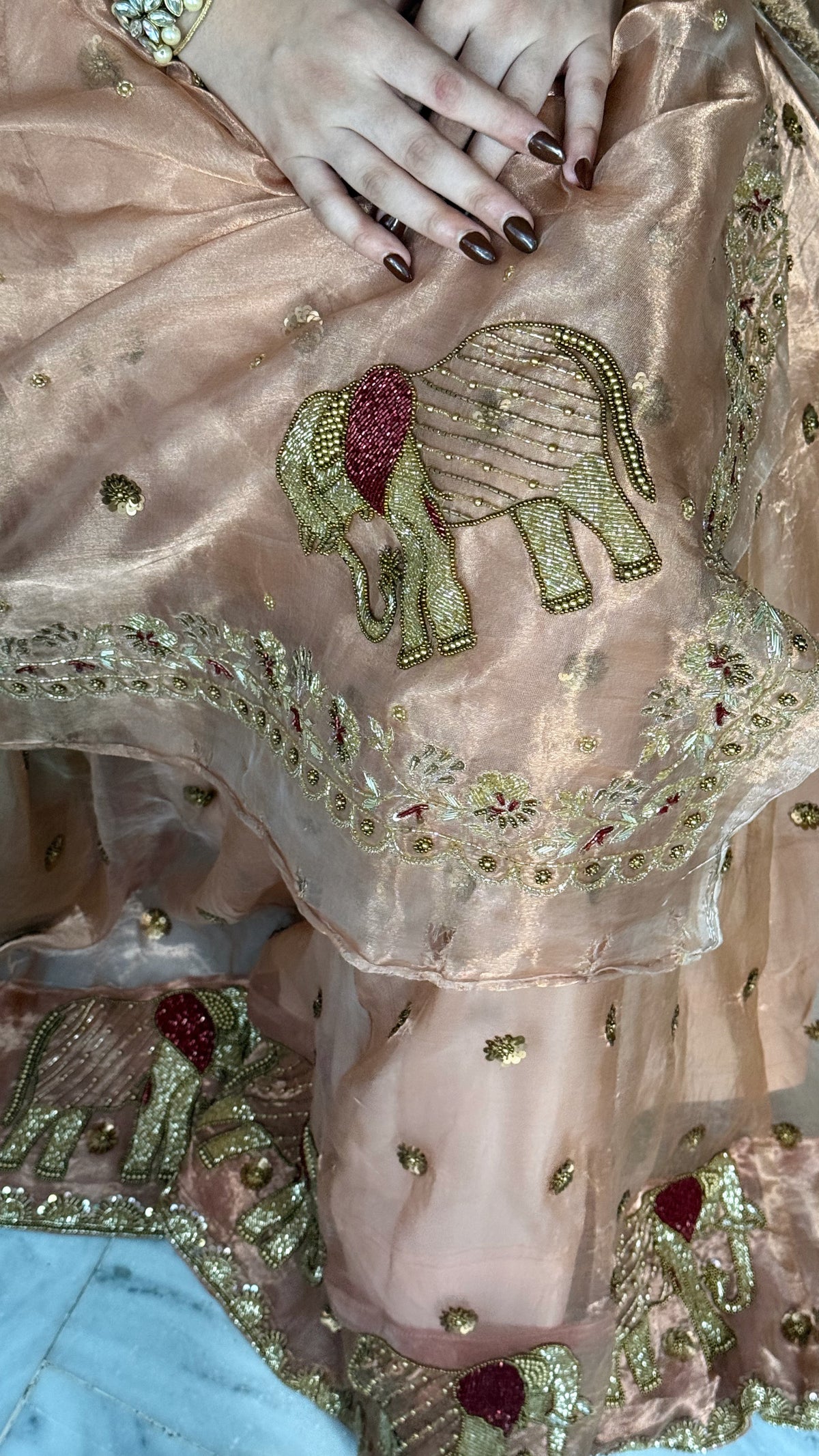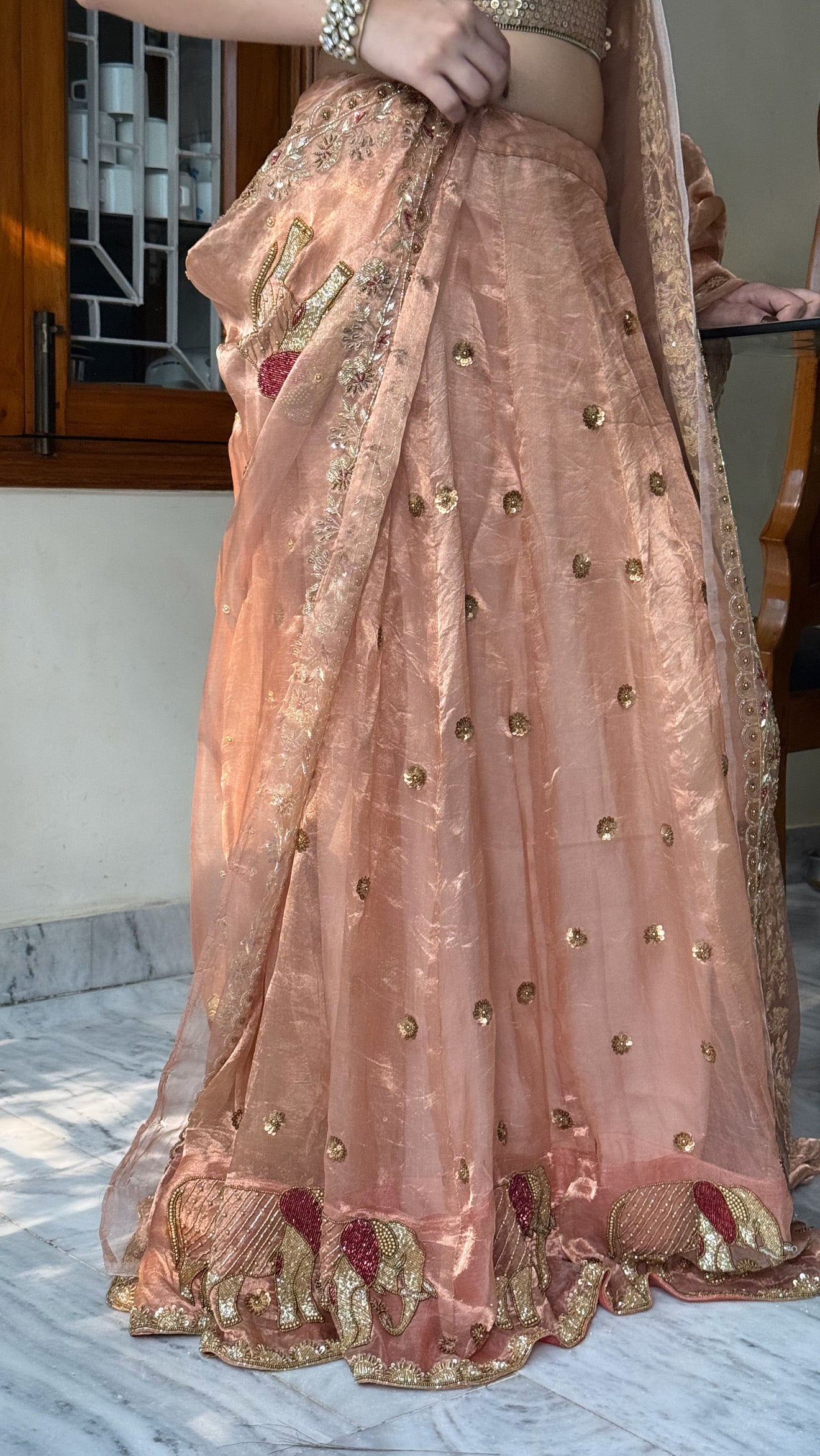 Gajgamini copper zari elephant motif hand embroidered tissue silk lehenga set