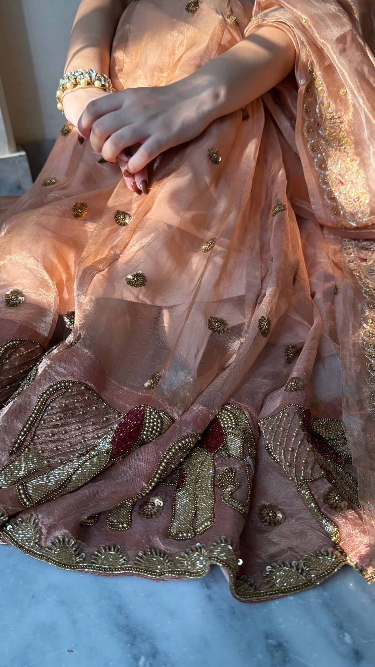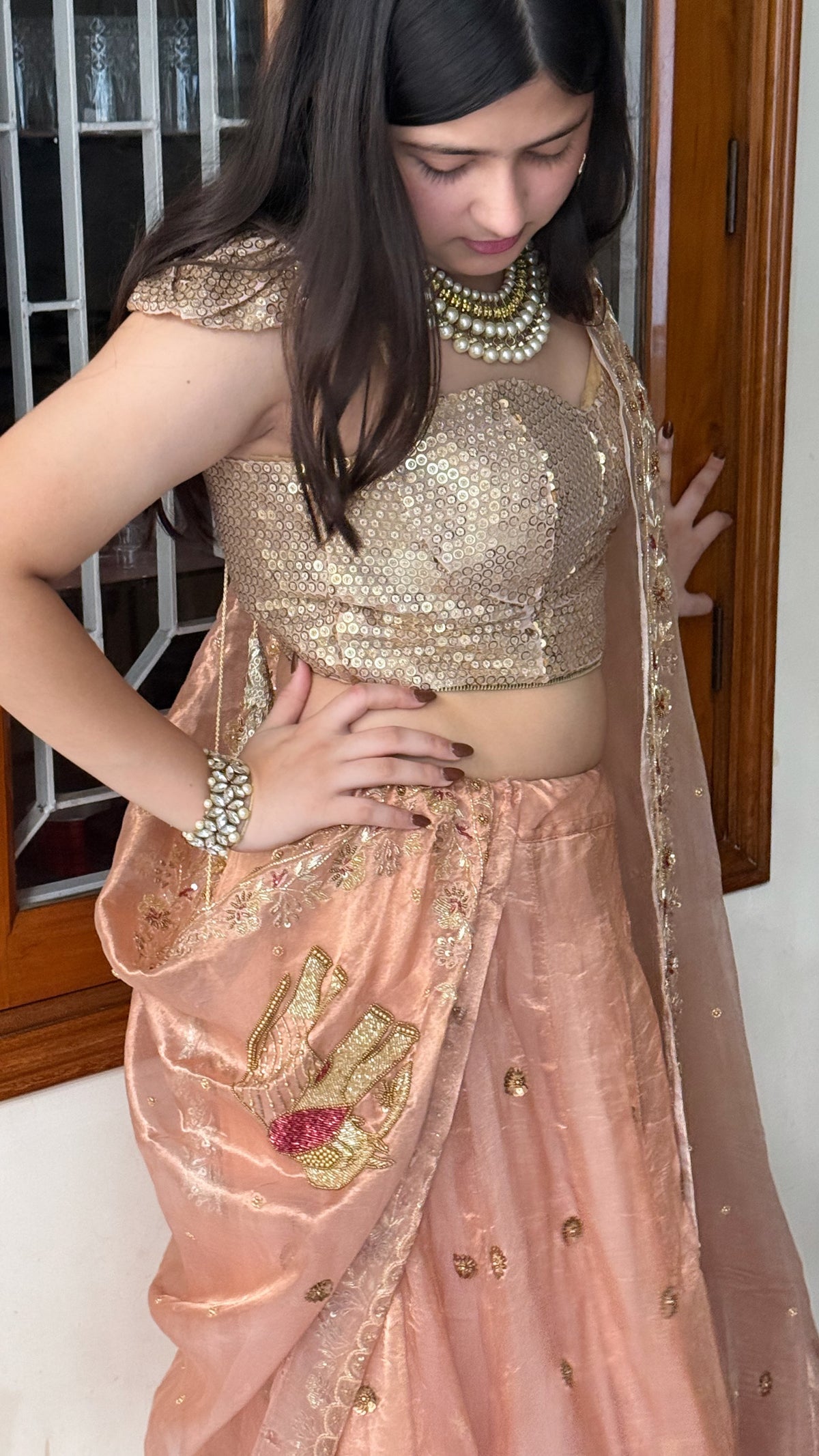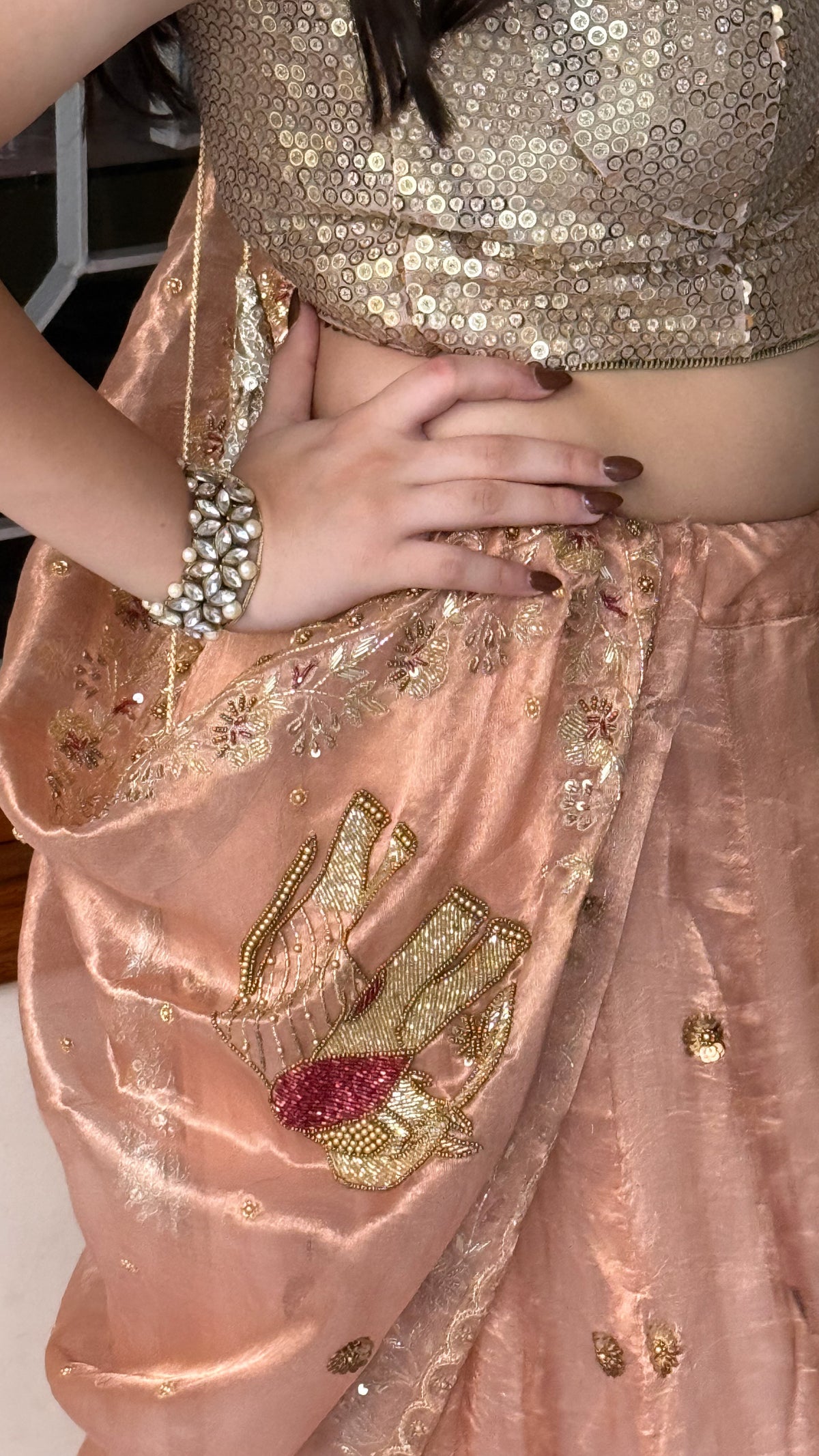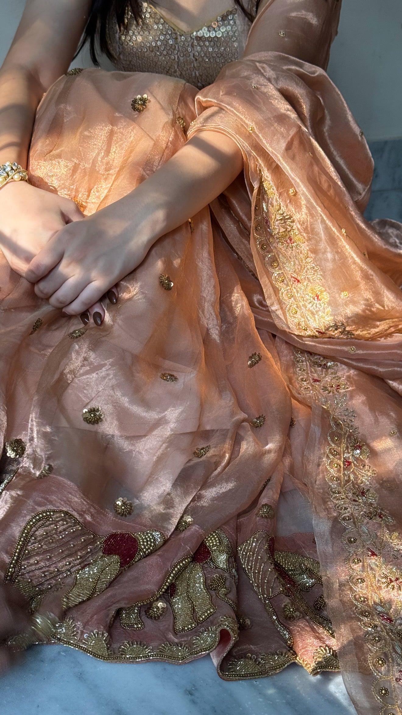 Gajgamini copper zari elephant motif hand embroidered tissue silk lehenga set