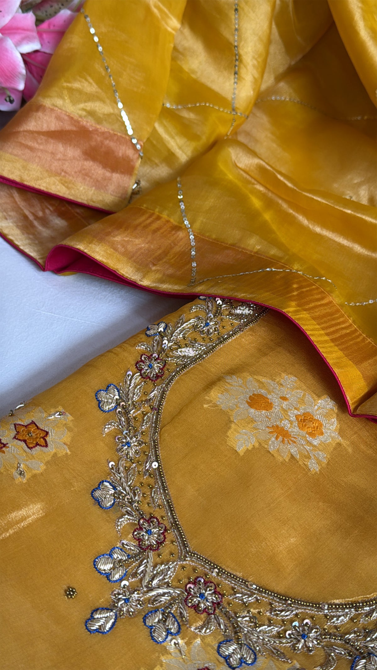 Haldi gold tissue silk hand embroidered heeramandi kadhwa suit set