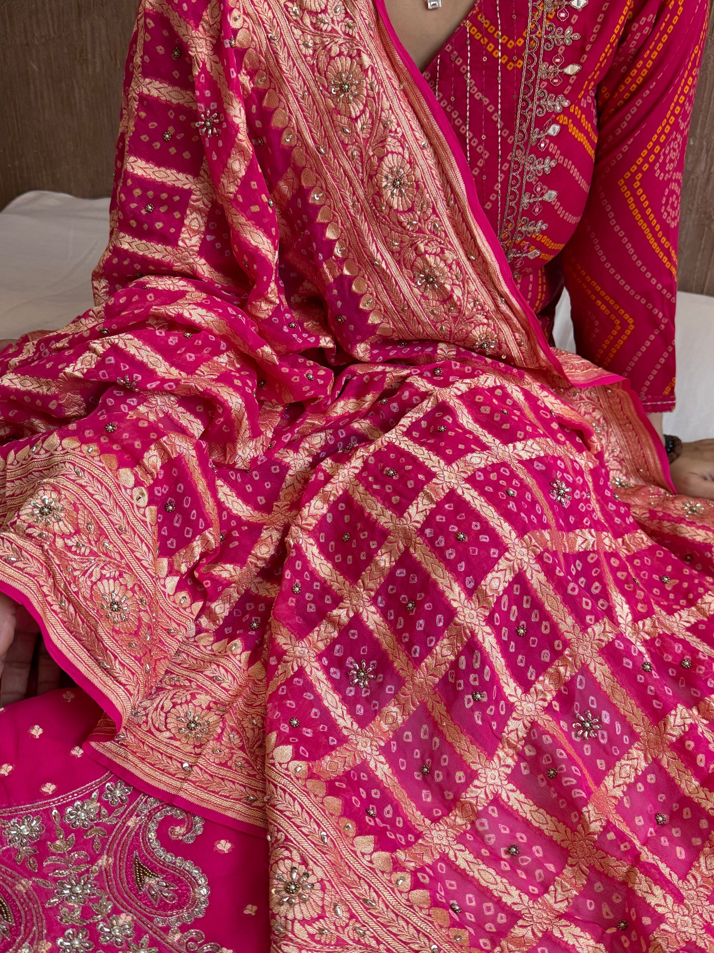 Hot fuschia pink rai bandhej Banarasi gorgette kadhwa hand embroidered suit set