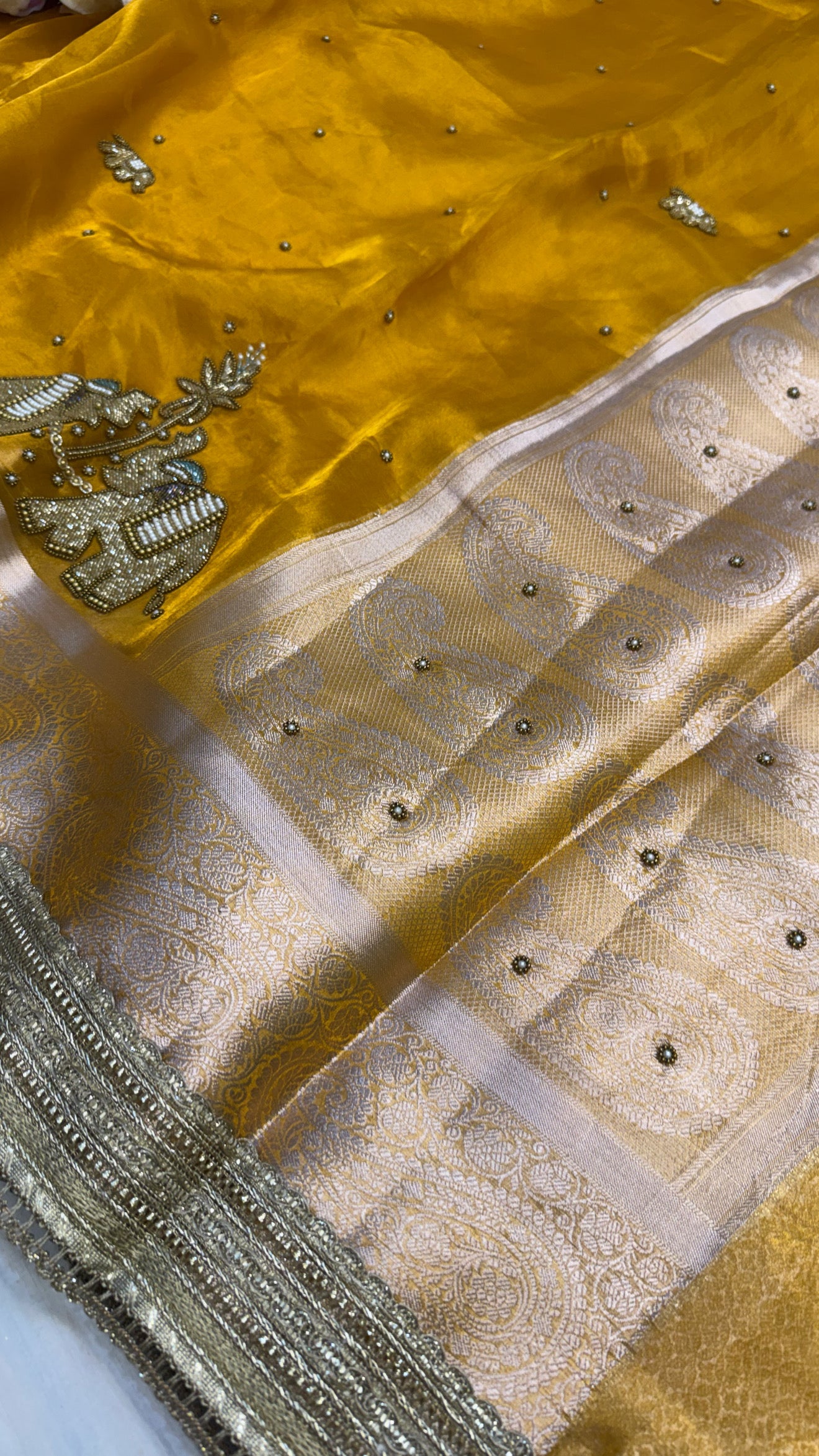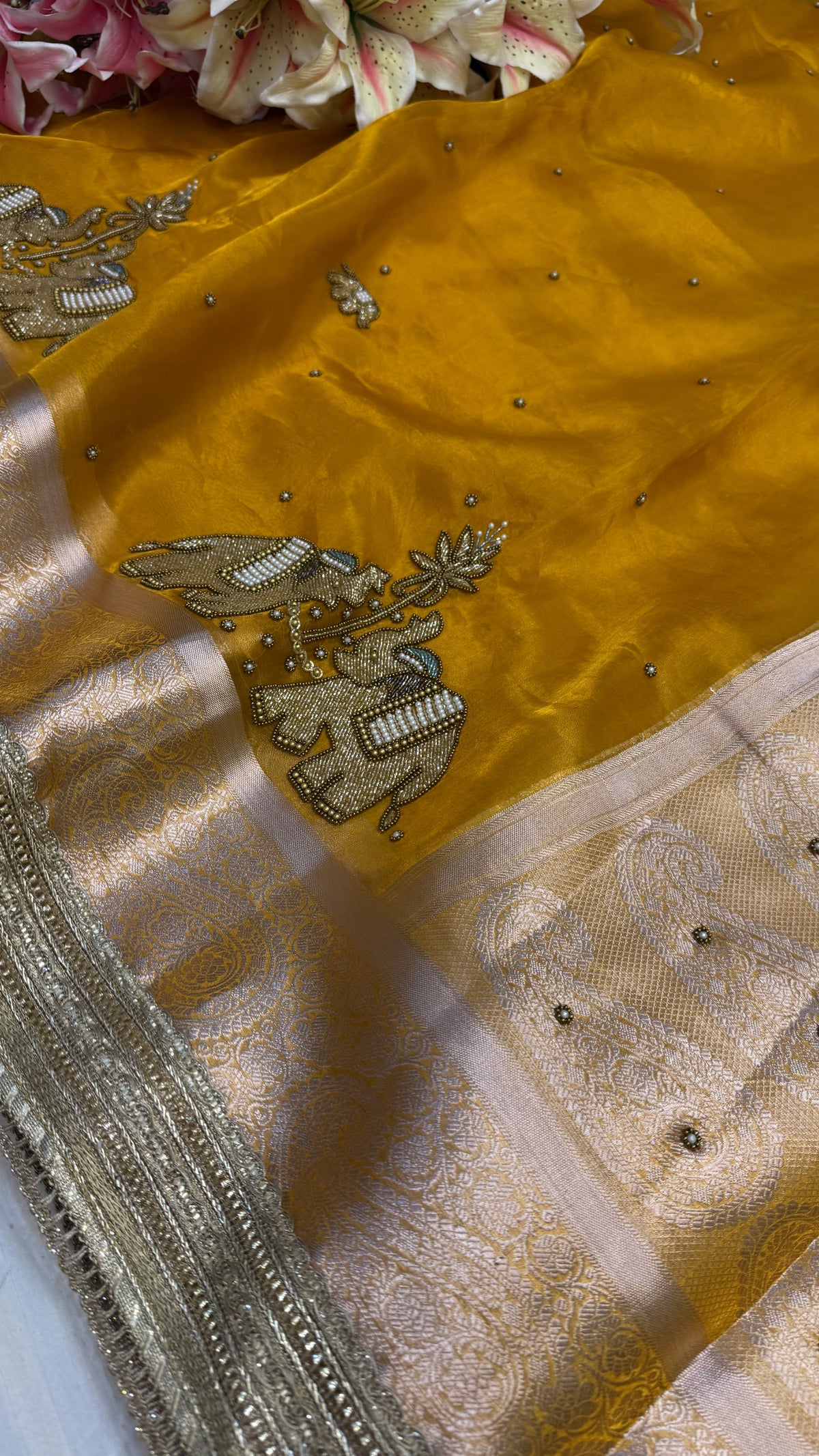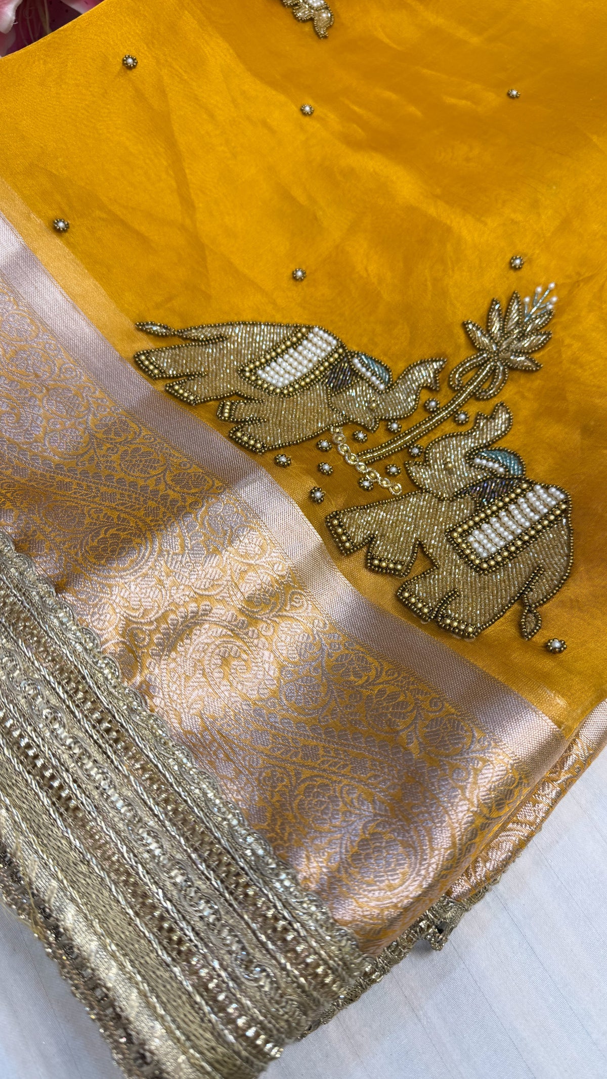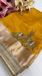 Husn tissue silk hand embroidered haldi yellow hathi wali saree