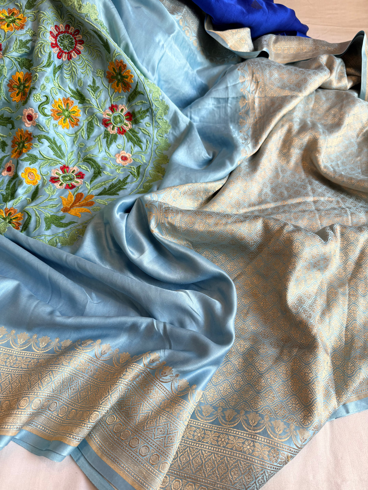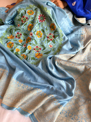 Ice blue banarasi mashru silk hand embroidered parsi gara work kadhwa saree