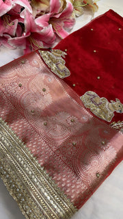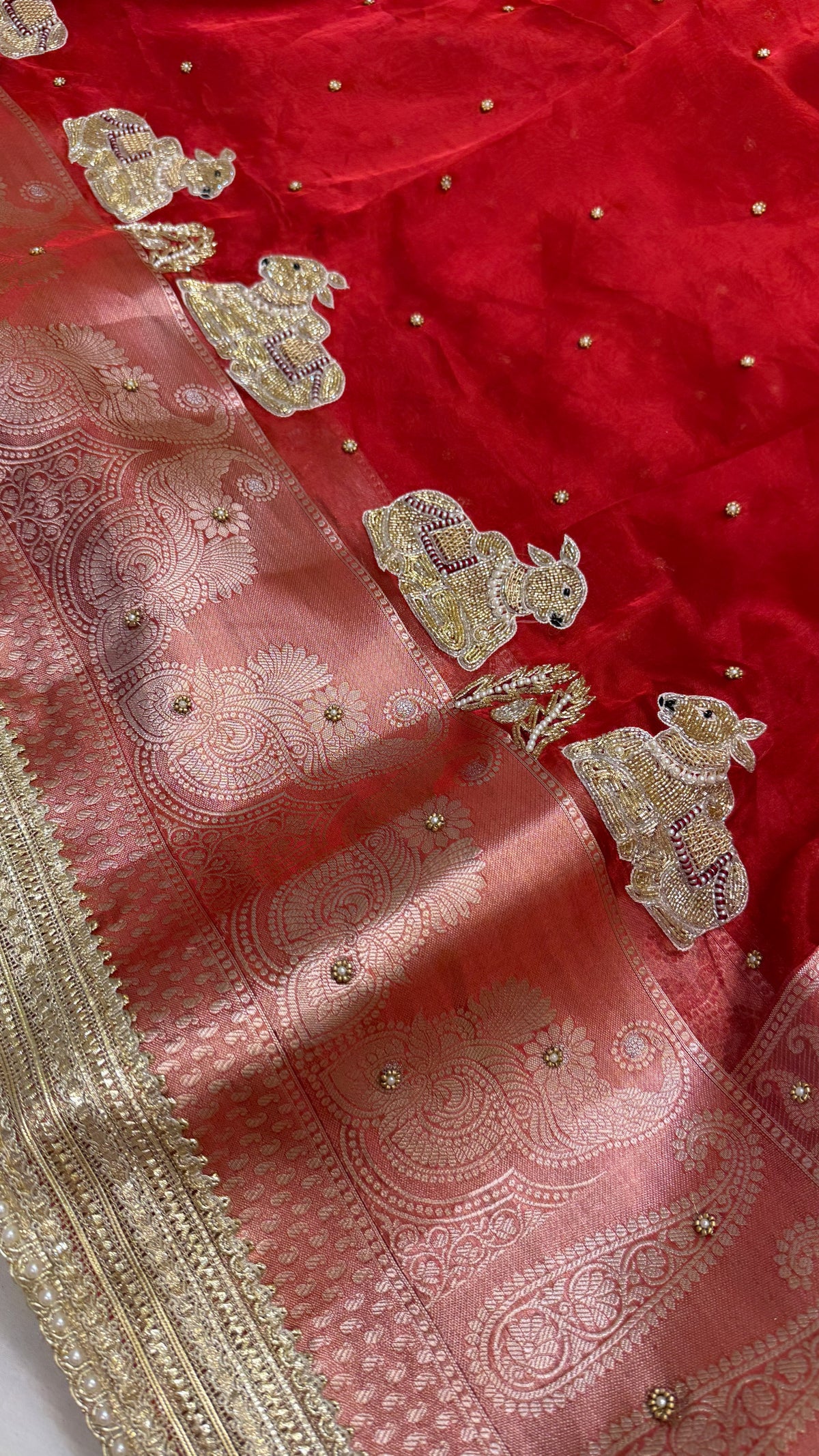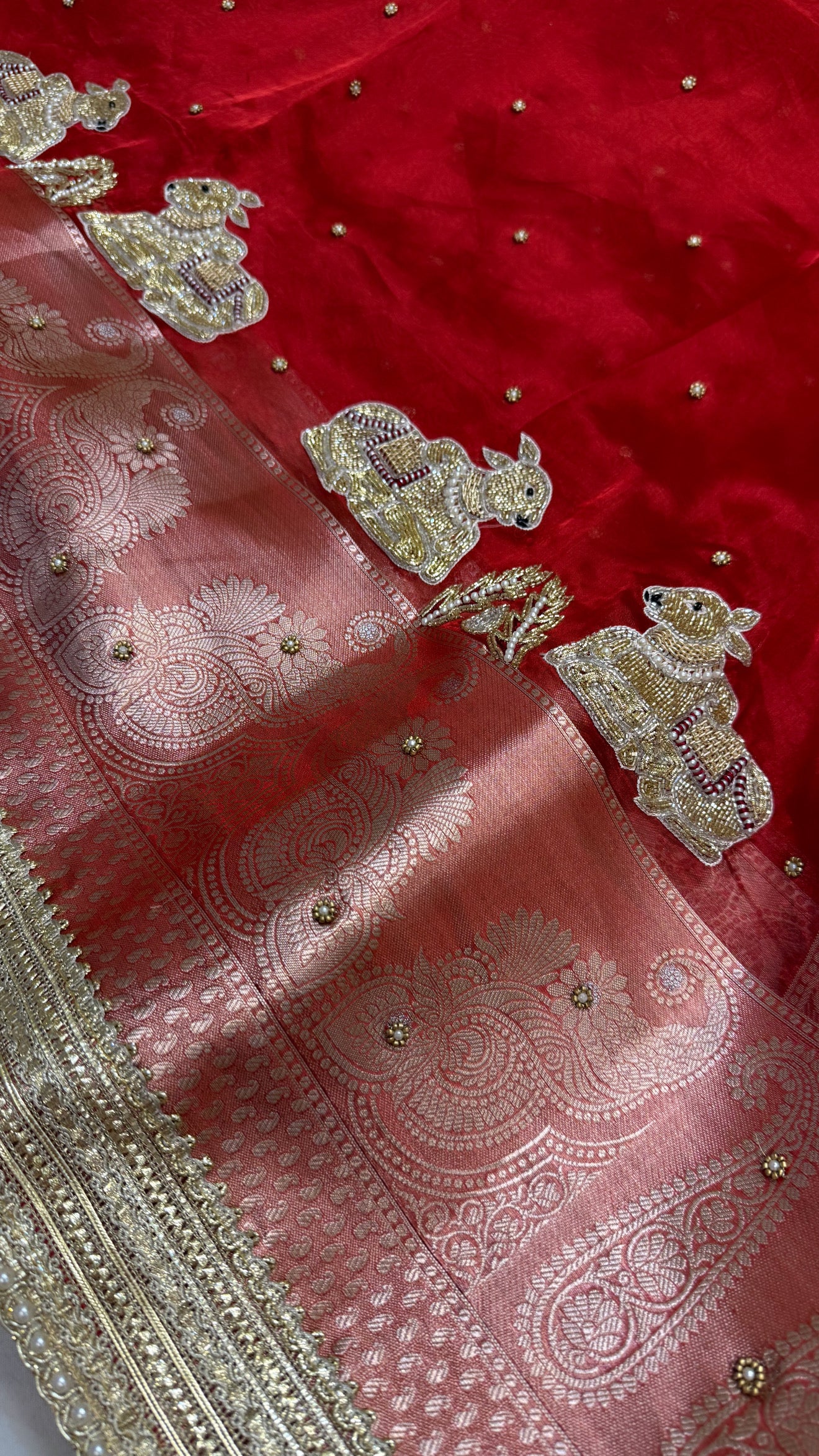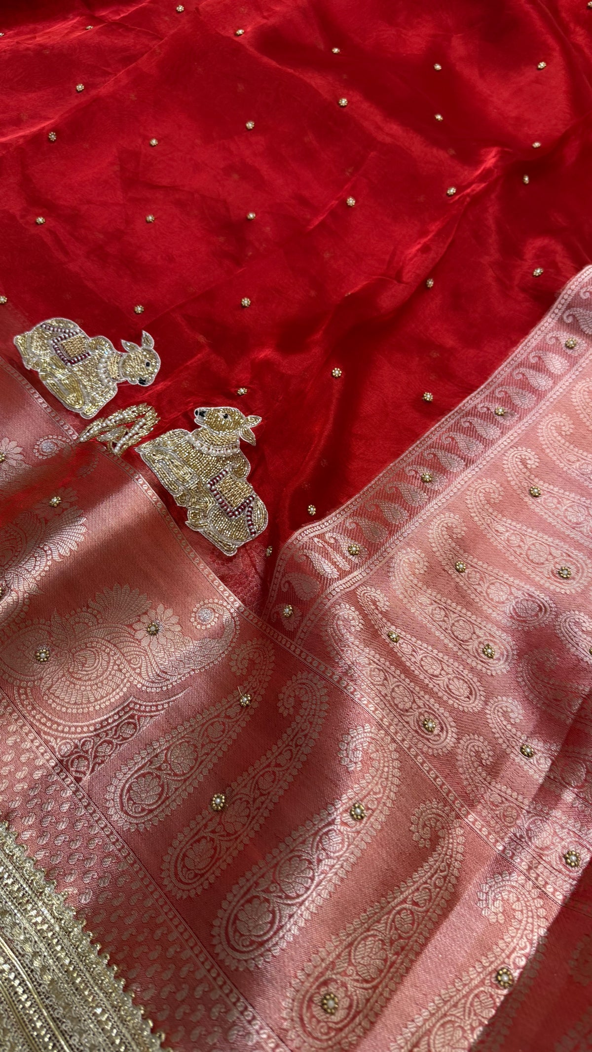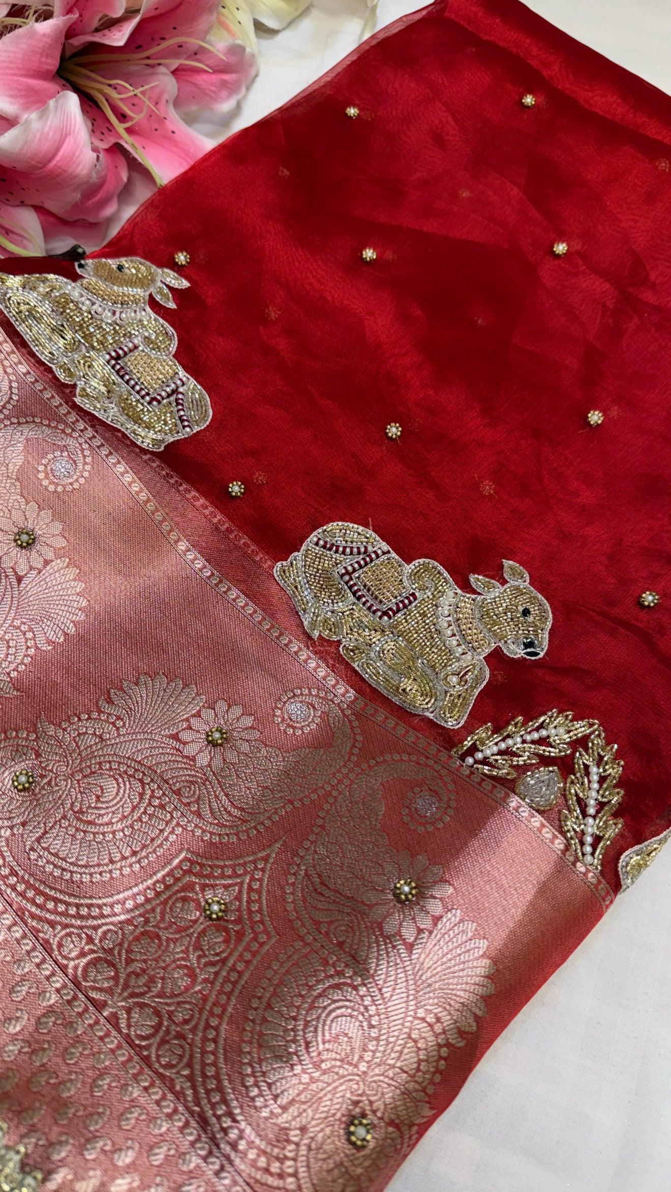 Karwachauth special - Blood red nandi motif tissue silk hand embroidered saree