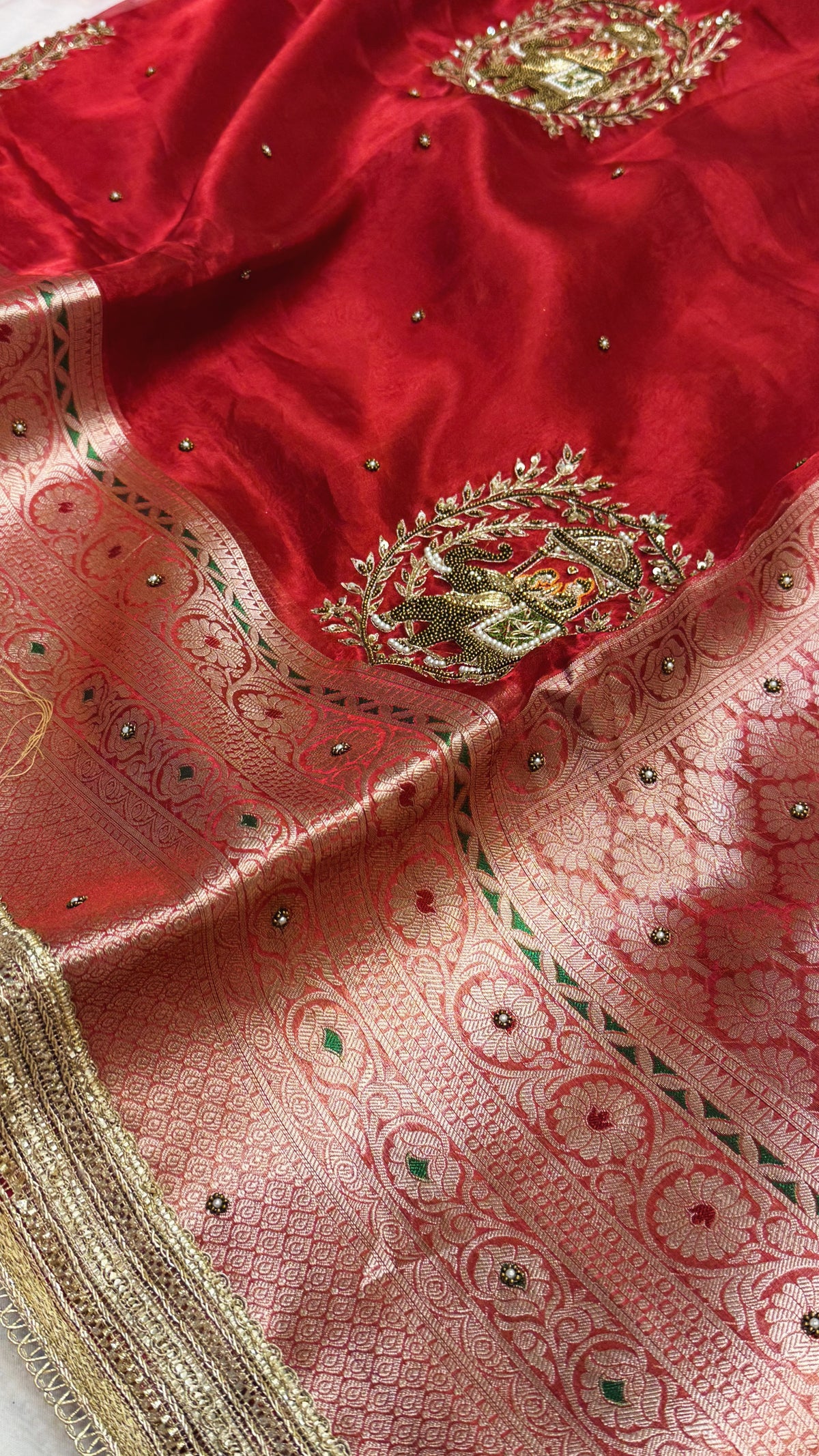 Karwachauth special - Blood red tissue silk baarat motif hand embroidered saree