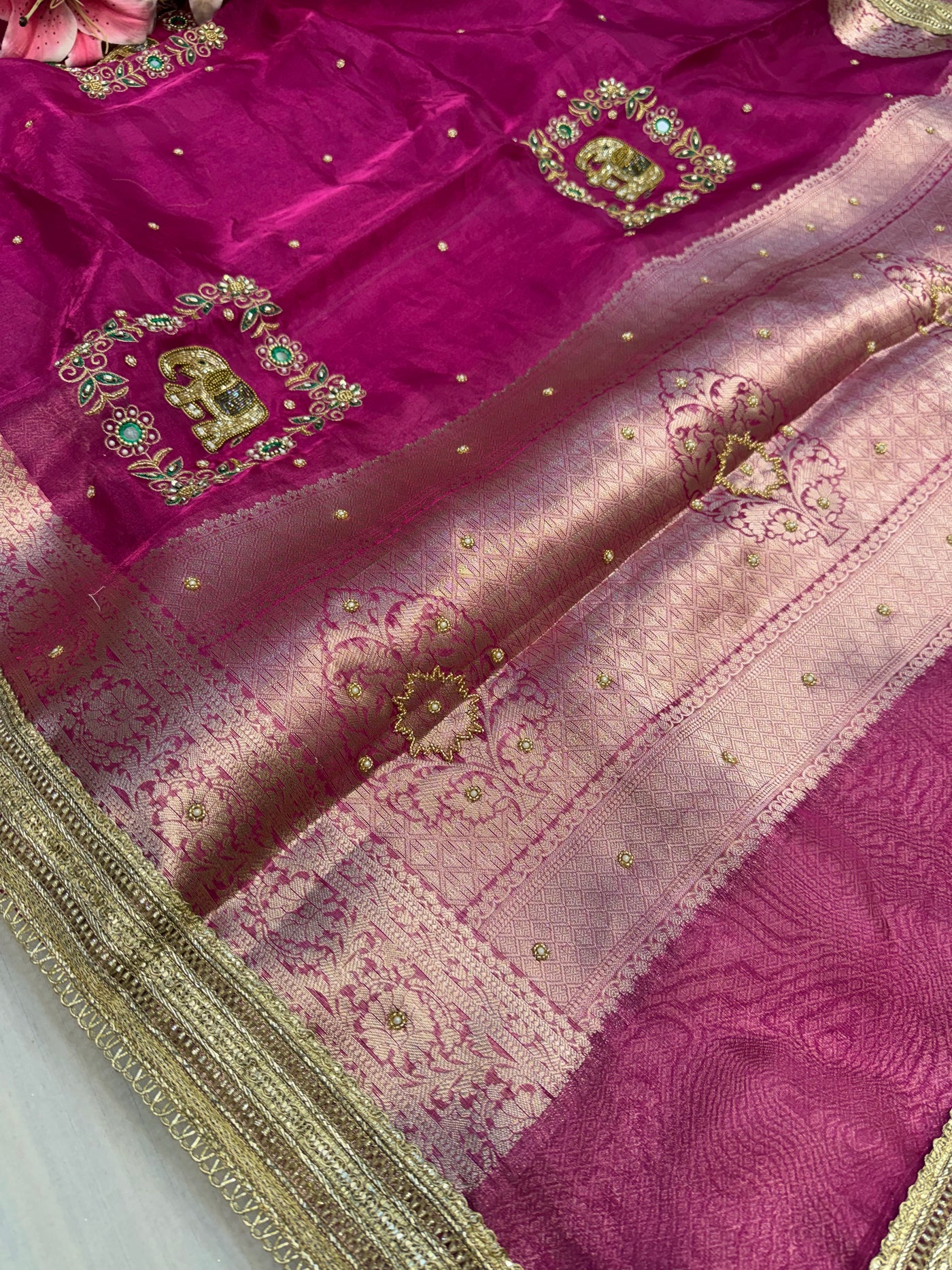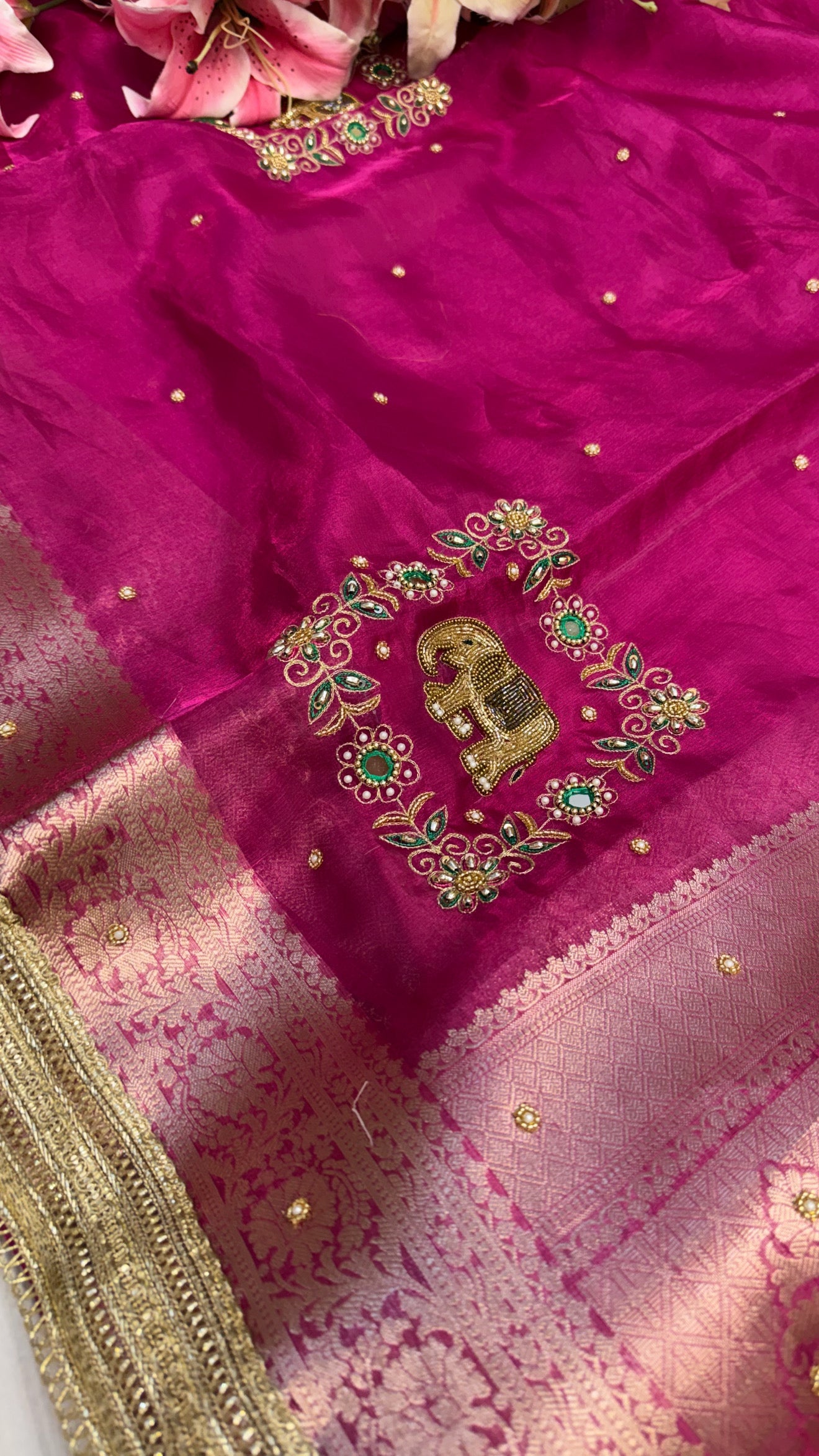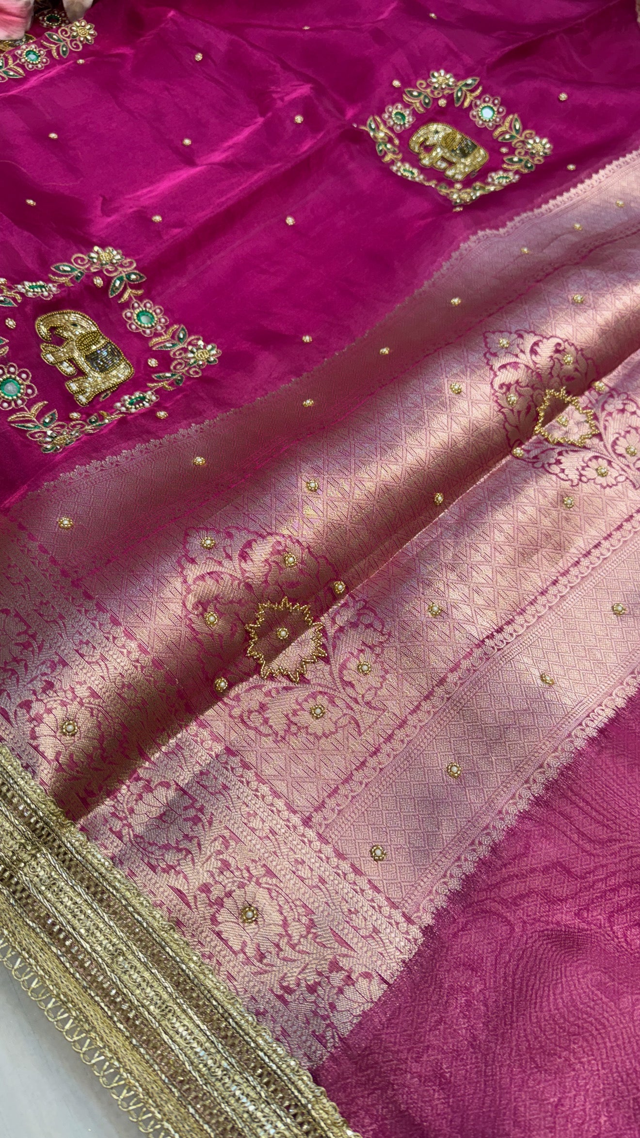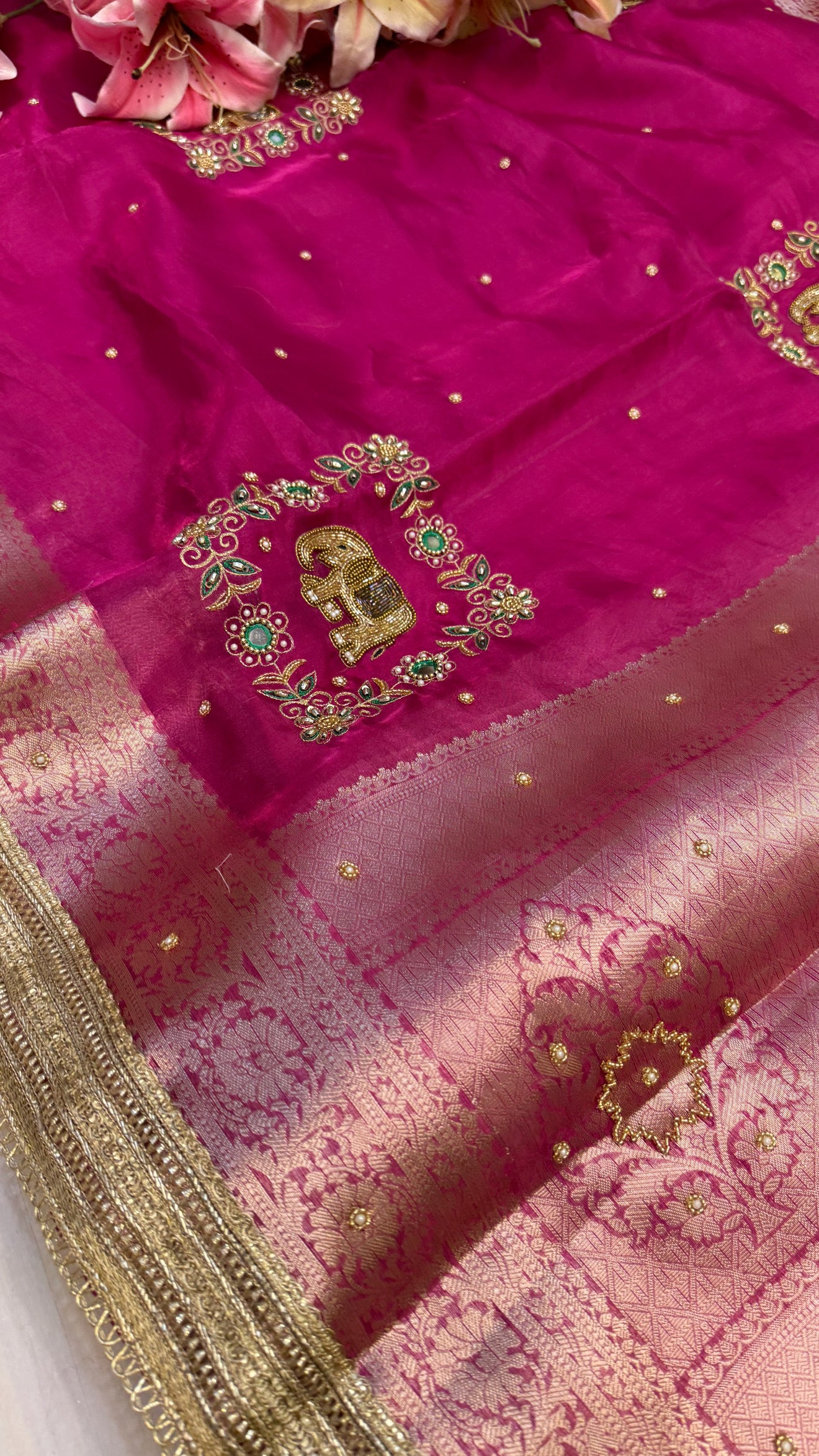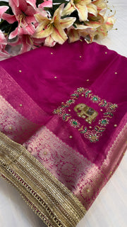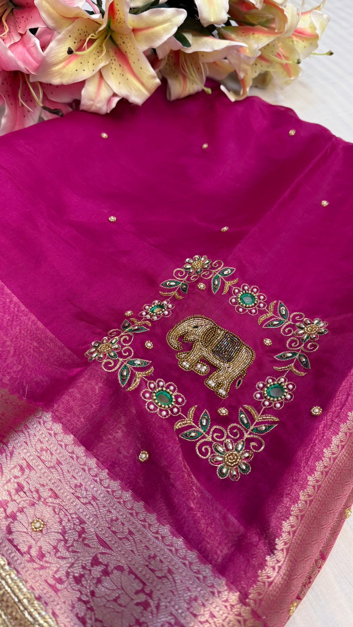 Karwachauth special - Hot metallic pink elephant motif hand embroidered tissue silk saree