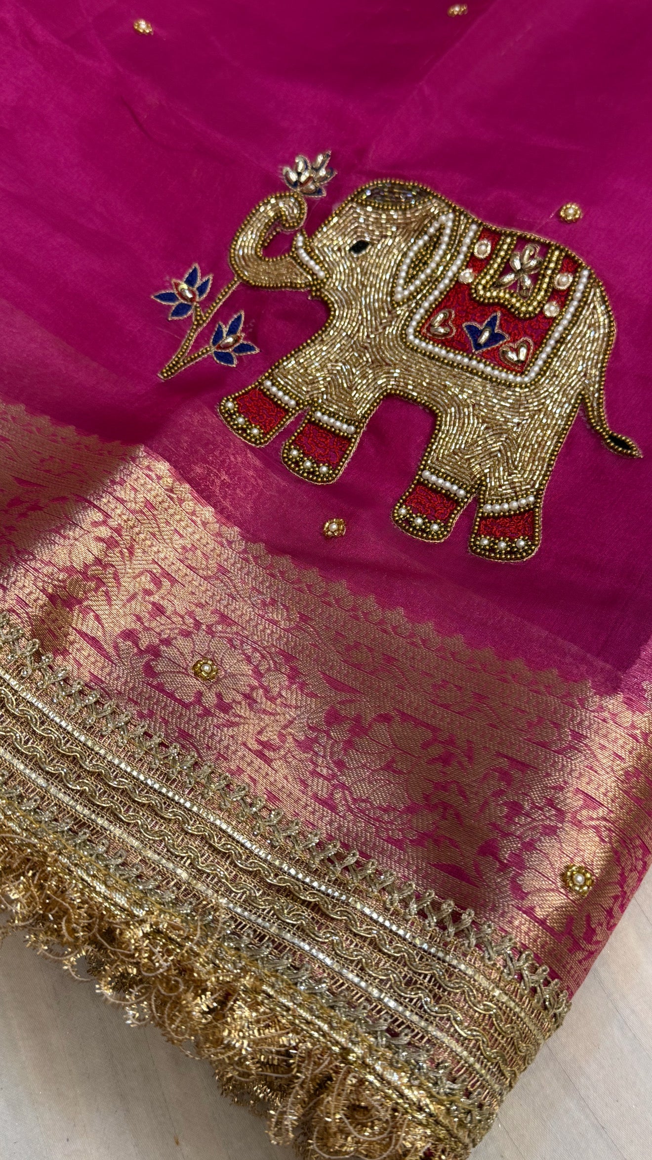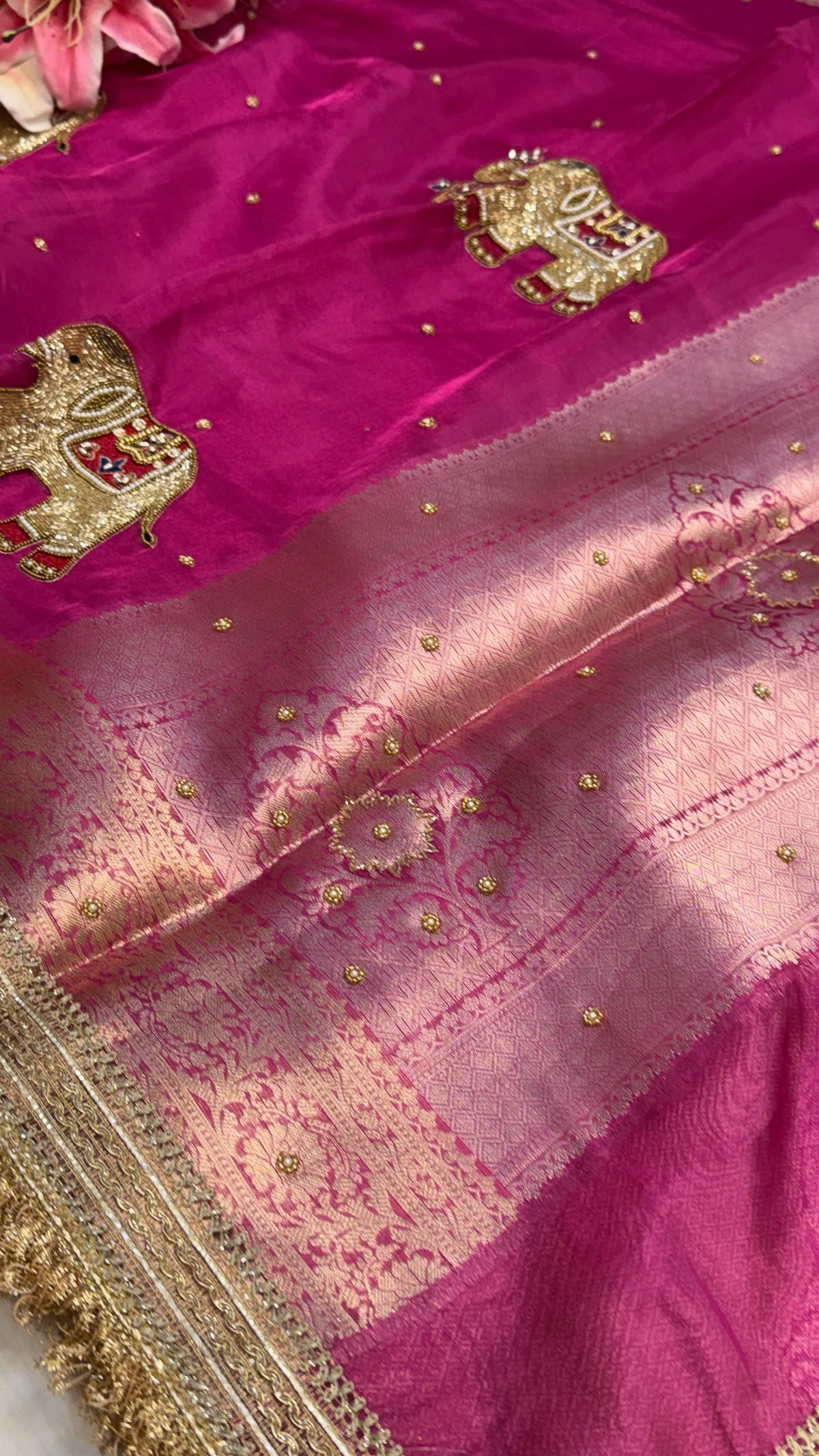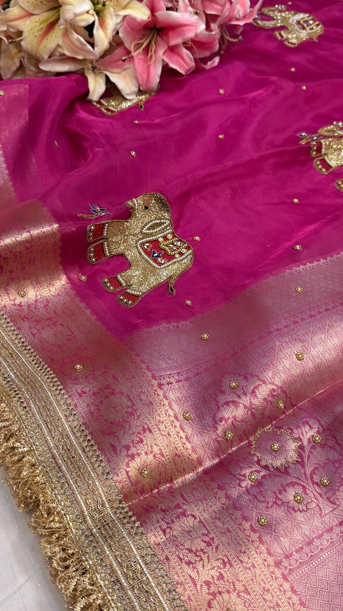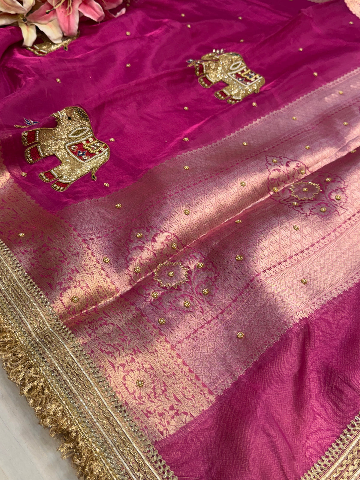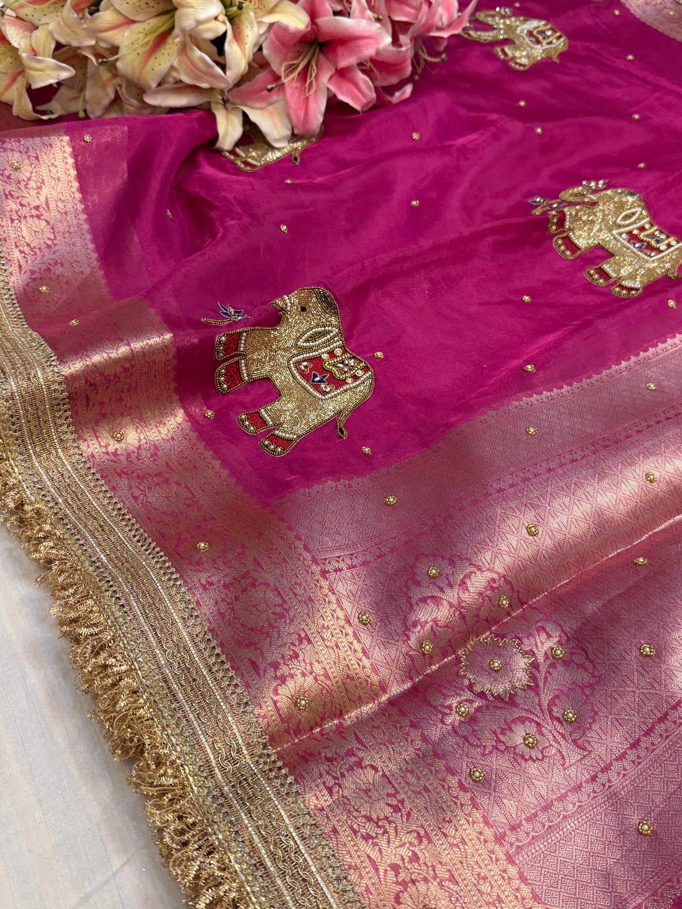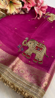 Karwachauth special - Hot metallic pink elephant motif hand embroidered tissue silk saree