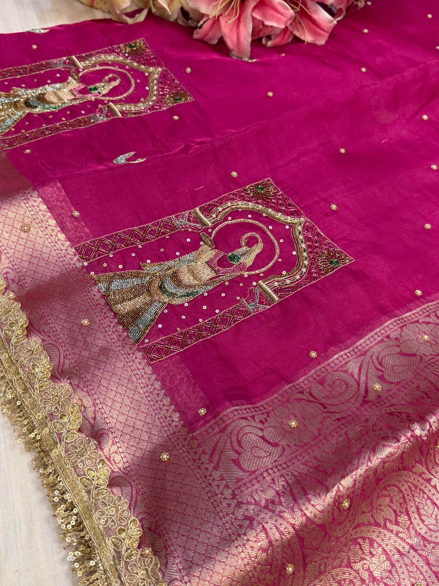Karwachauth special - Hot metallic pink tissue silk hand embroidered kadhwa saree